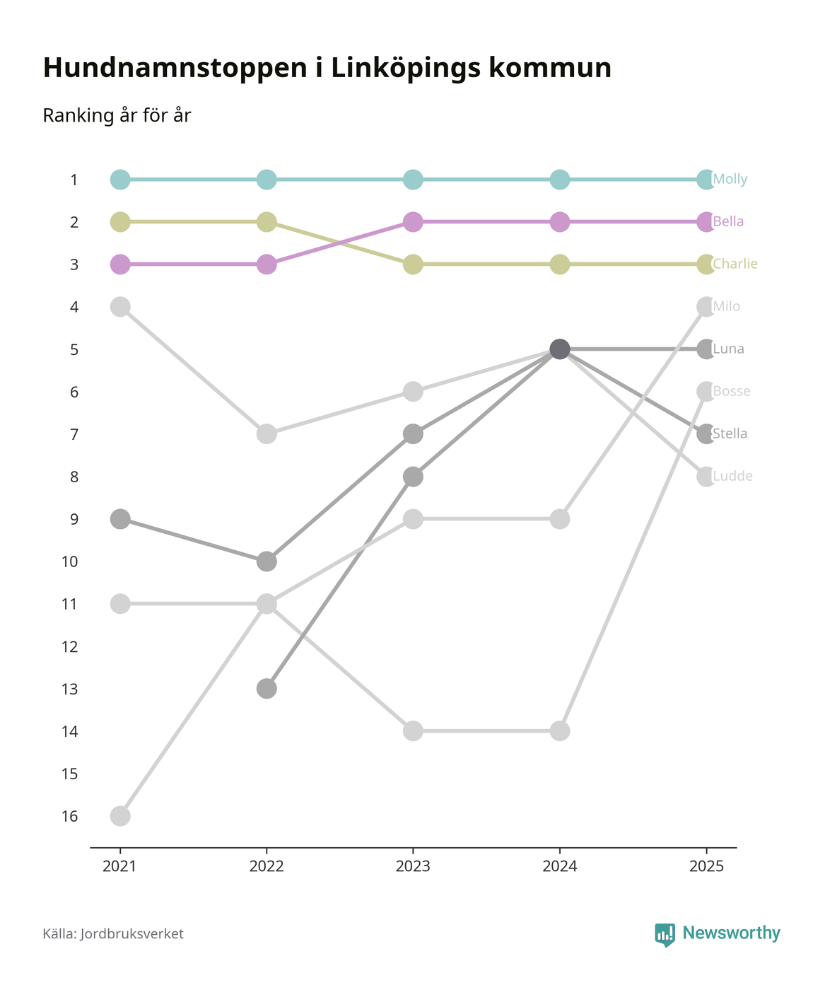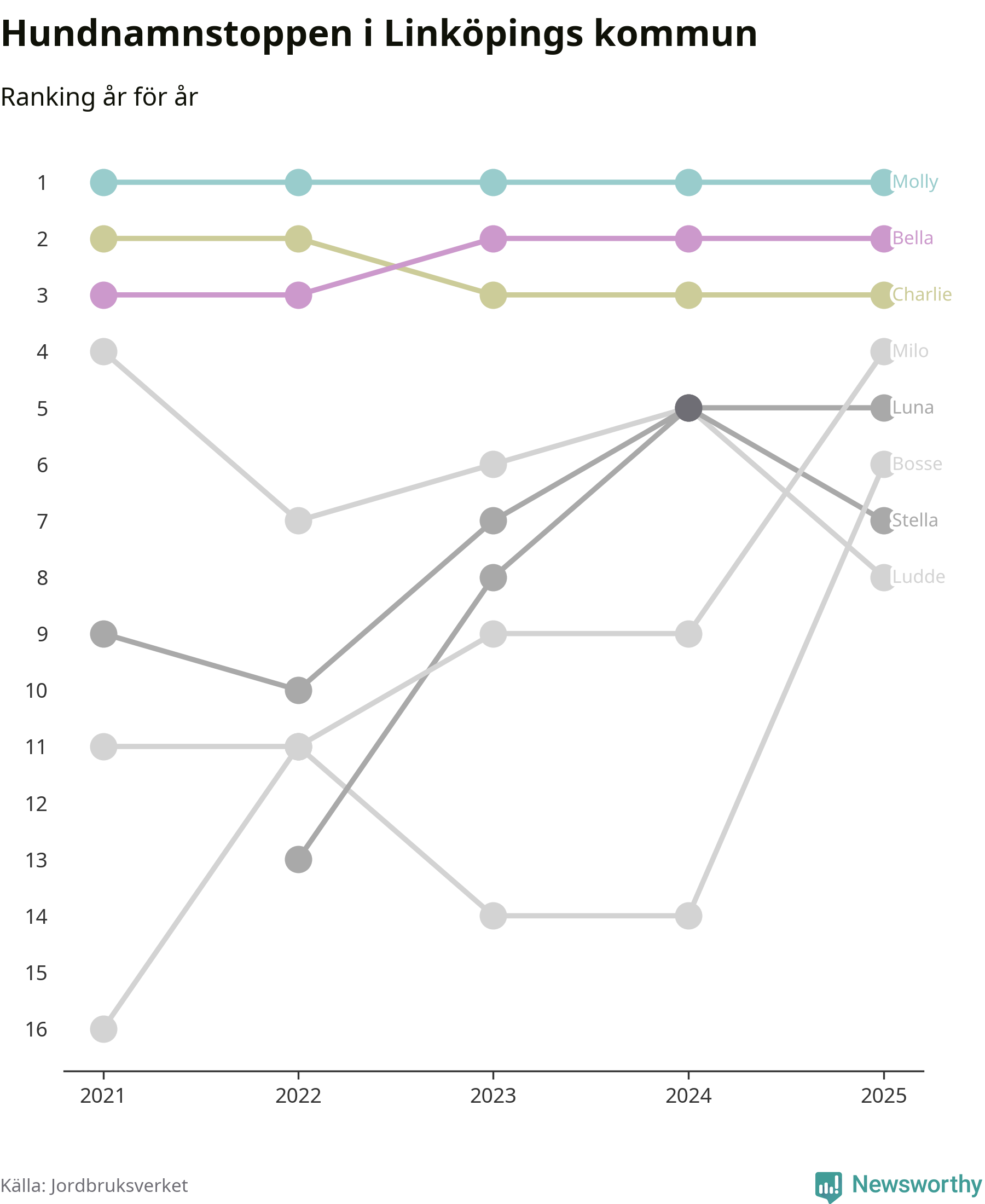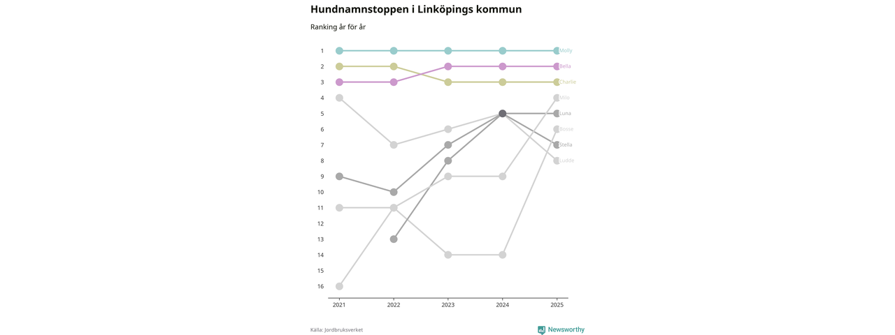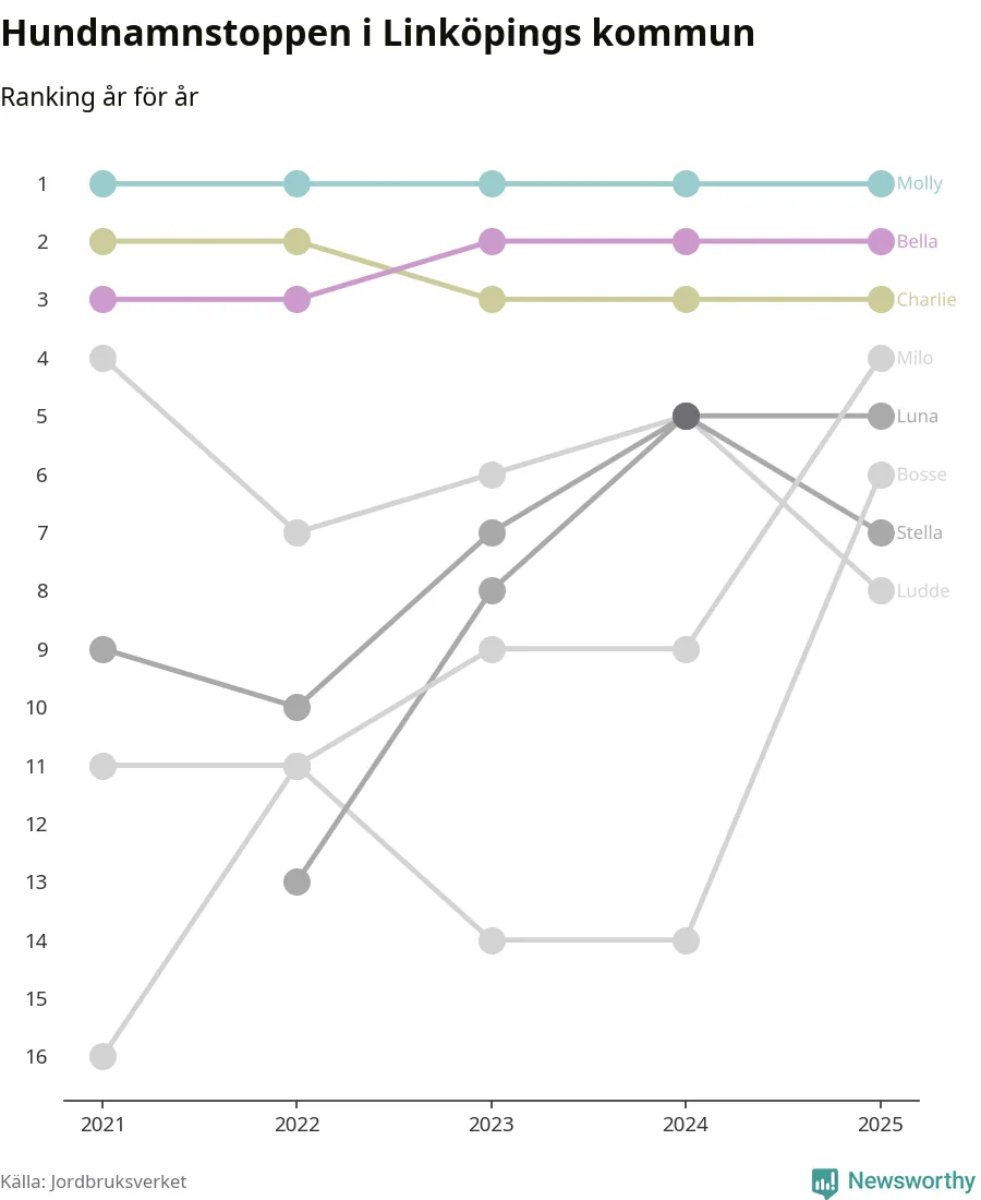 Molly är fortsatt ohotad etta bland hundnamnen i Sverige, följt av Bella och Charlie. Så har det sett ut flera år i rad, och även bland Linköpingshundarna ligger alltså Molly i topp.