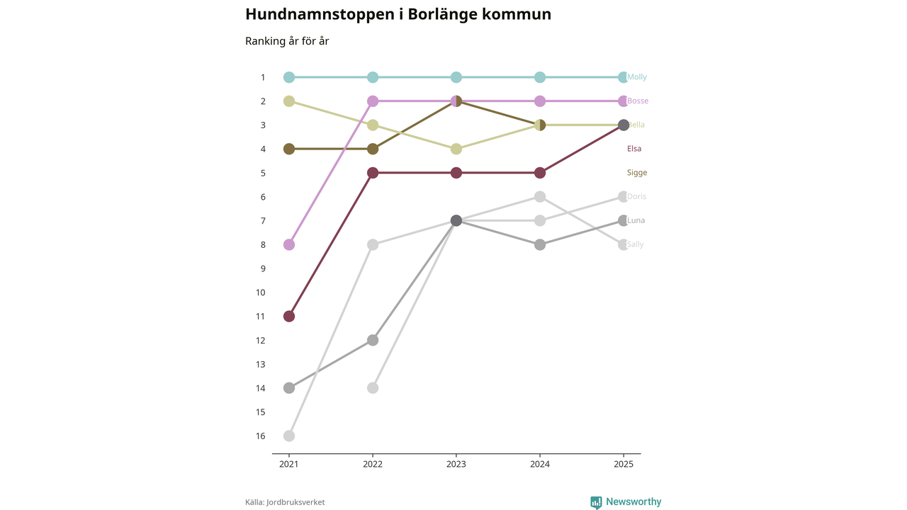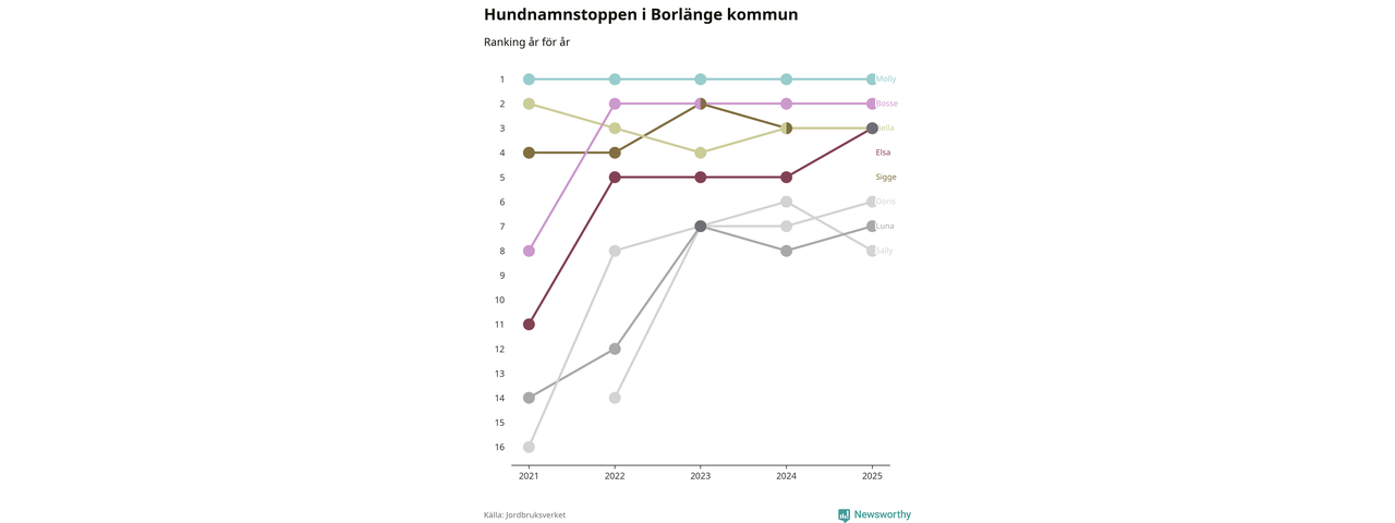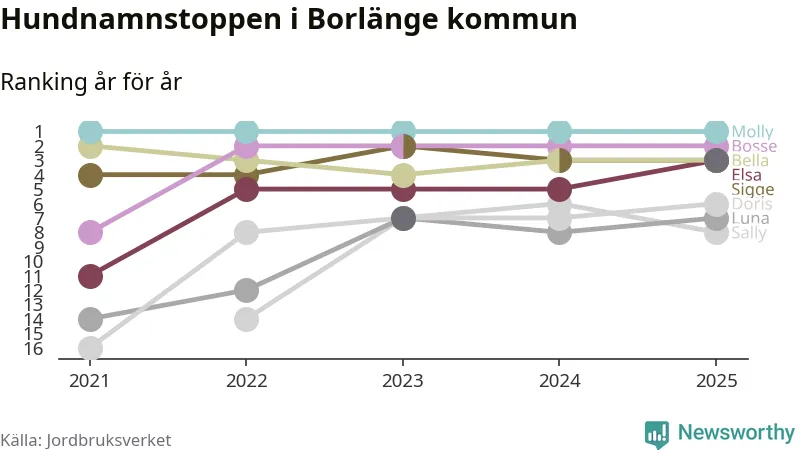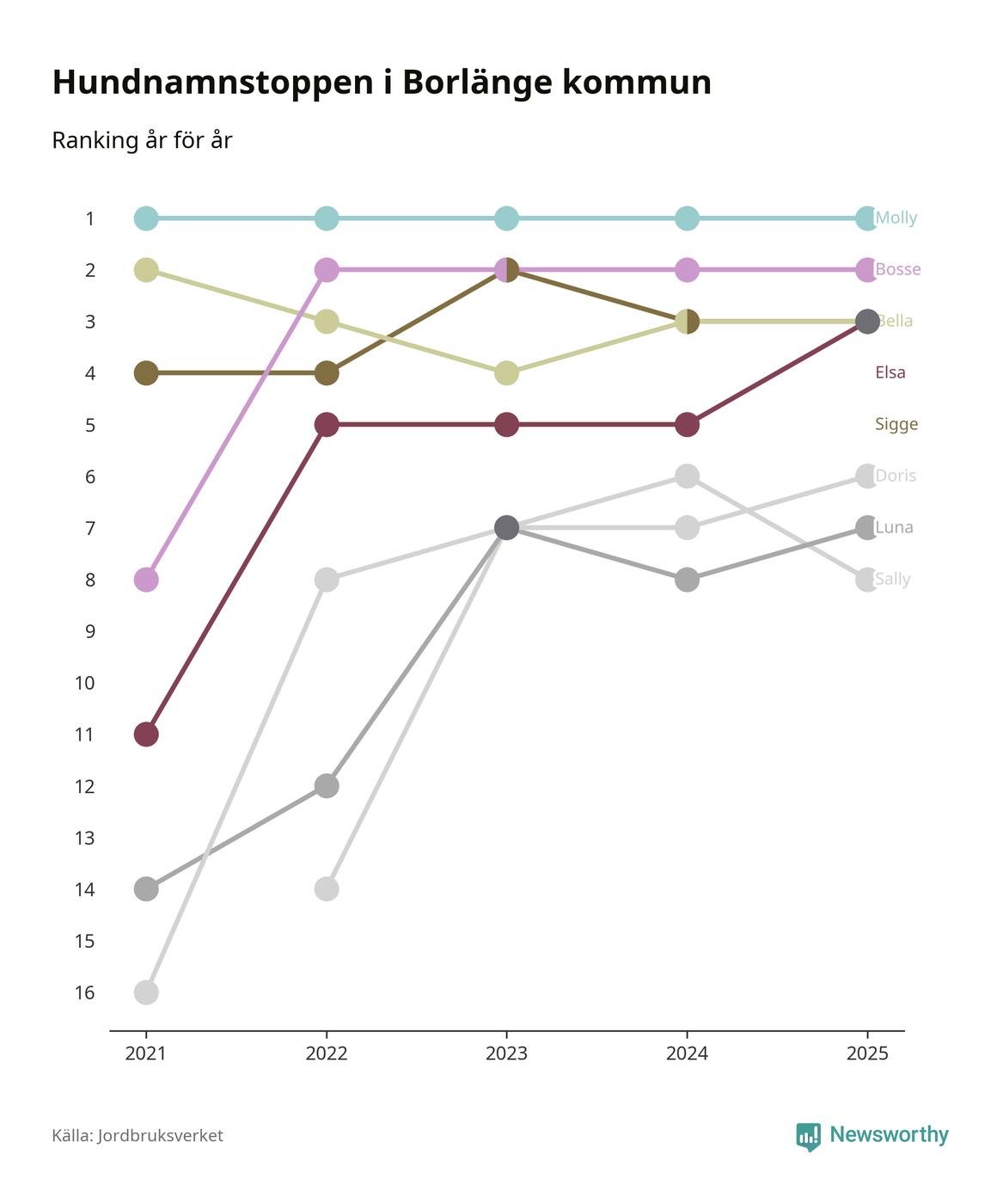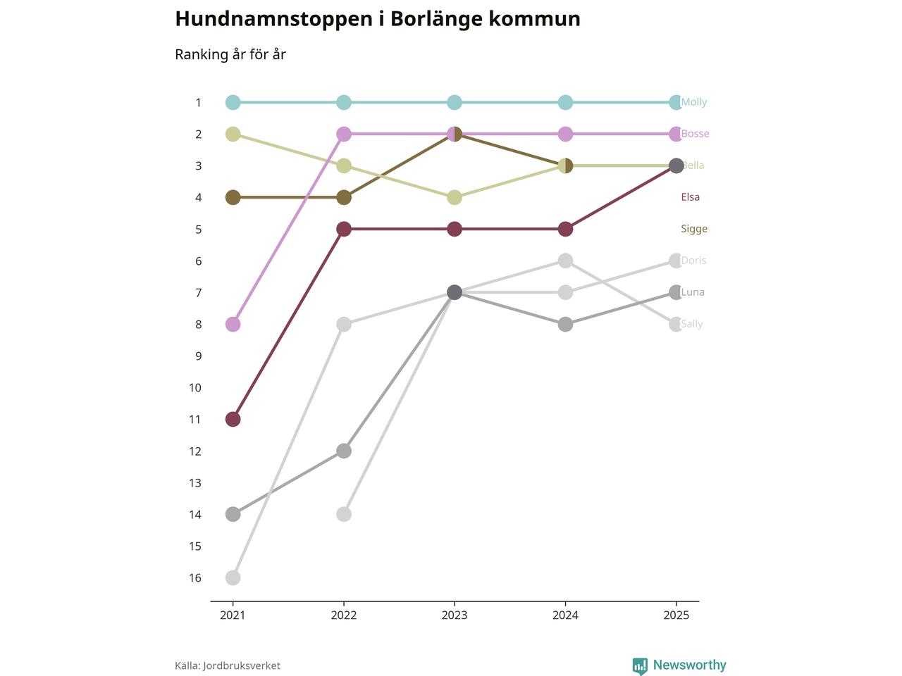 Molly toppar hundnamnsligan i Borlänge kommun, precis som i landet som helhet. Det visar färsk statistik från Jordbruksverket. Här finns hela topplistan för kommunen.