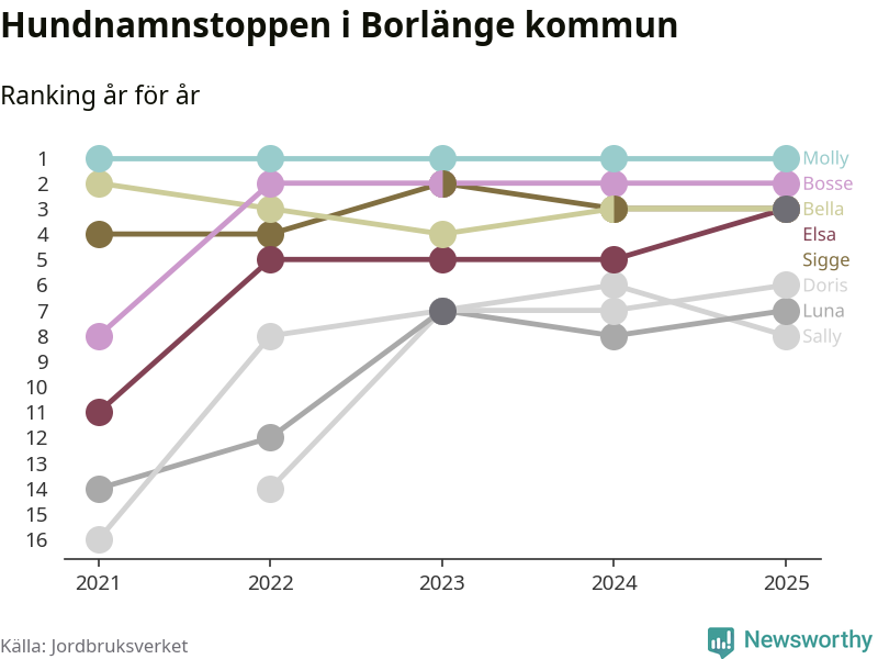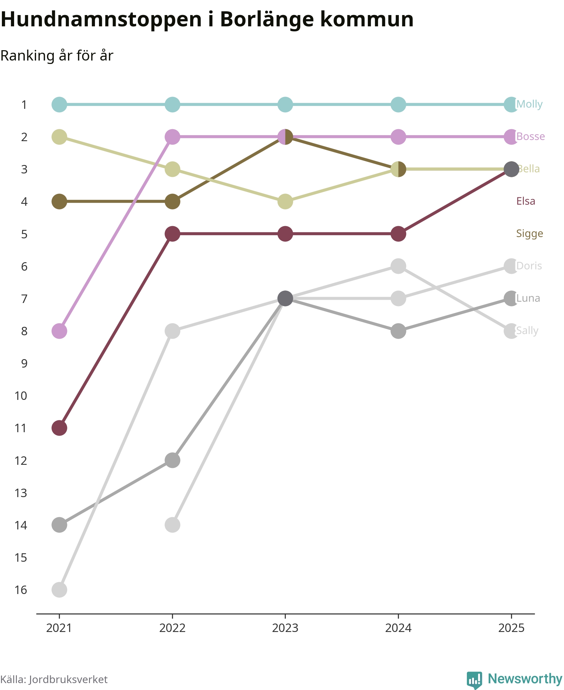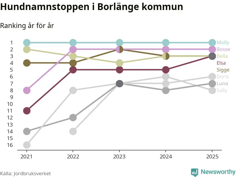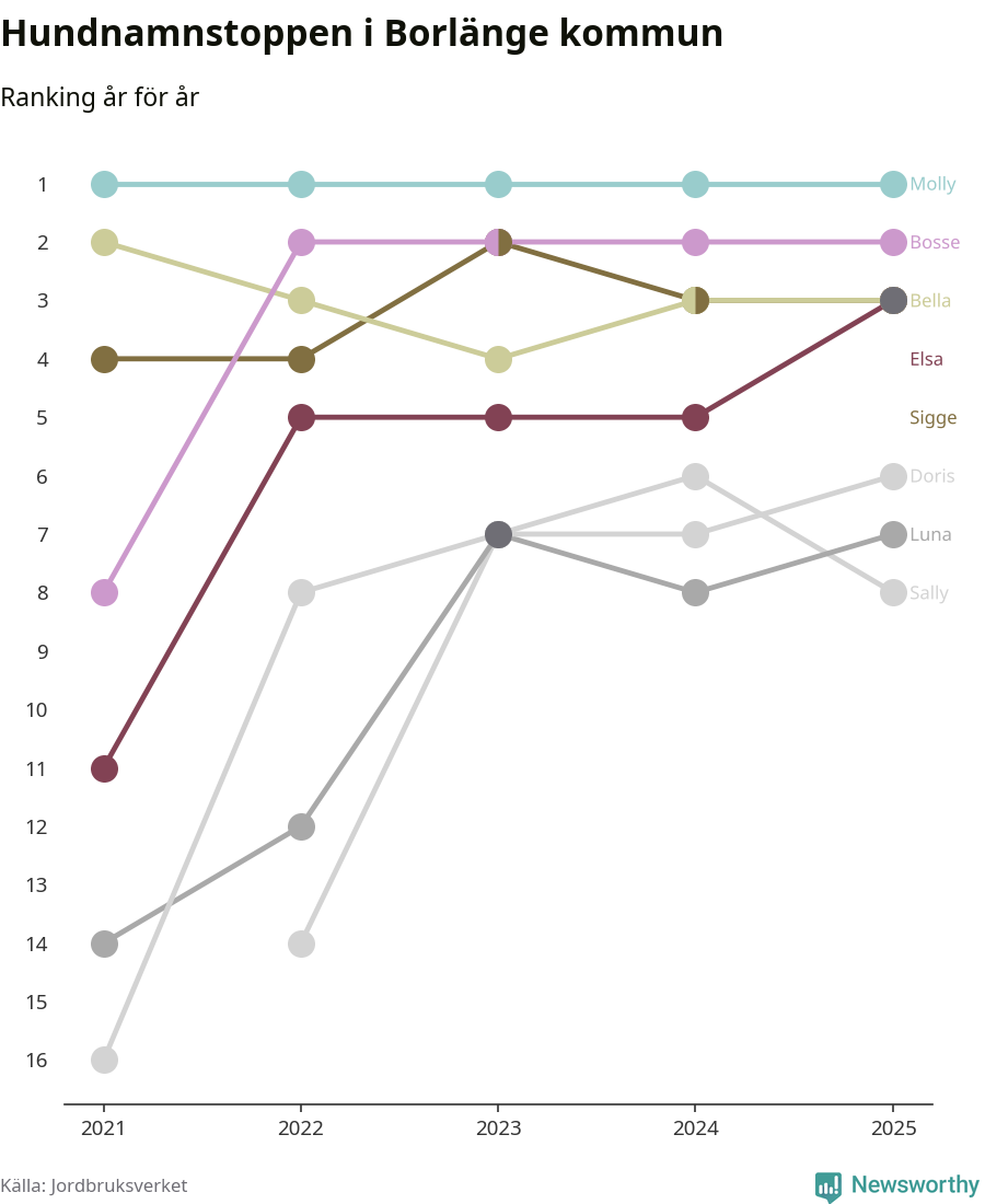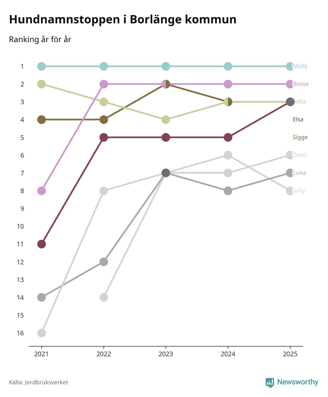 Molly toppar hundnamnsligan i Borlänge kommun, precis som i landet som helhet. Det visar färsk statistik från Jordbruksverket. Här finns hela topplistan för kommunen.