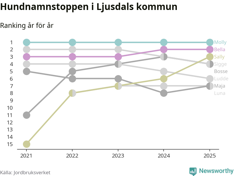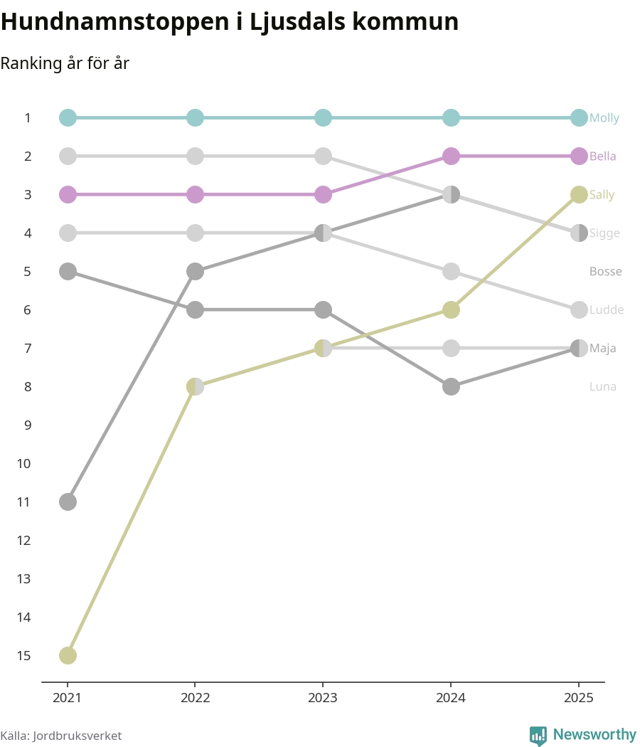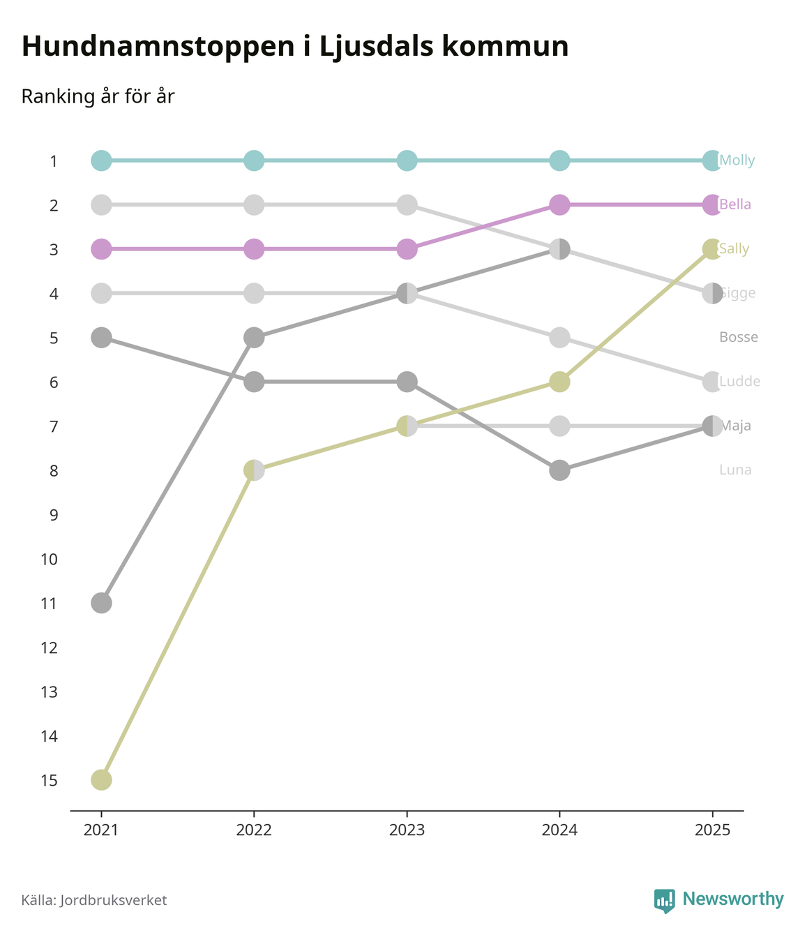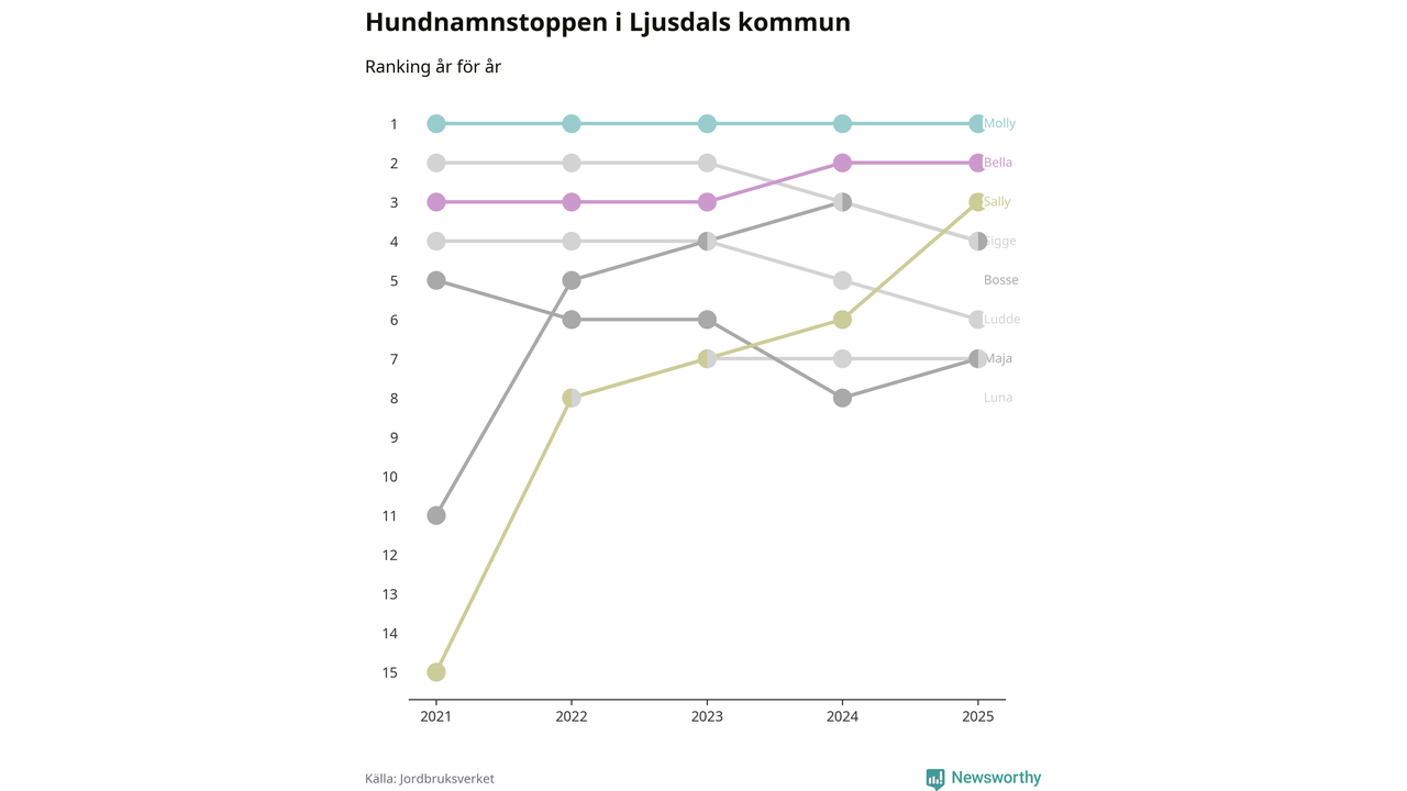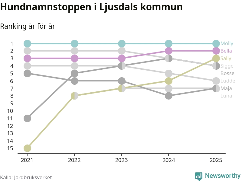 Molly toppar hundnamnsligan i Ljusdals kommun, precis som i landet som helhet. Det visar färsk statistik från Jordbruksverket. Här finns hela topplistan för kommunen.