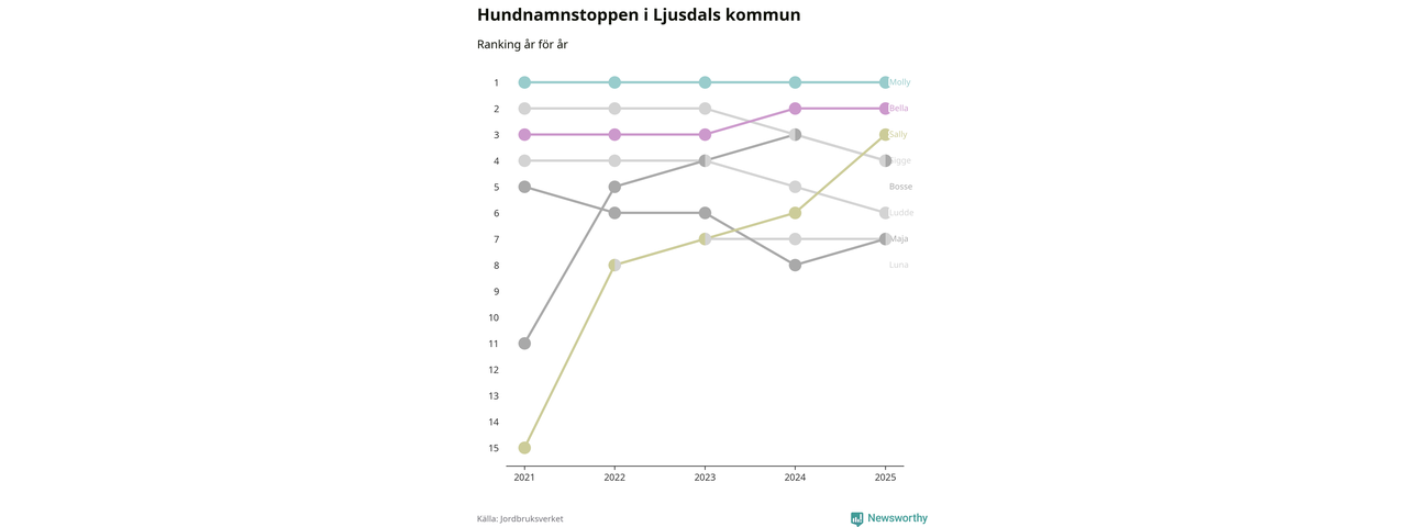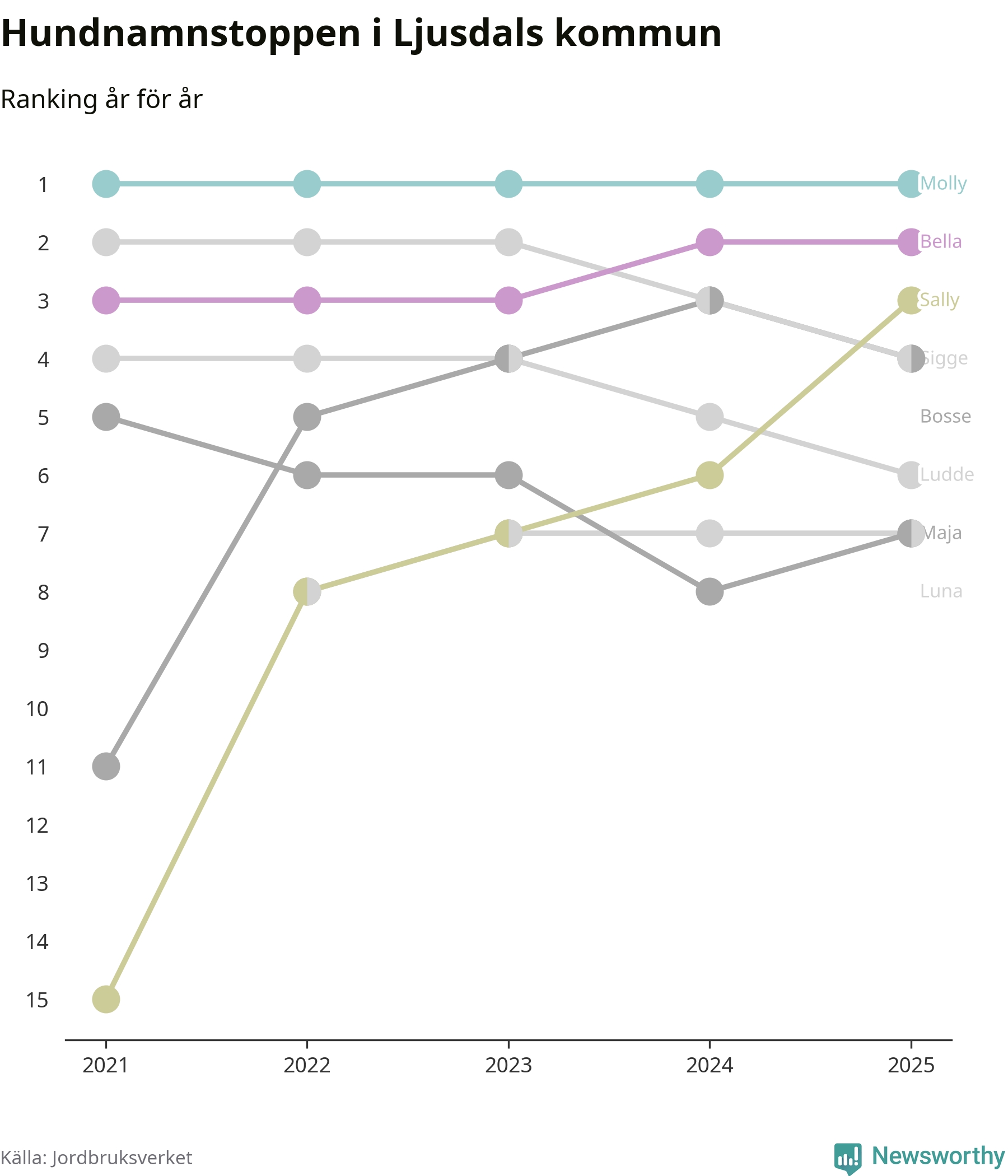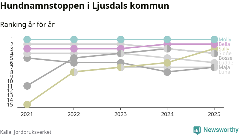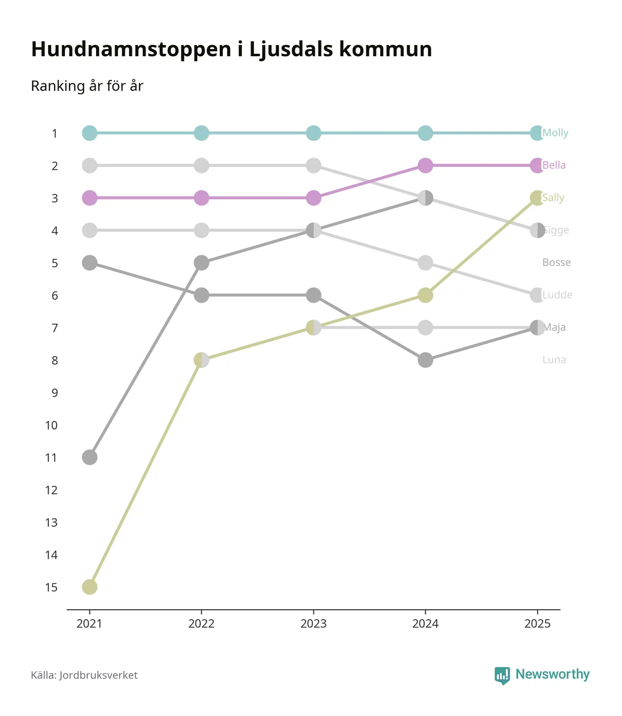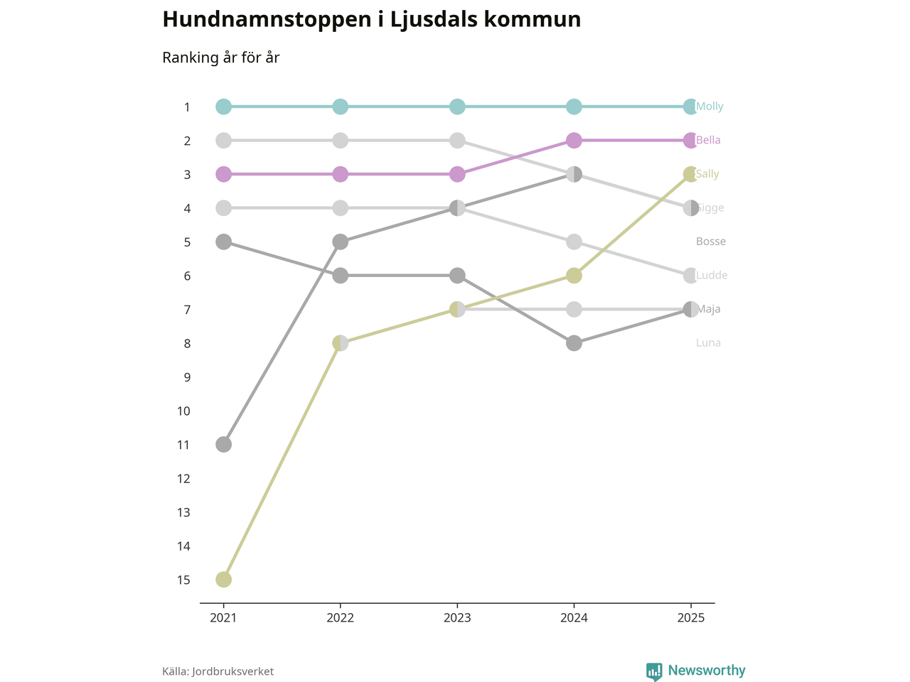 Molly toppar hundnamnsligan i Ljusdals kommun, precis som i landet som helhet. Det visar färsk statistik från Jordbruksverket. Här finns hela topplistan för kommunen.