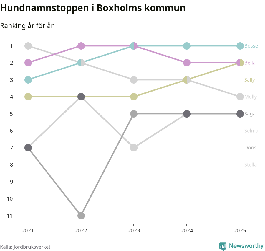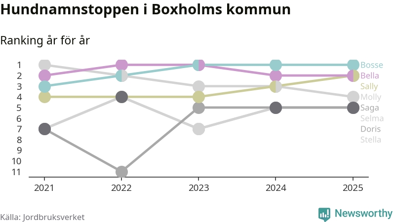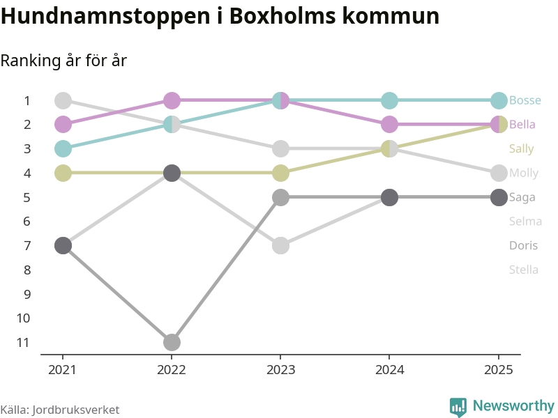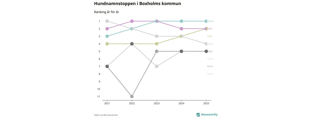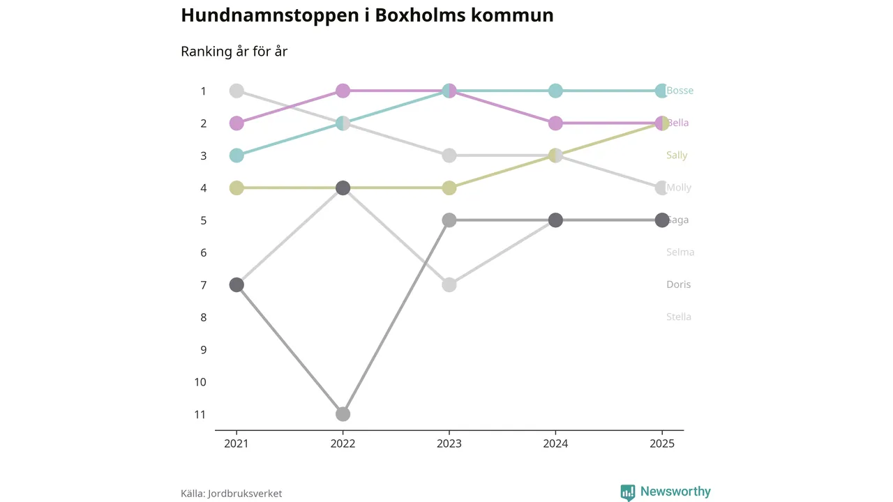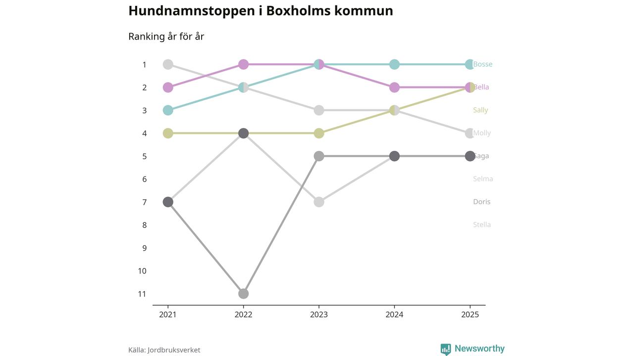 Molly är fortsatt ohotad etta bland hundnamnen i Sverige, följt av Bella och Charlie. Så har det sett ut flera år i rad, men bland Boxholmshundarna är Bosse populärast. Boxholm är en av åtta kommuner i landet där Bosse är vanligast, eller på delad förstaplats.