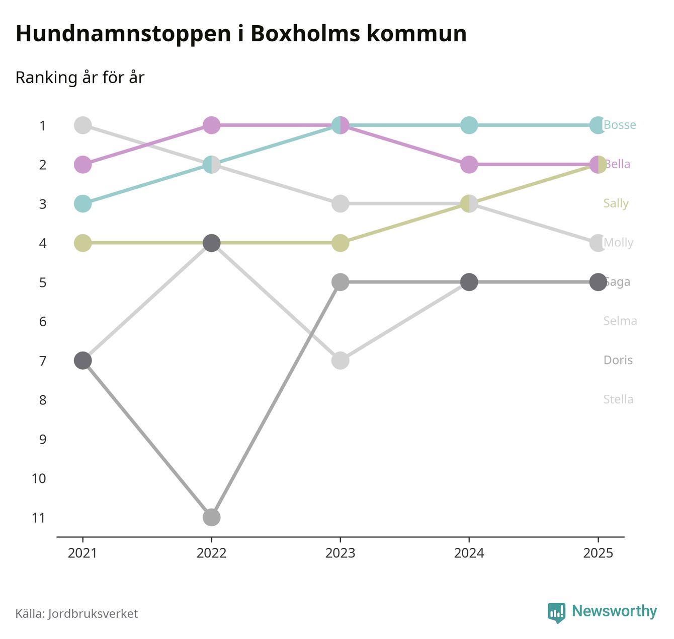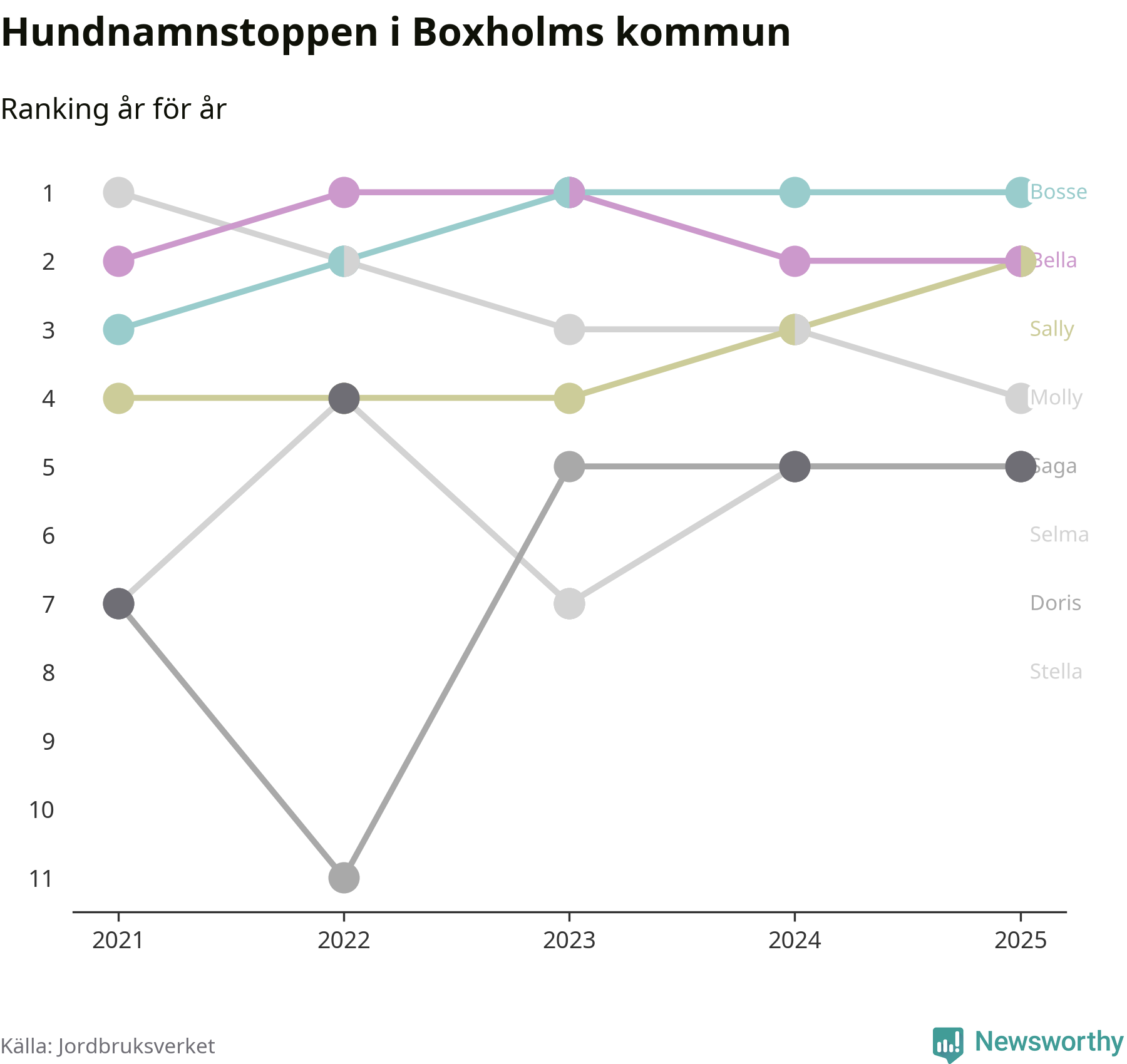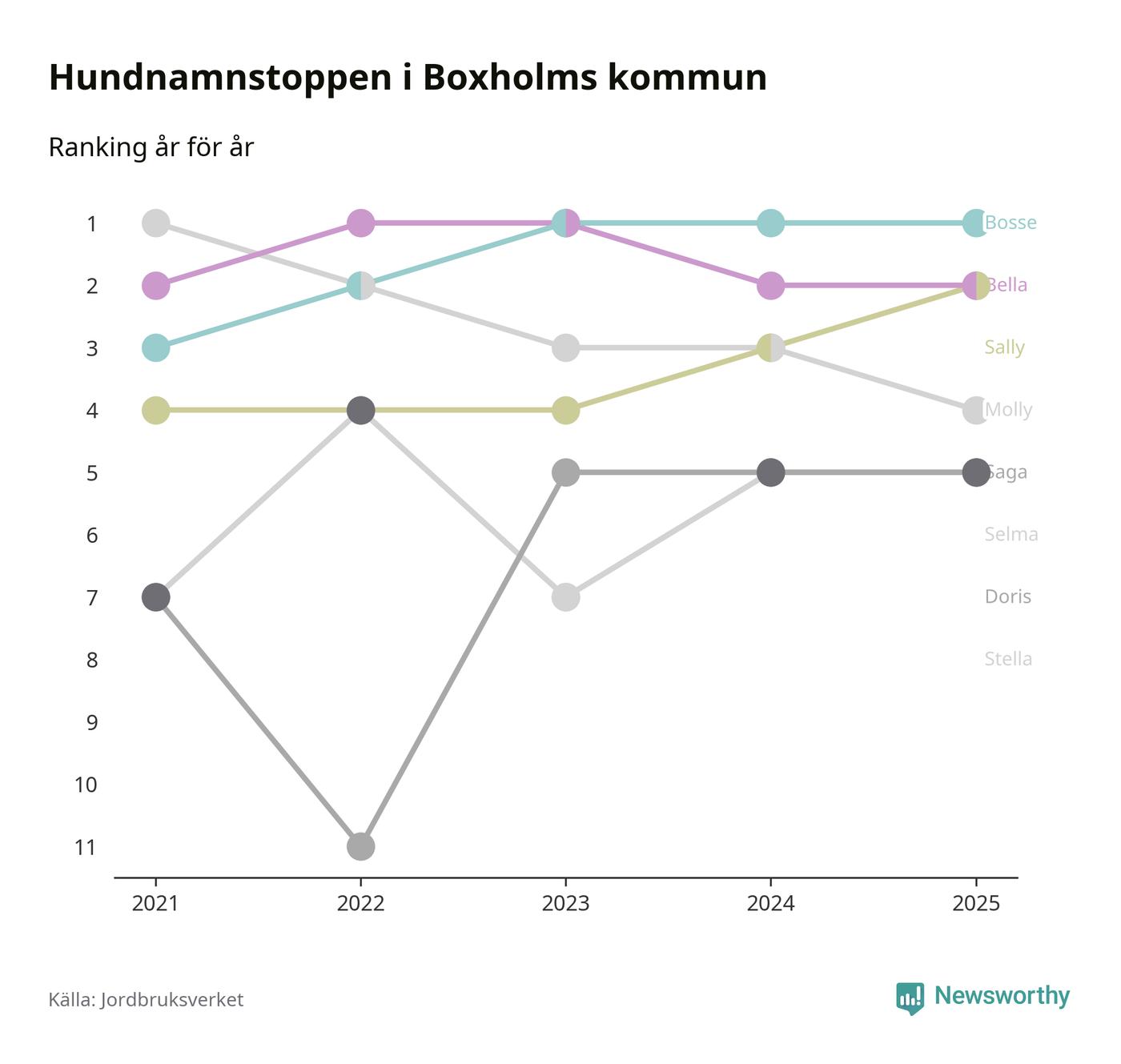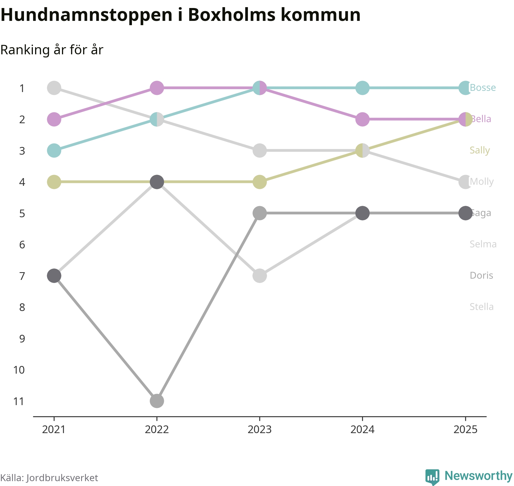 Molly är fortsatt ohotad etta bland hundnamnen i Sverige, följt av Bella och Charlie. Så har det sett ut flera år i rad, men bland Boxholmshundarna är Bosse populärast. Boxholm är en av åtta kommuner i landet där Bosse är vanligast, eller på delad förstaplats.