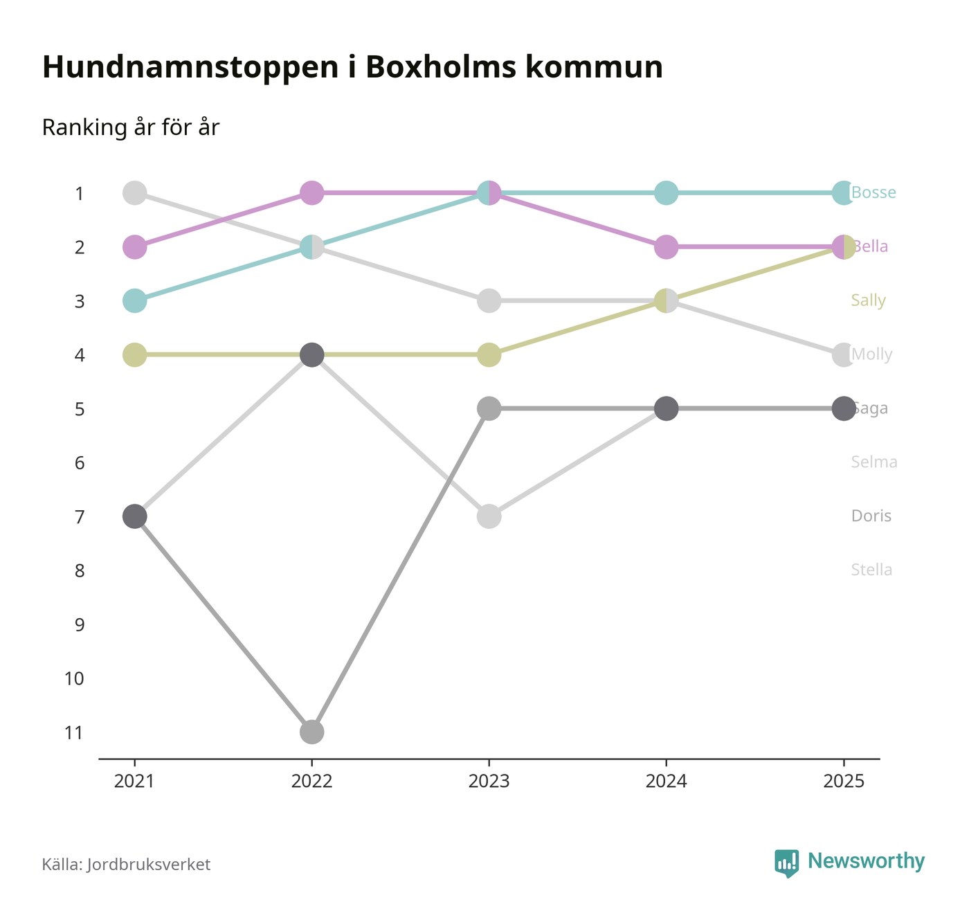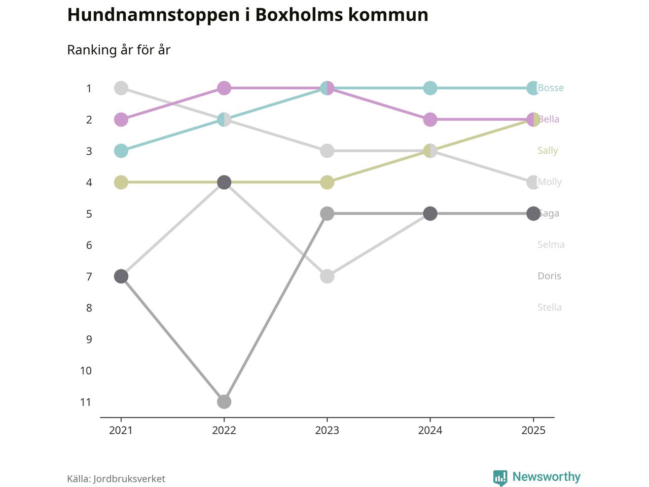 I hela landet är Molly det ohotat populäraste tilltalsnamnet för hundar sedan flera år, följt av Bella och Charlie. Något av de tre namnen toppar listan i 243 av 290 kommuner, och de har varit de vanligaste namnen sedan åtminstone 2018. Men det fjärde populäraste namnet, Doris, knappade in på ledartrion och kommer snart kunna utmana Charlie om tredjeplatsen, om trenden håller i sig.