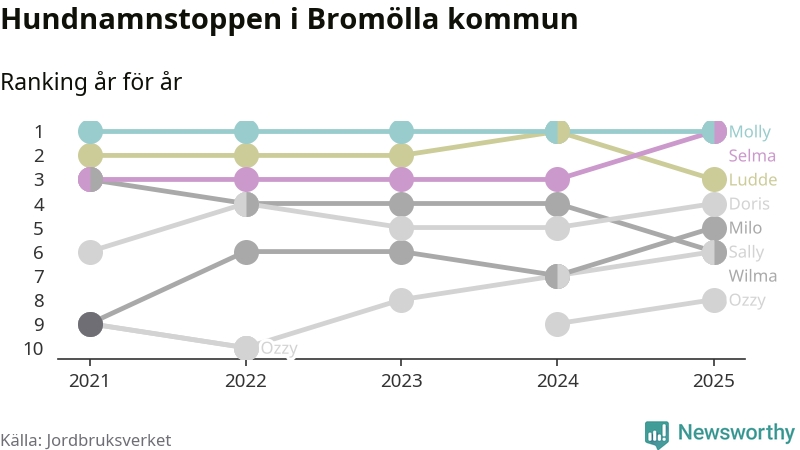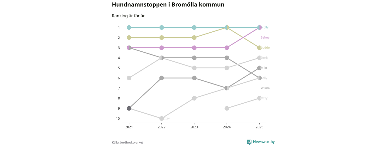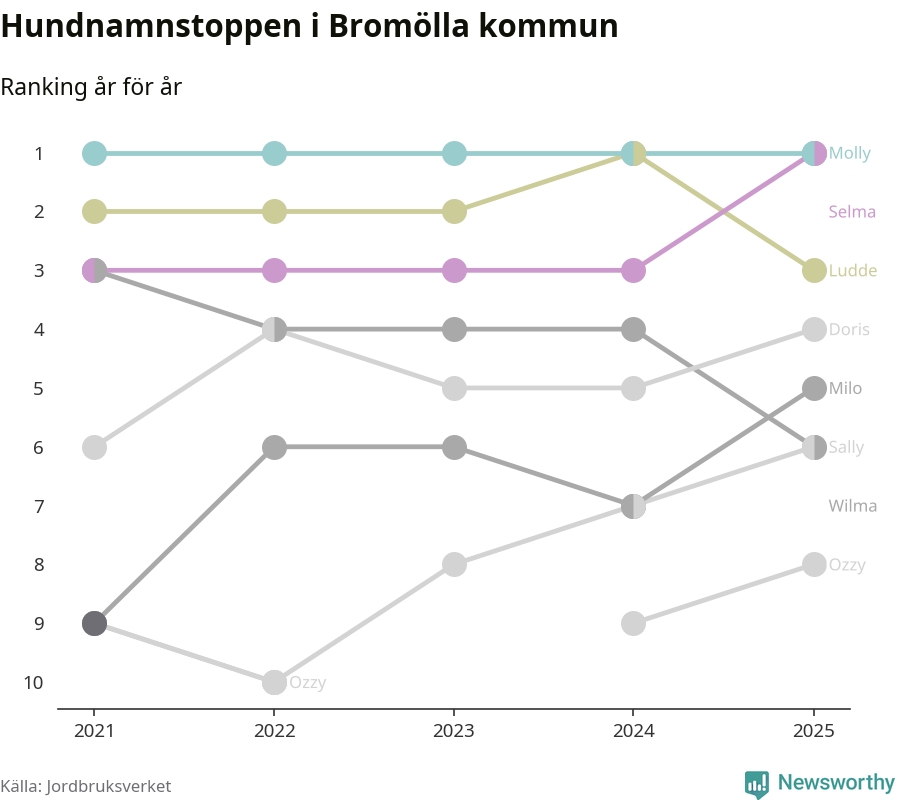 Molly är fortsatt ohotad etta bland hundnamnen i Sverige, följt av Bella och Charlie. Så har det sett ut flera år i rad, och även bland Bromöllahundarna ligger Molly i topp, tillsammans med Selma.