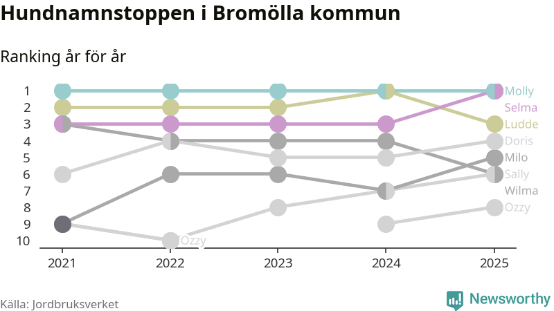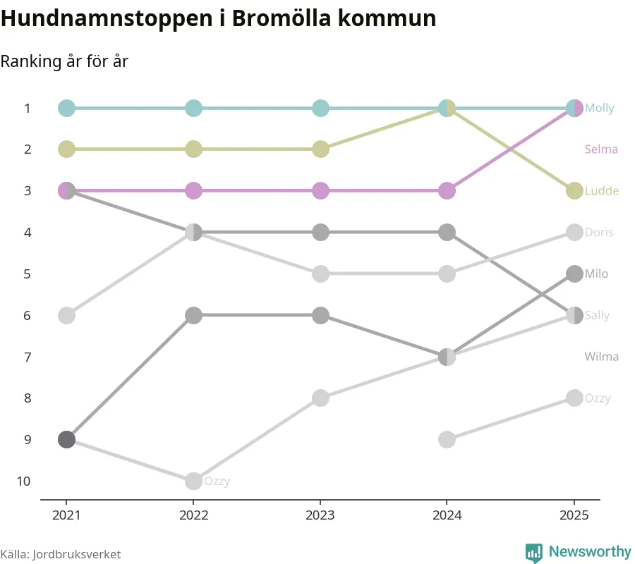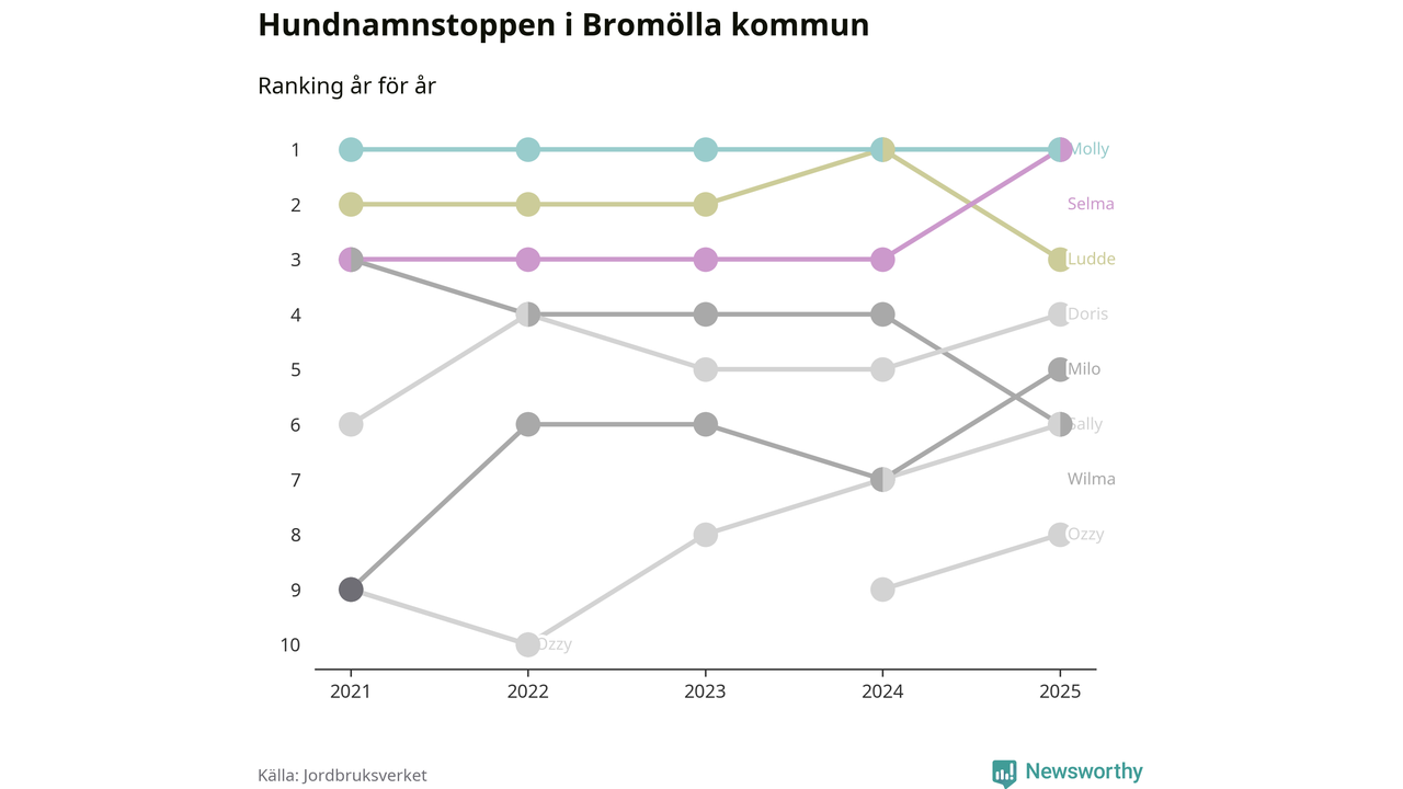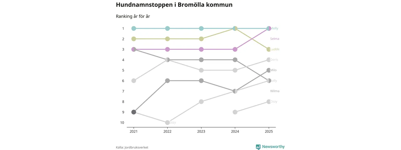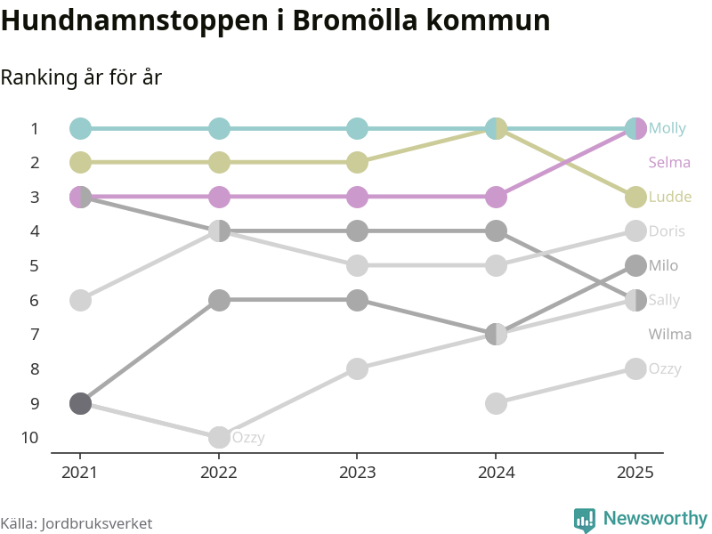 Selma utmanar Molly om förstaplatsen på topplistan över Bromöllas hundnamn, visar ny statistik från Jordbruksverkets hundregister. Namnet delar nu topplaceringen.