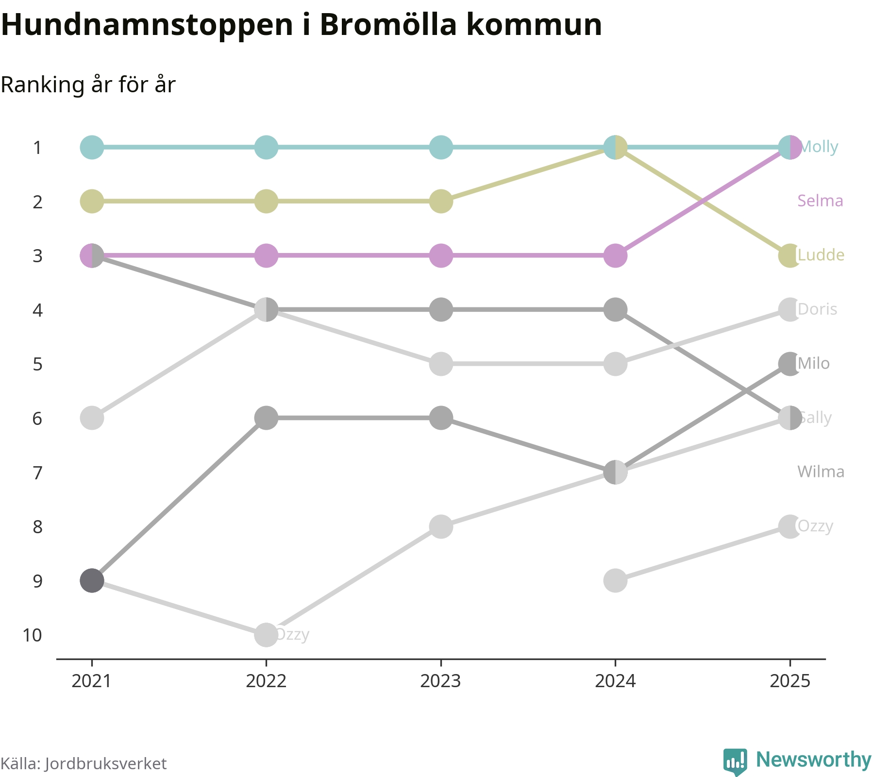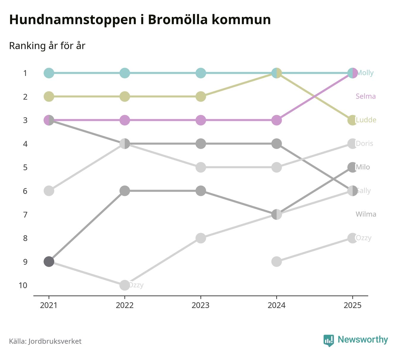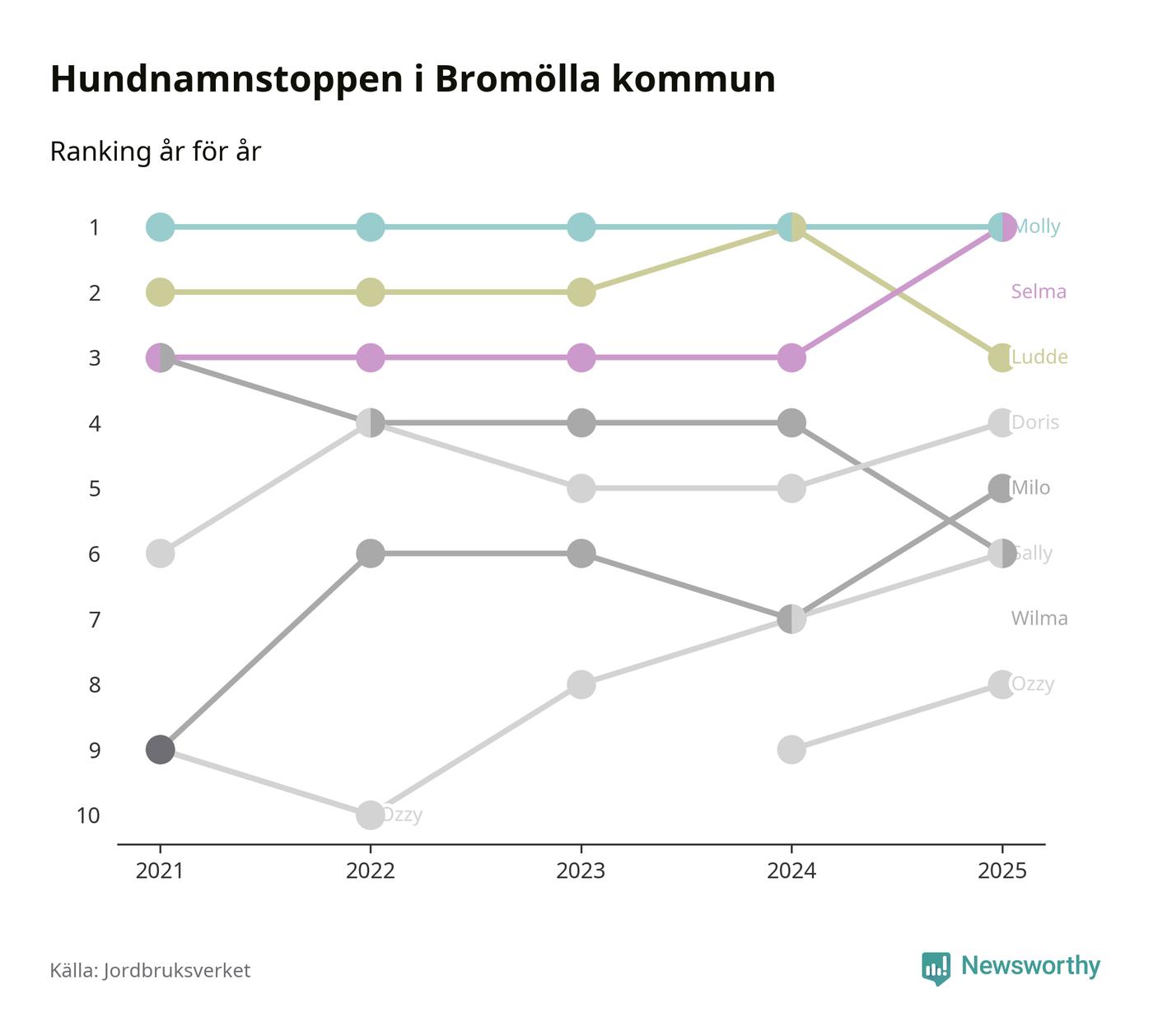 Selma utmanar Molly om förstaplatsen på topplistan över Bromöllas hundnamn, visar ny statistik från Jordbruksverkets hundregister. Namnet delar nu topplaceringen.