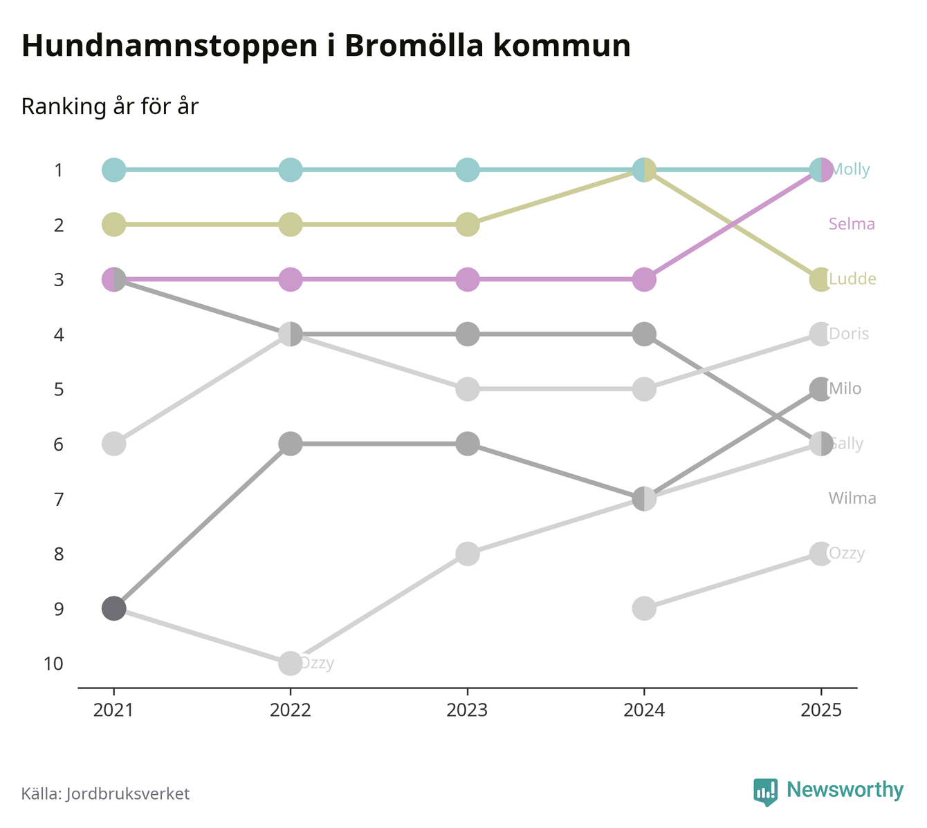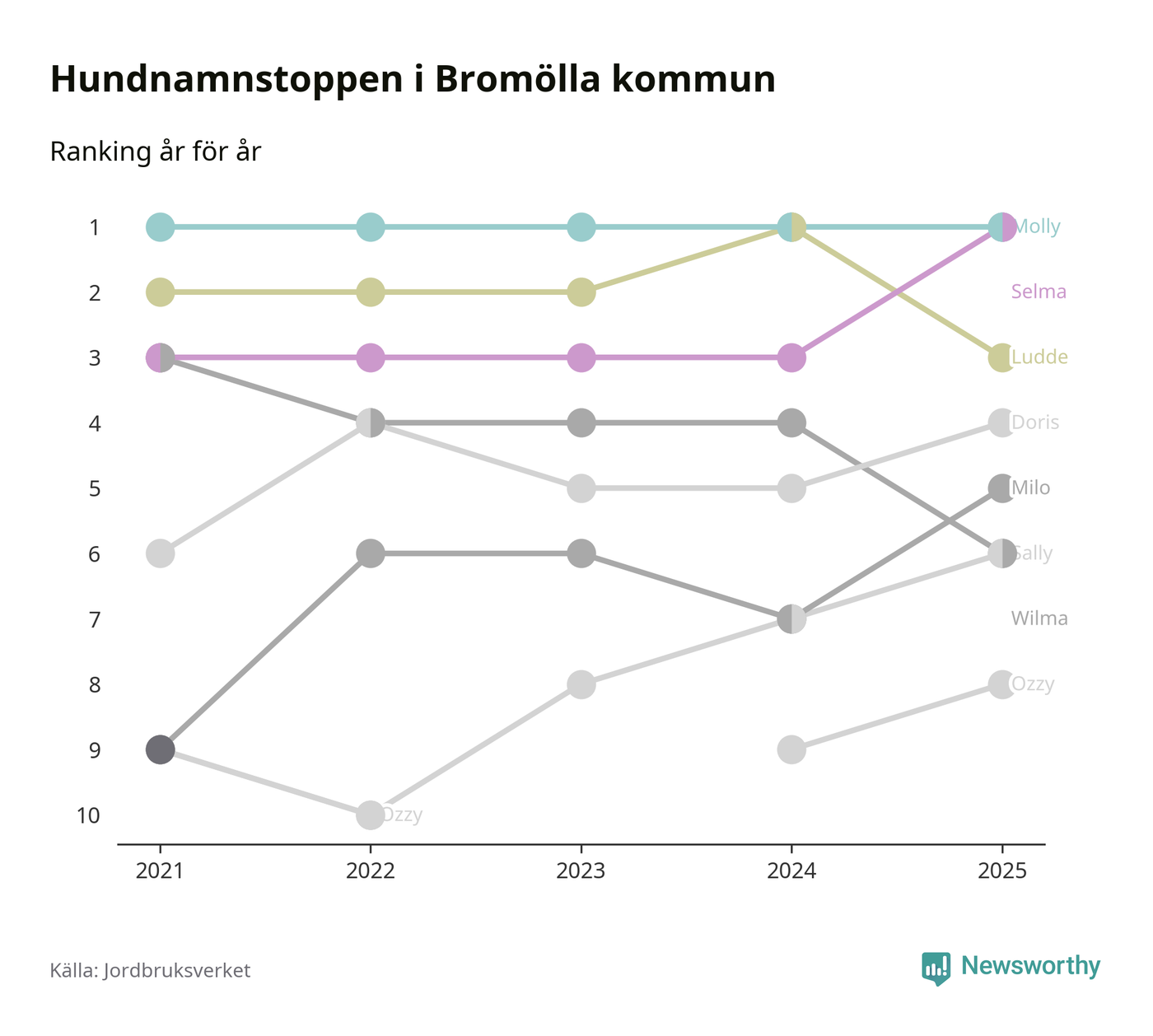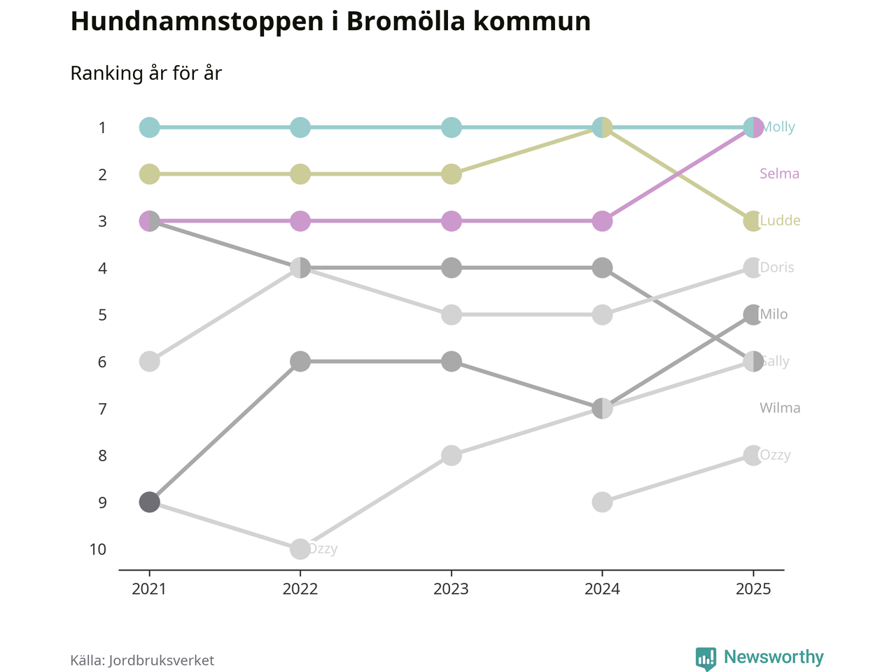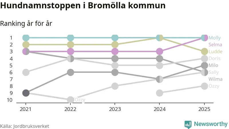 I hela landet är Molly det ohotat populäraste tilltalsnamnet för hundar sedan flera år, följt av Bella och Charlie. Något av de tre namnen toppar listan i 243 av 290 kommuner, och de har varit de vanligaste namnen sedan åtminstone 2018. Men det fjärde populäraste namnet, Doris, knappade in på ledartrion och kommer snart kunna utmana Charlie om tredjeplatsen, om trenden håller i sig.