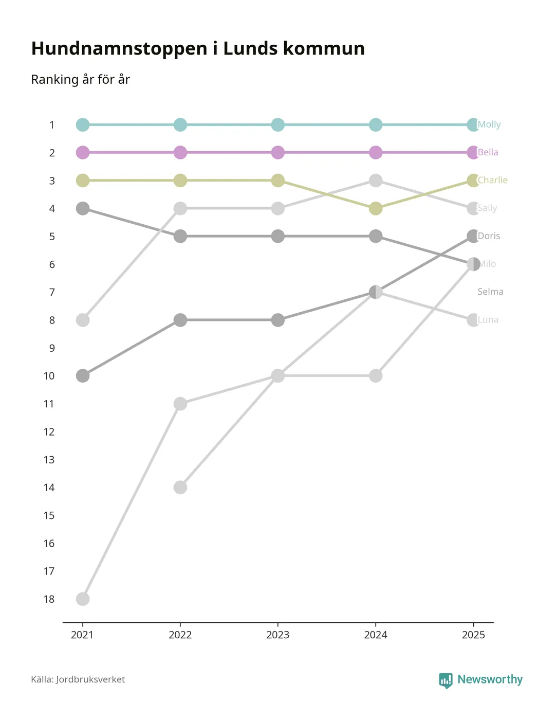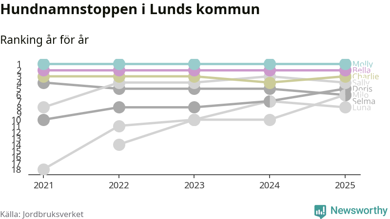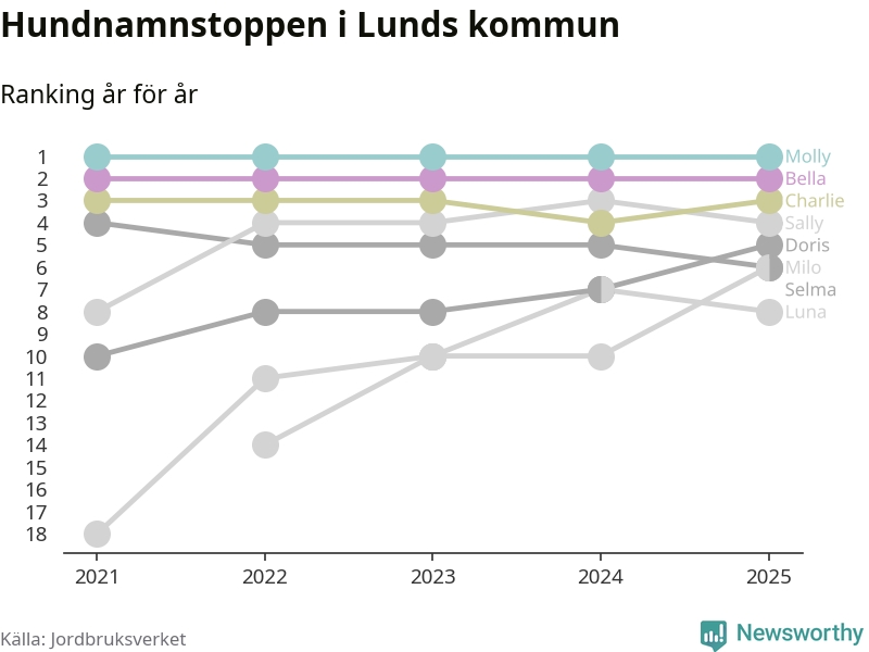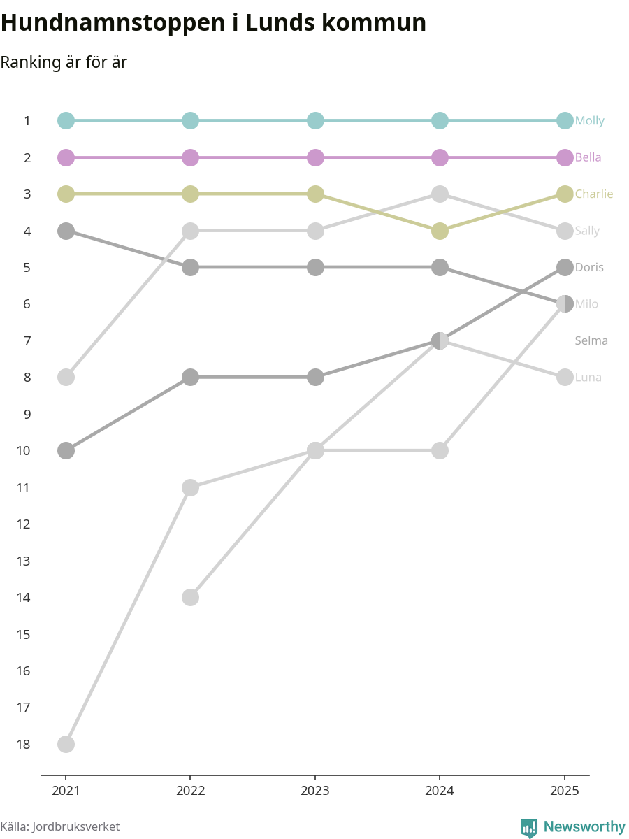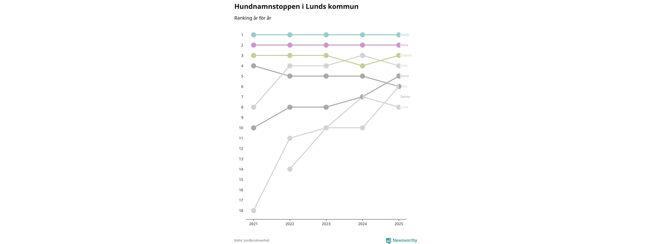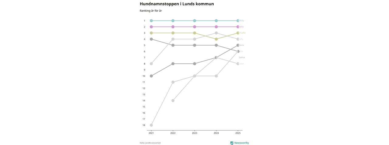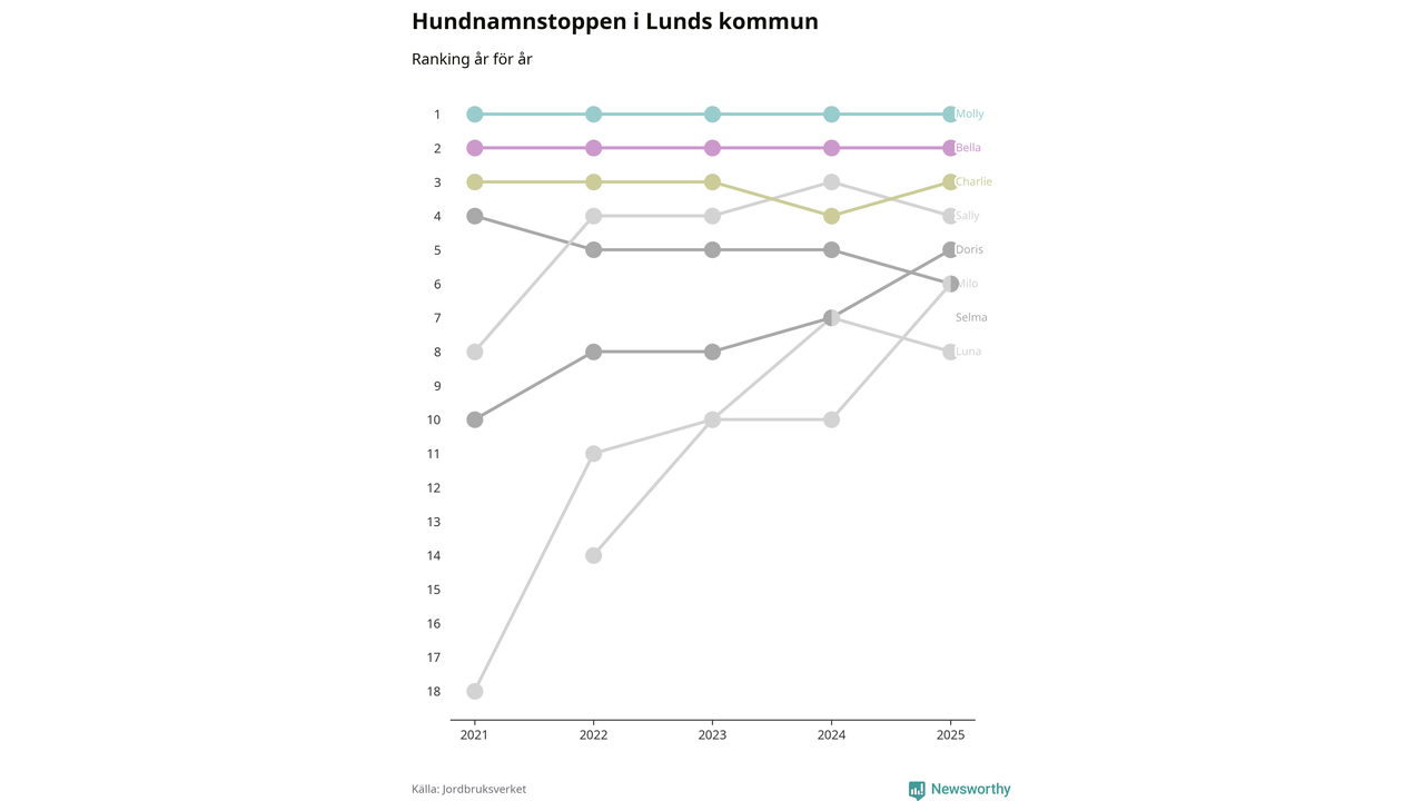 I hela landet är Molly det ohotat populäraste tilltalsnamnet för hundar sedan flera år, följt av Bella och Charlie. Något av de tre namnen toppar listan i 243 av 290 kommuner, och de har varit de vanligaste namnen sedan åtminstone 2018. Men det fjärde populäraste namnet, Doris, knappade in på ledartrion och kommer snart kunna utmana Charlie om tredjeplatsen, om trenden håller i sig.