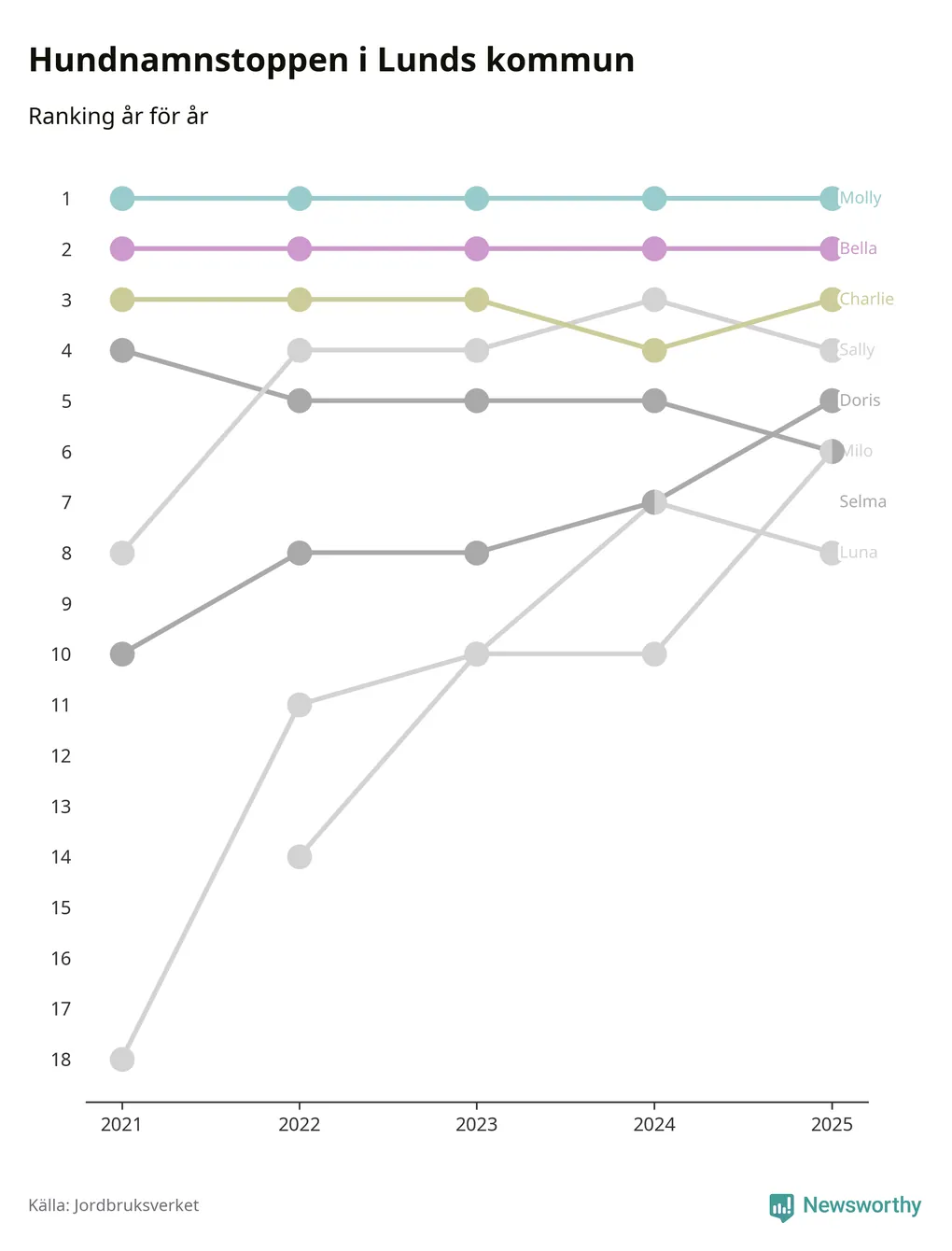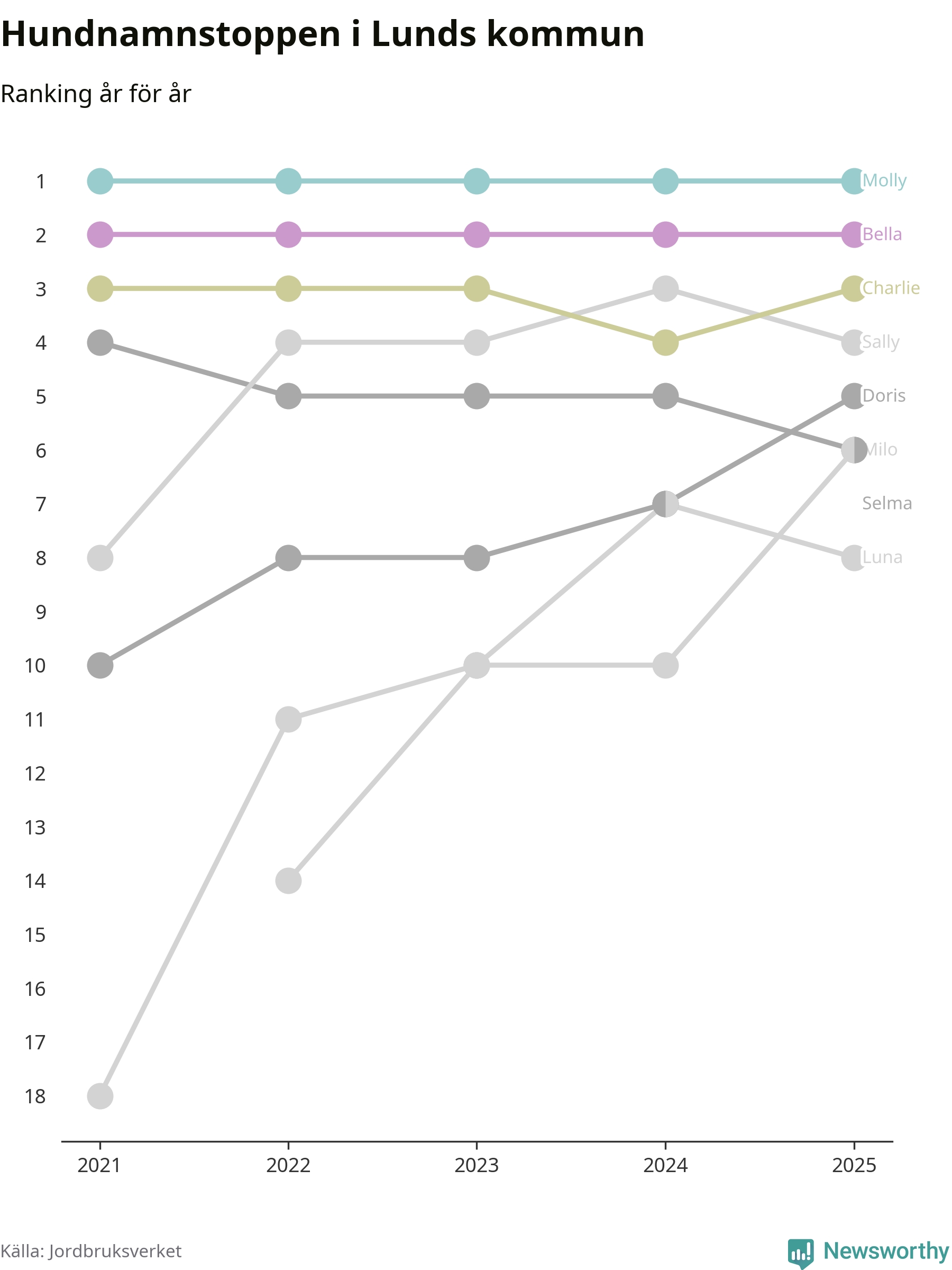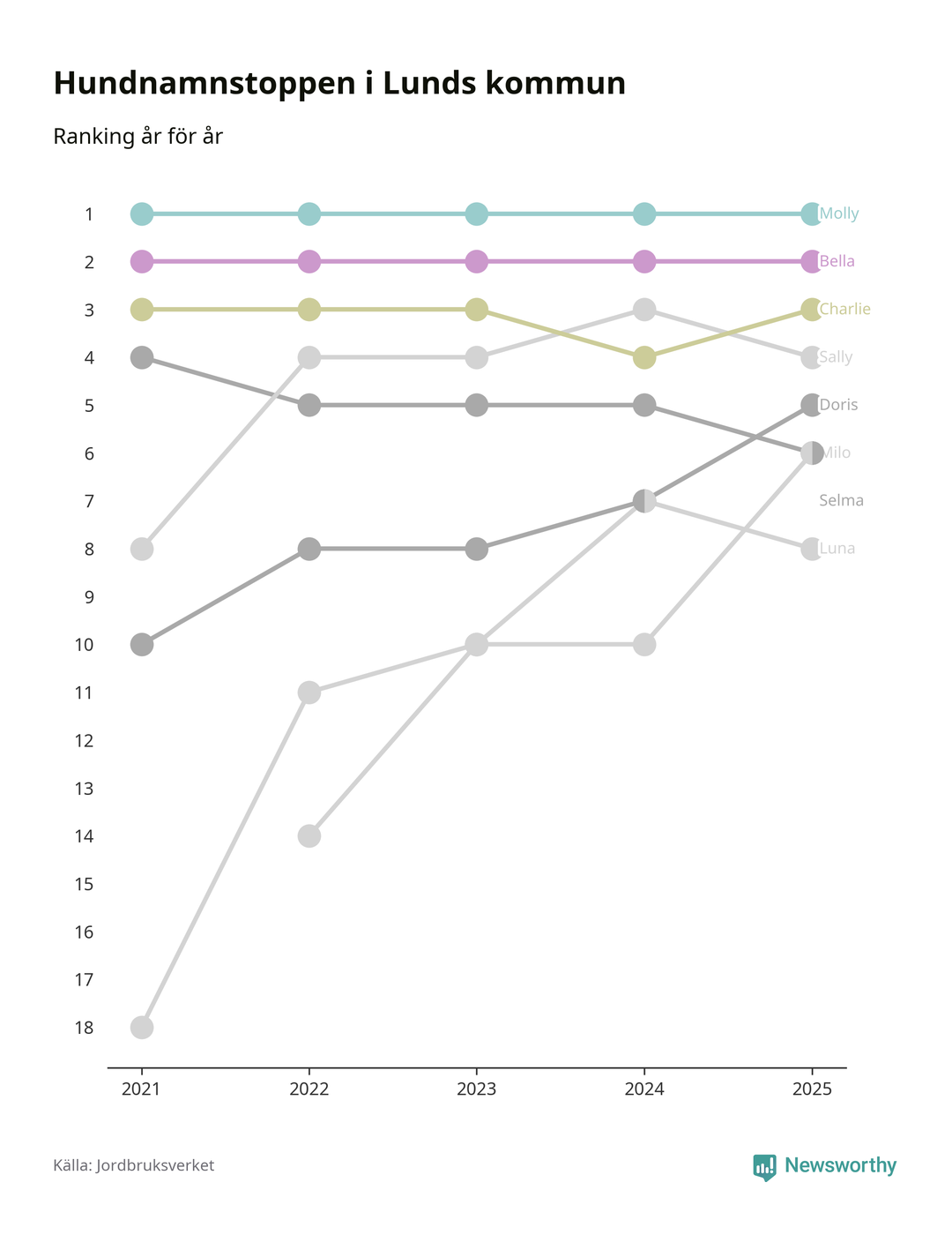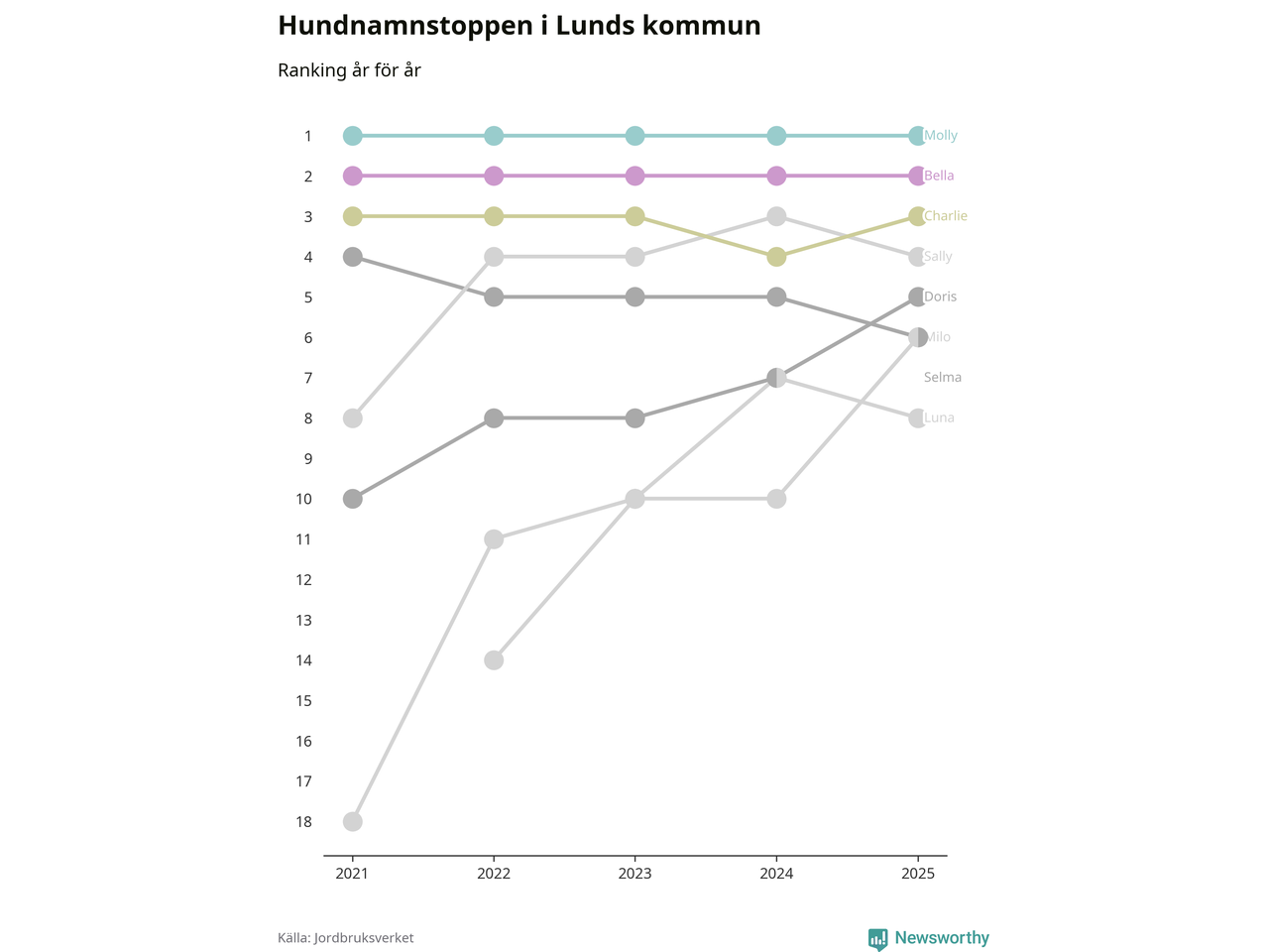 I hela landet är Molly det ohotat populäraste tilltalsnamnet för hundar sedan flera år, följt av Bella och Charlie. Något av de tre namnen toppar listan i 243 av 290 kommuner, och de har varit de vanligaste namnen sedan åtminstone 2018. Men det fjärde populäraste namnet, Doris, knappade in på ledartrion och kommer snart kunna utmana Charlie om tredjeplatsen, om trenden håller i sig.