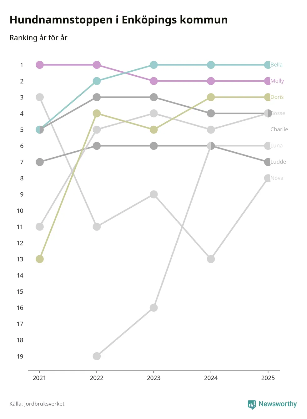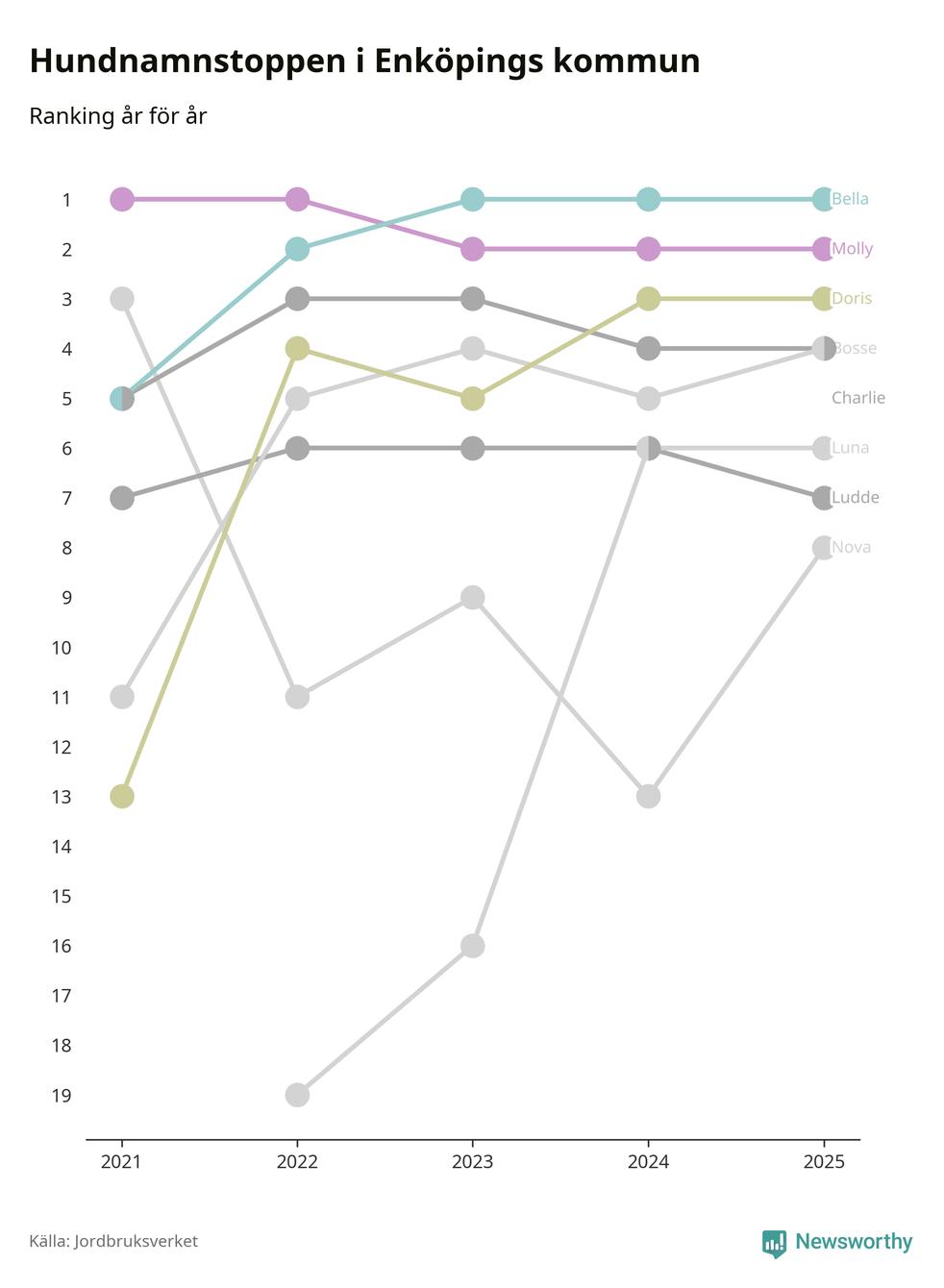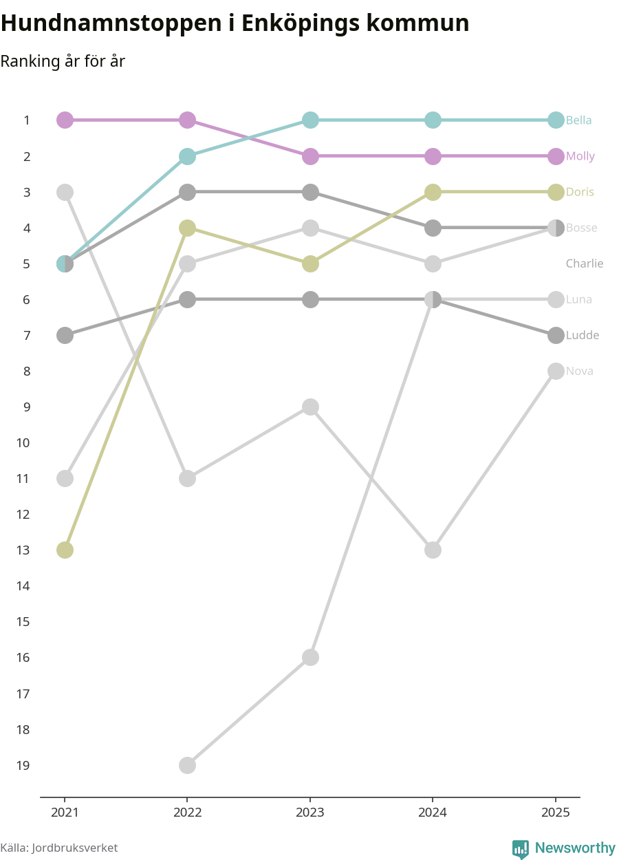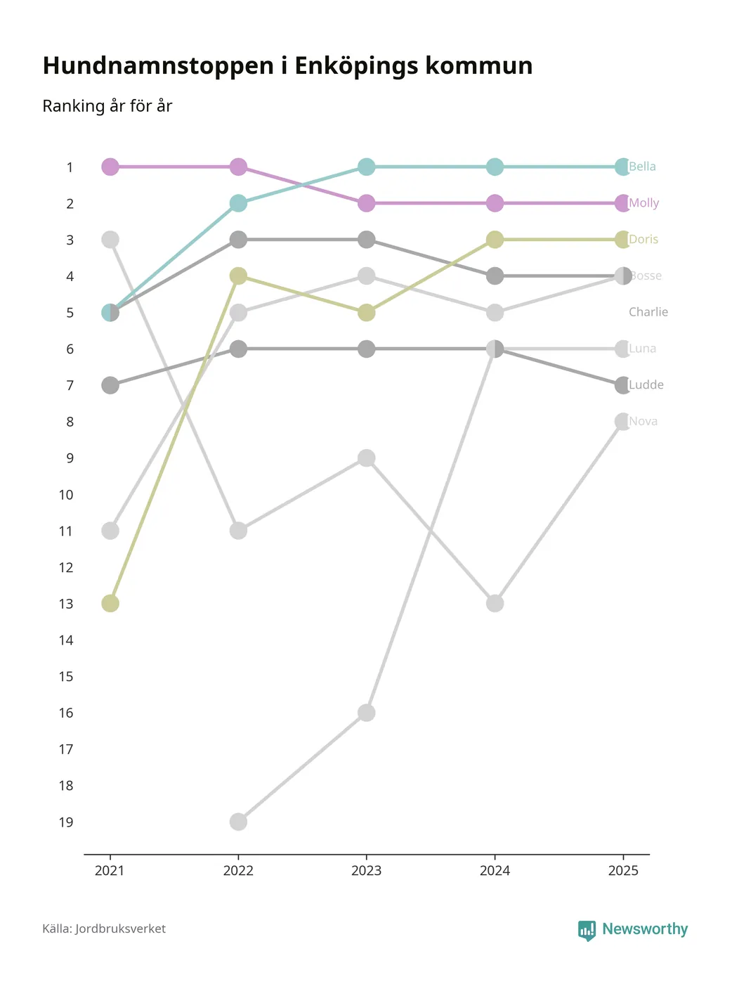I hela landet är Molly det ohotat populäraste tilltalsnamnet för hundar sedan flera år, följt av Bella och Charlie. Något av de tre namnen toppar listan i 243 av 290 kommuner, och de har varit de vanligaste namnen sedan åtminstone 2018. Men det fjärde populäraste namnet, Doris, knappade in på ledartrion och kommer snart kunna utmana Charlie om tredjeplatsen, om trenden håller i sig.