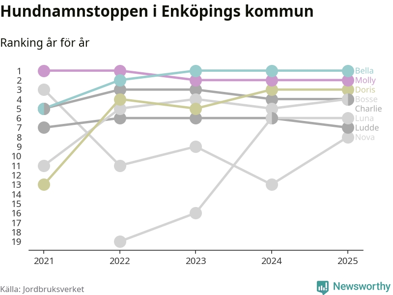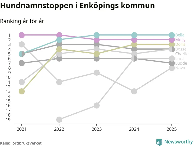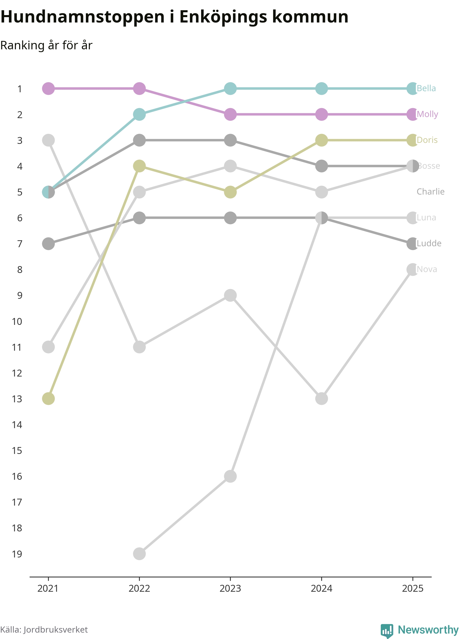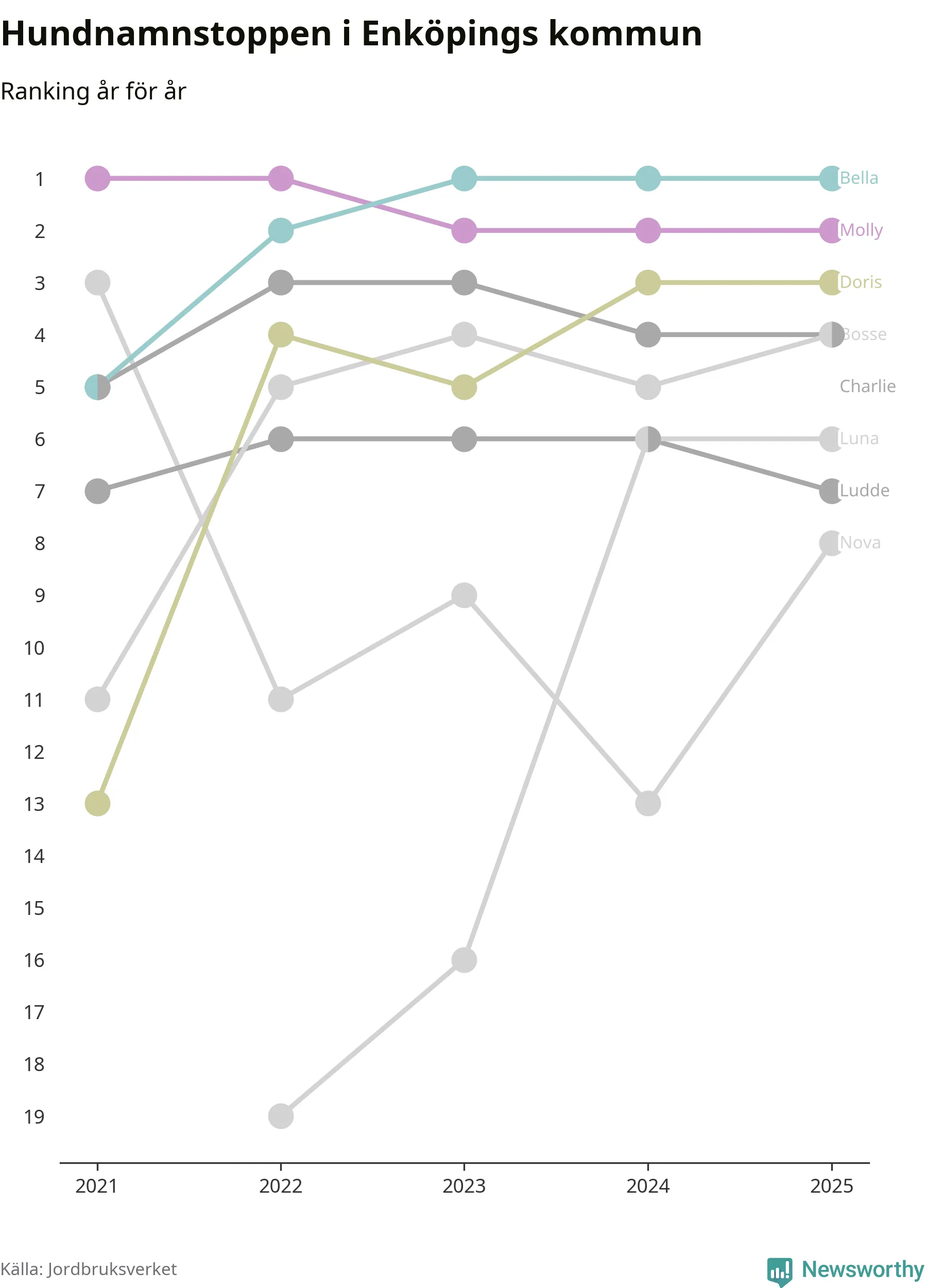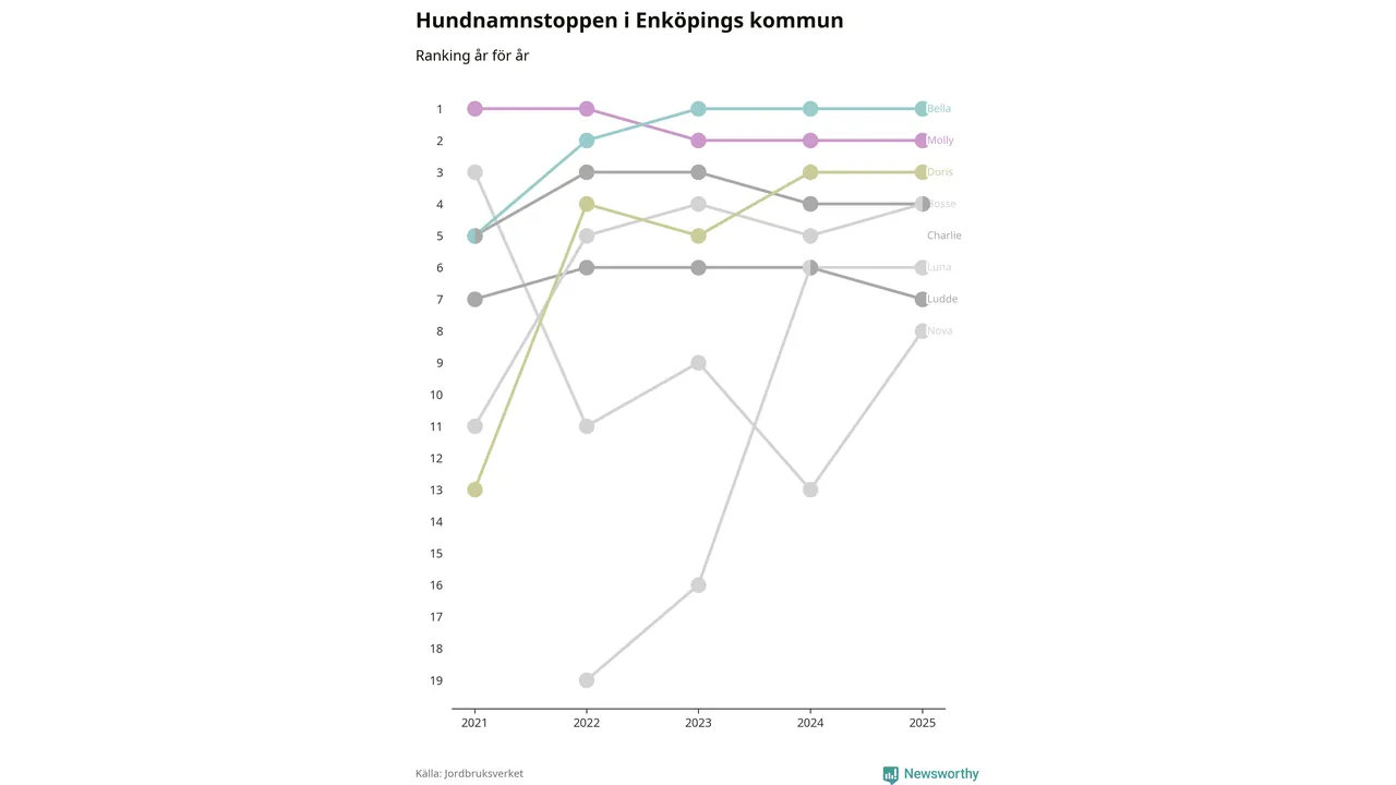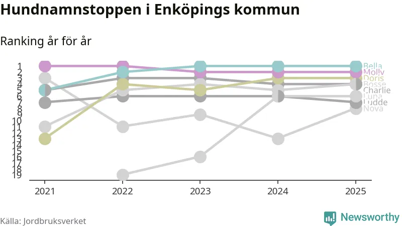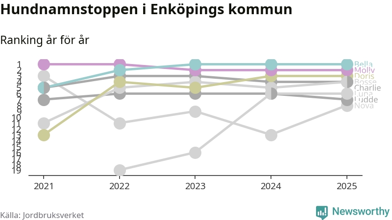 I hela landet är Molly det ohotat populäraste tilltalsnamnet för hundar sedan flera år, följt av Bella och Charlie. Något av de tre namnen toppar listan i 243 av 290 kommuner, och de har varit de vanligaste namnen sedan åtminstone 2018. Men det fjärde populäraste namnet, Doris, knappade in på ledartrion och kommer snart kunna utmana Charlie om tredjeplatsen, om trenden håller i sig.