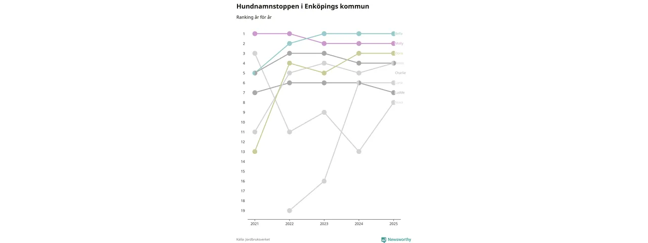 Molly är fortsatt ohotad etta bland hundnamnen i Sverige, följt av Bella och Charlie. Så har det sett ut flera år i rad, men bland Enköpingshundarna är Bella populärast.