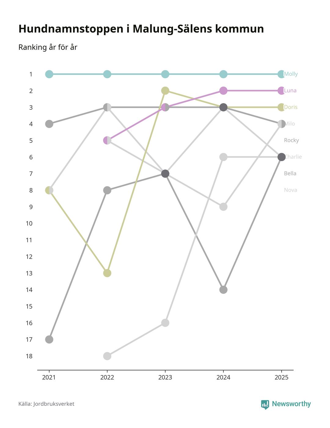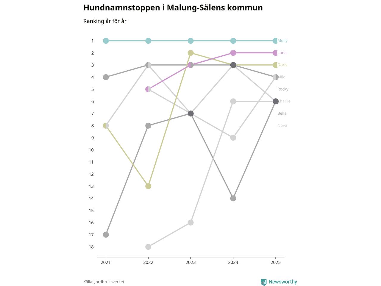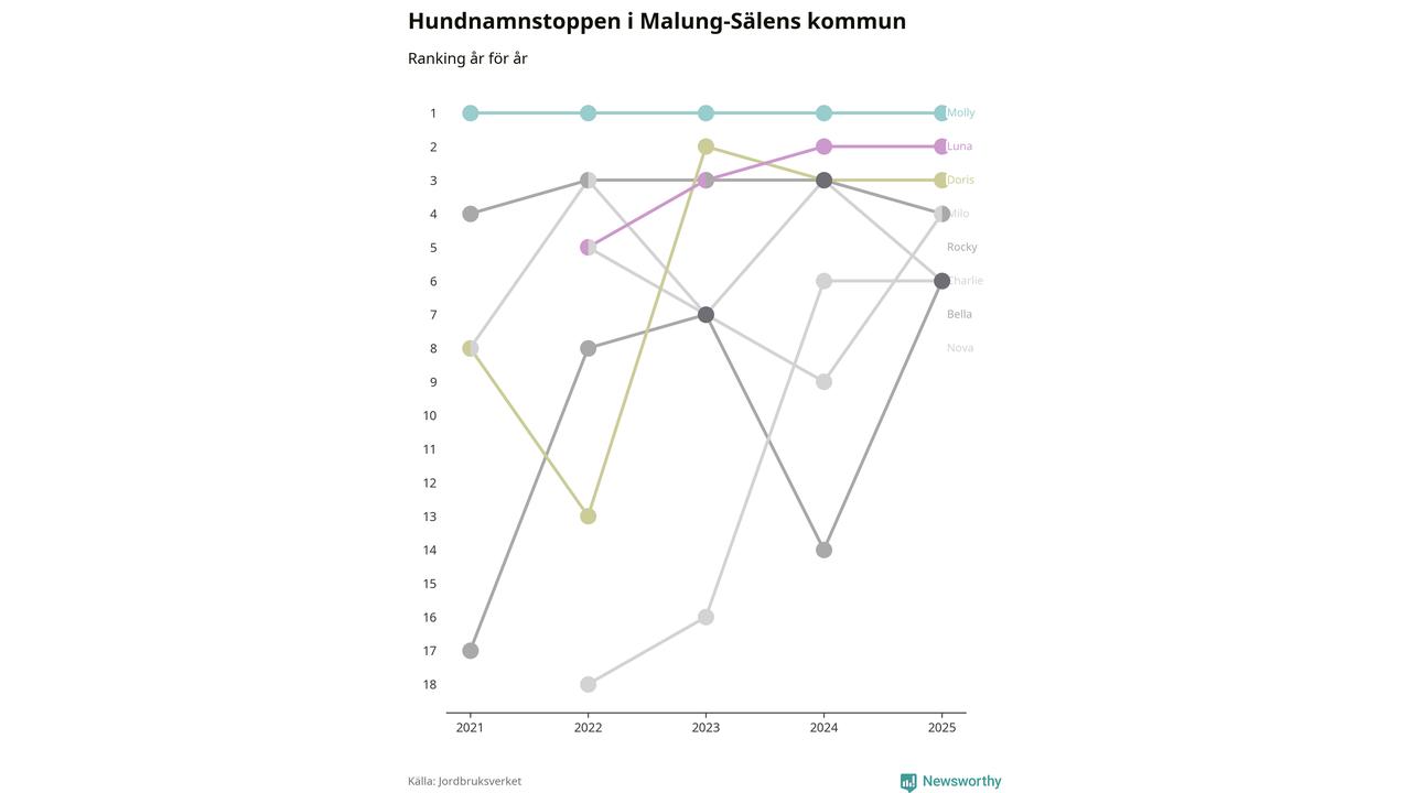 Molly toppar hundnamnsligan i Malung-Sälens kommun, precis som i landet som helhet. Det visar färsk statistik från Jordbruksverket. Här finns hela topplistan för kommunen.