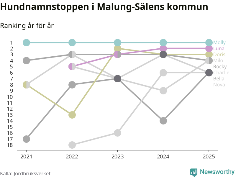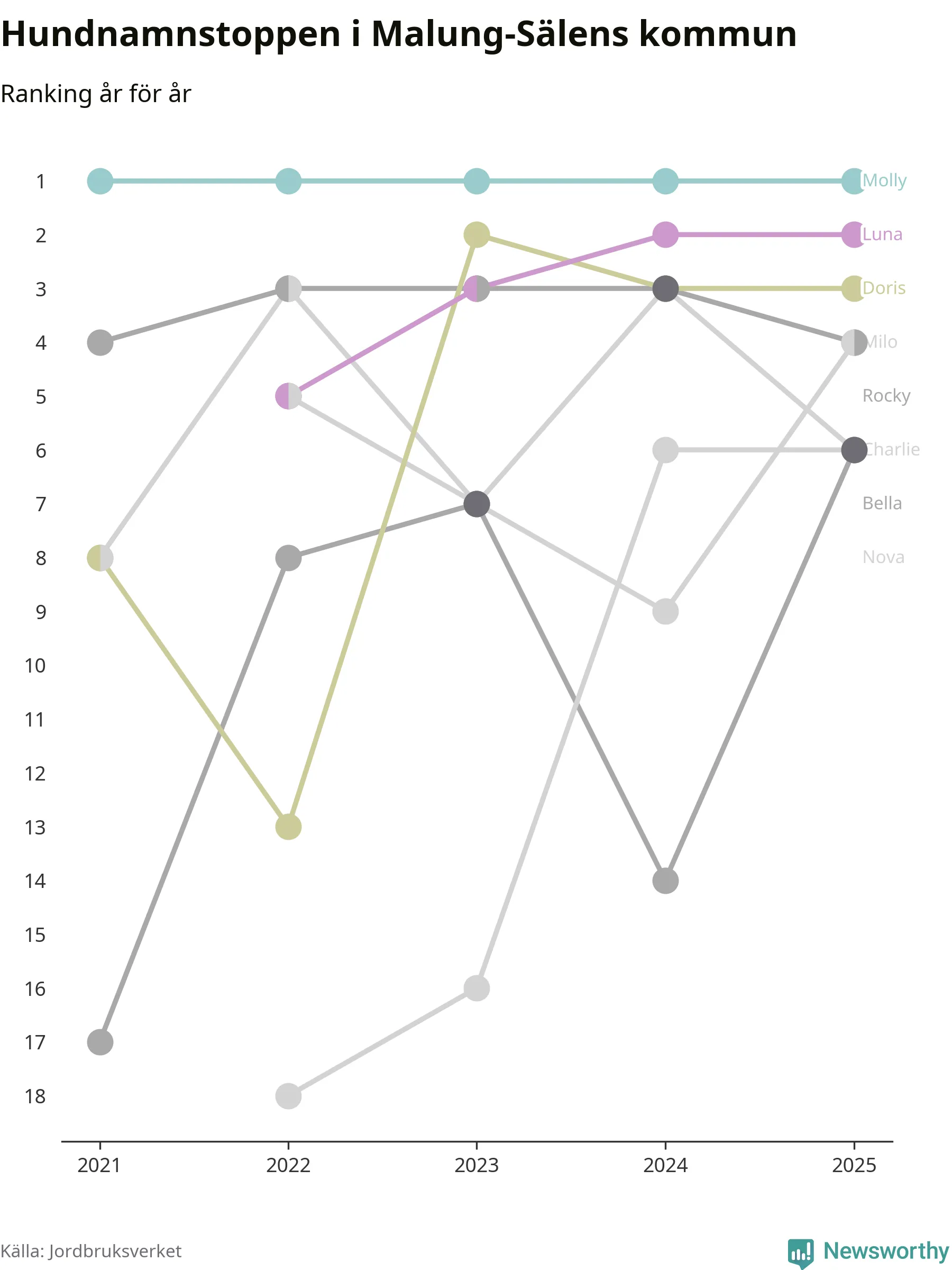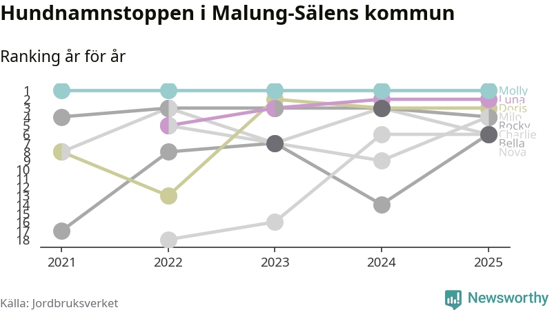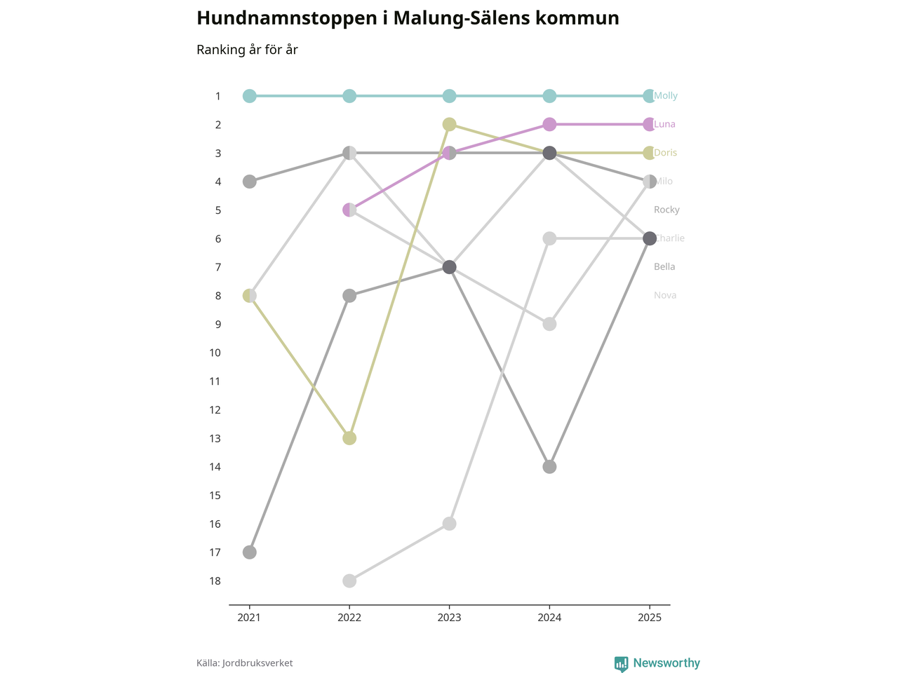 Molly toppar hundnamnsligan i Malung-Sälens kommun, precis som i landet som helhet. Det visar färsk statistik från Jordbruksverket. Här finns hela topplistan för kommunen.
