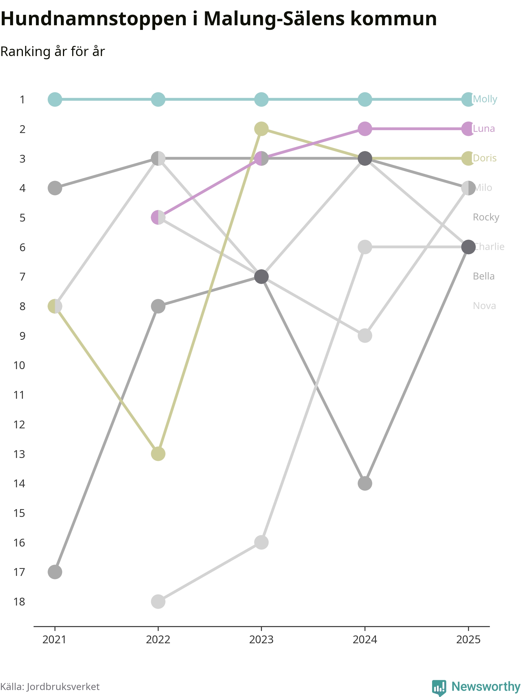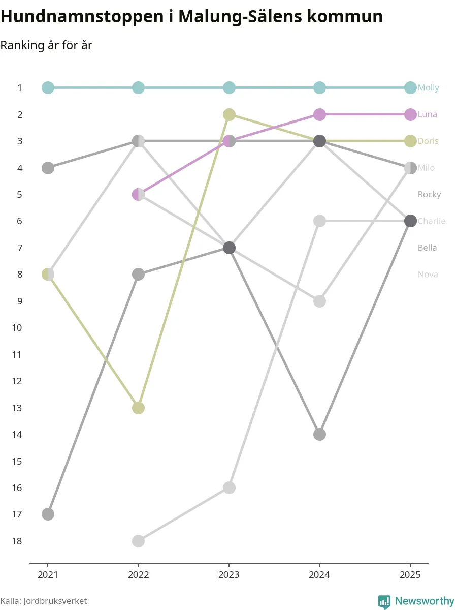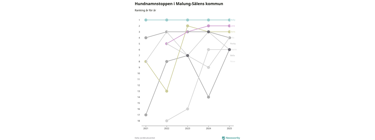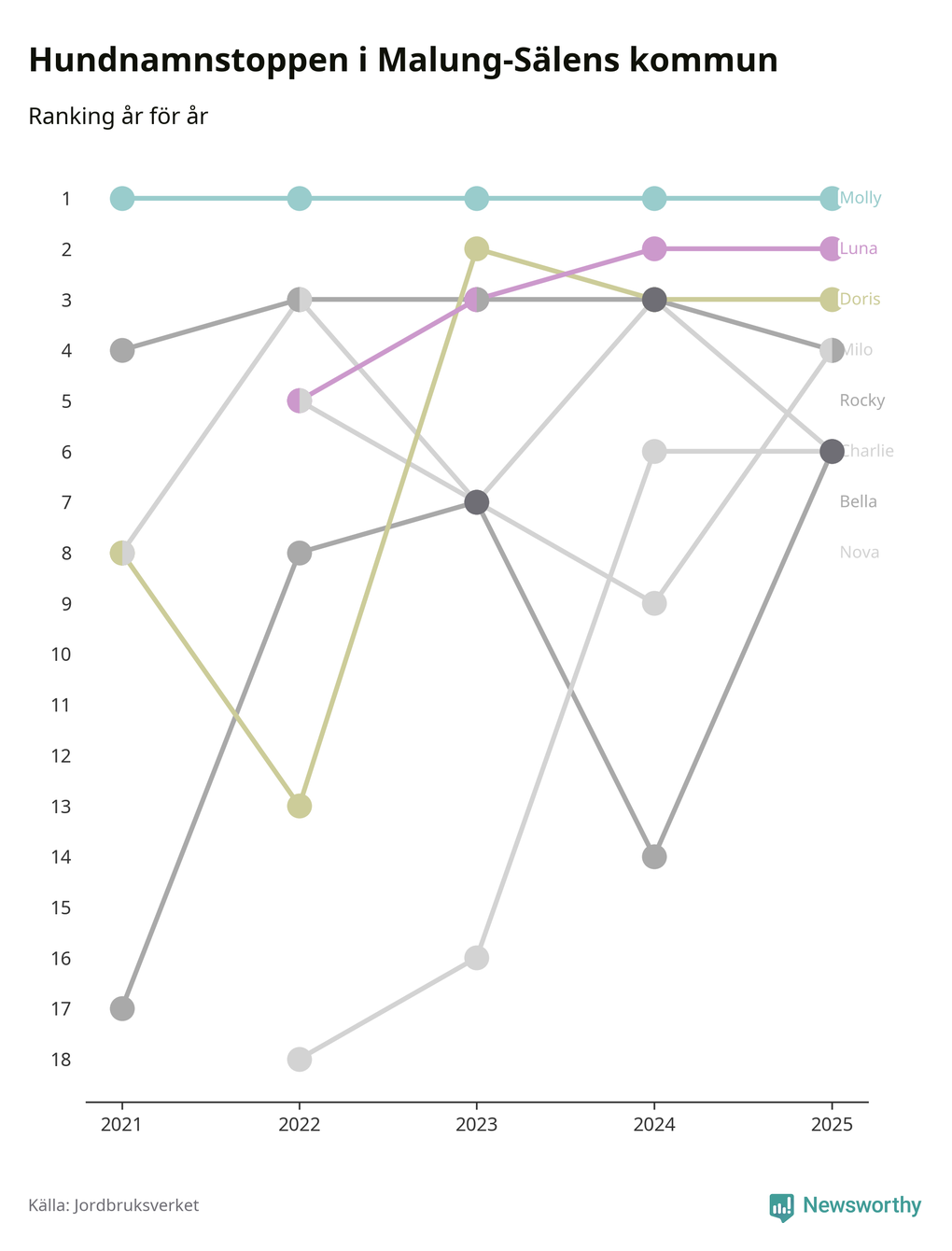 I hela landet är Molly det ohotat populäraste tilltalsnamnet för hundar sedan flera år, följt av Bella och Charlie. Något av de tre namnen toppar listan i 243 av 290 kommuner, och de har varit de vanligaste namnen sedan åtminstone 2018. Men det fjärde populäraste namnet, Doris, knappade in på ledartrion och kommer snart kunna utmana Charlie om tredjeplatsen, om trenden håller i sig.
