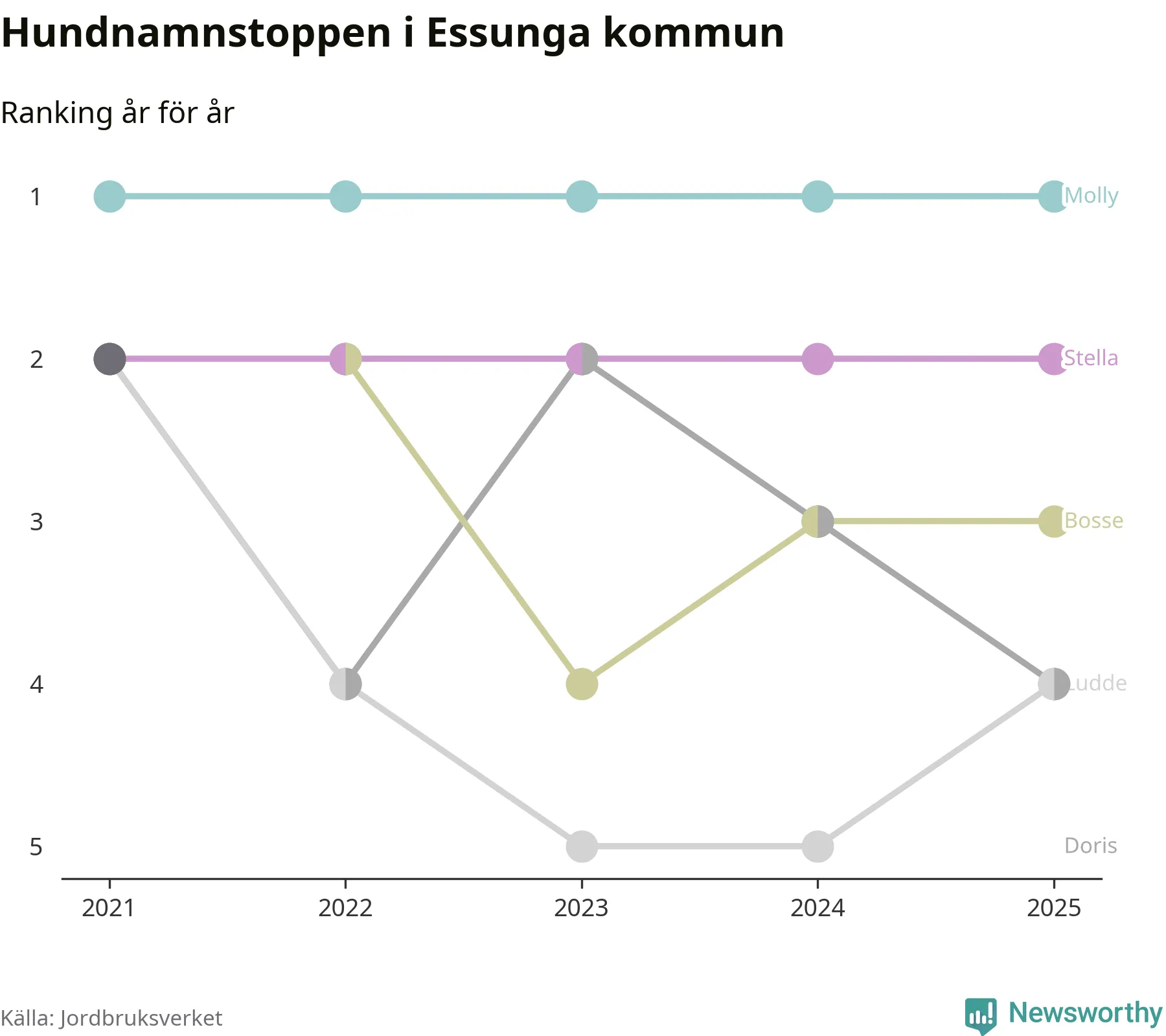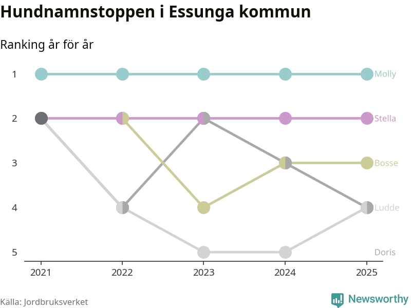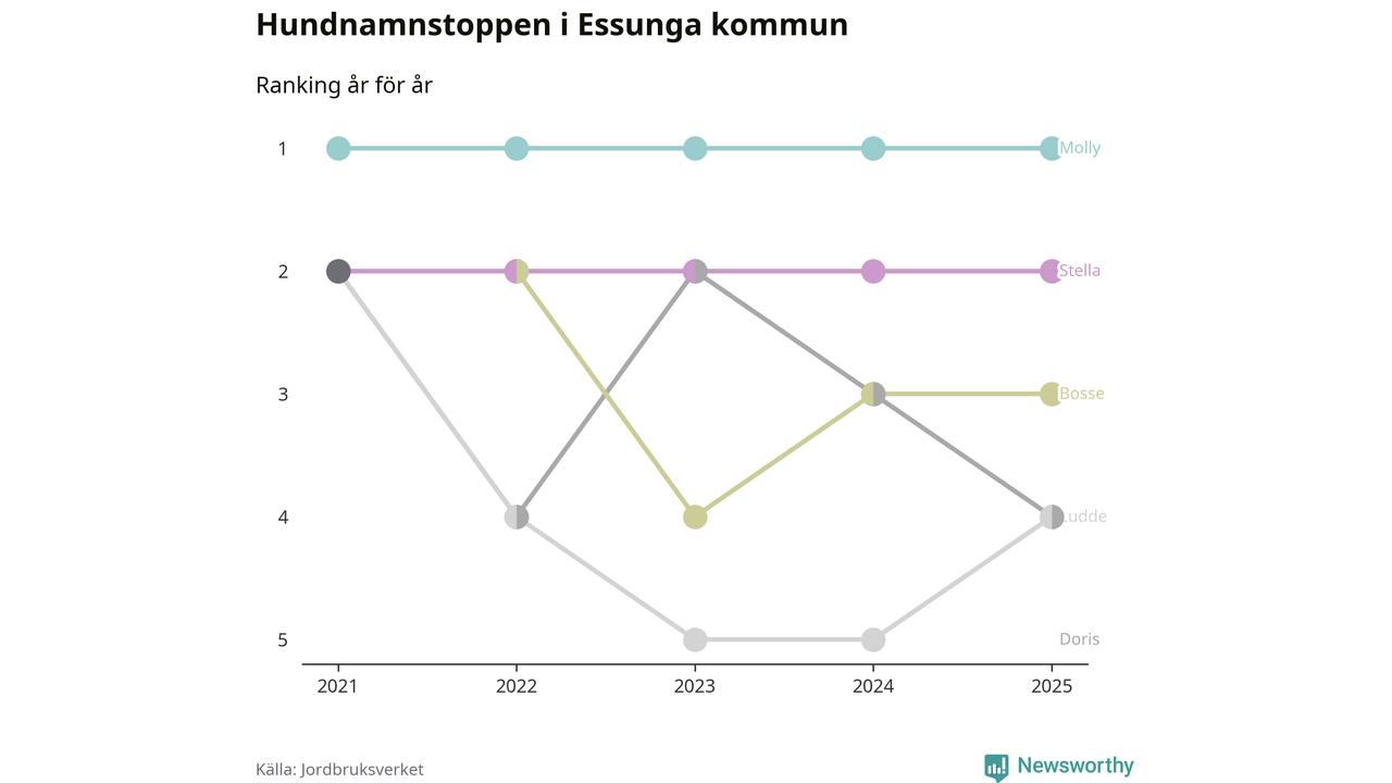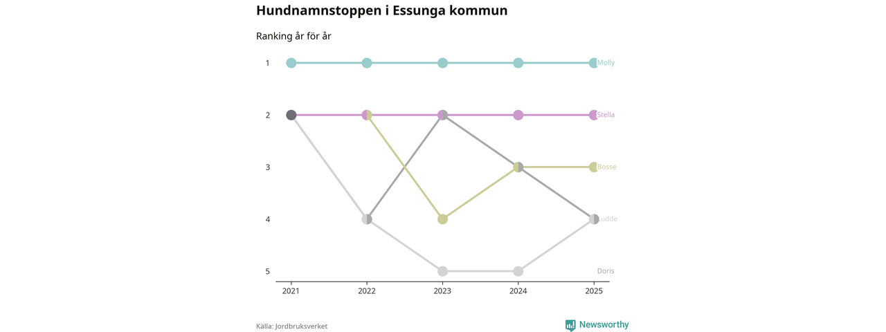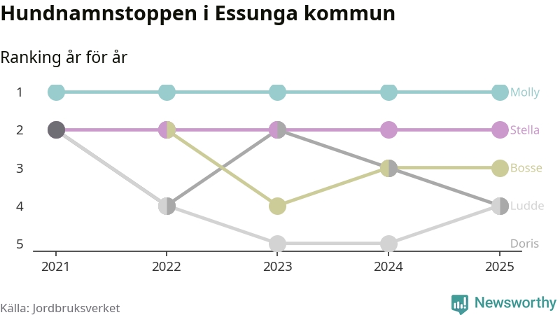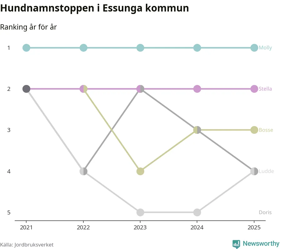 Molly toppar hundnamnsligan i Essunga kommun, precis som i landet som helhet. Det visar färsk statistik från Jordbruksverket. Här finns hela topplistan för kommunen.