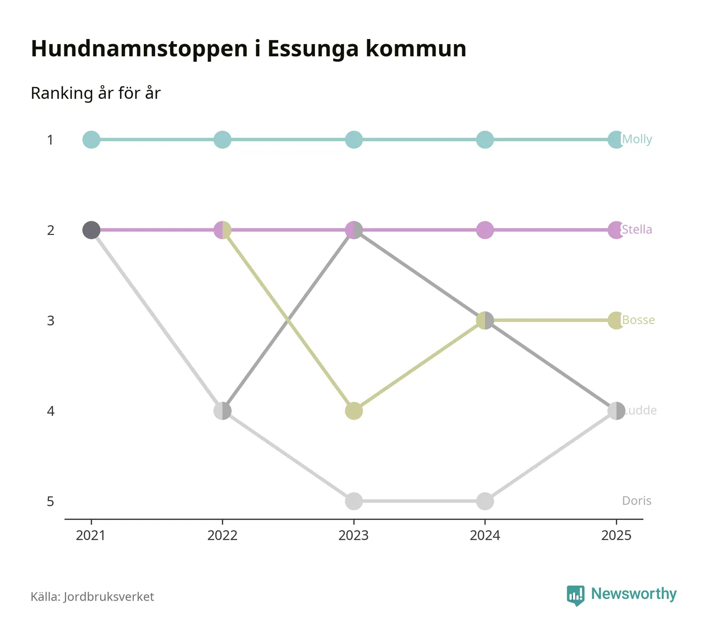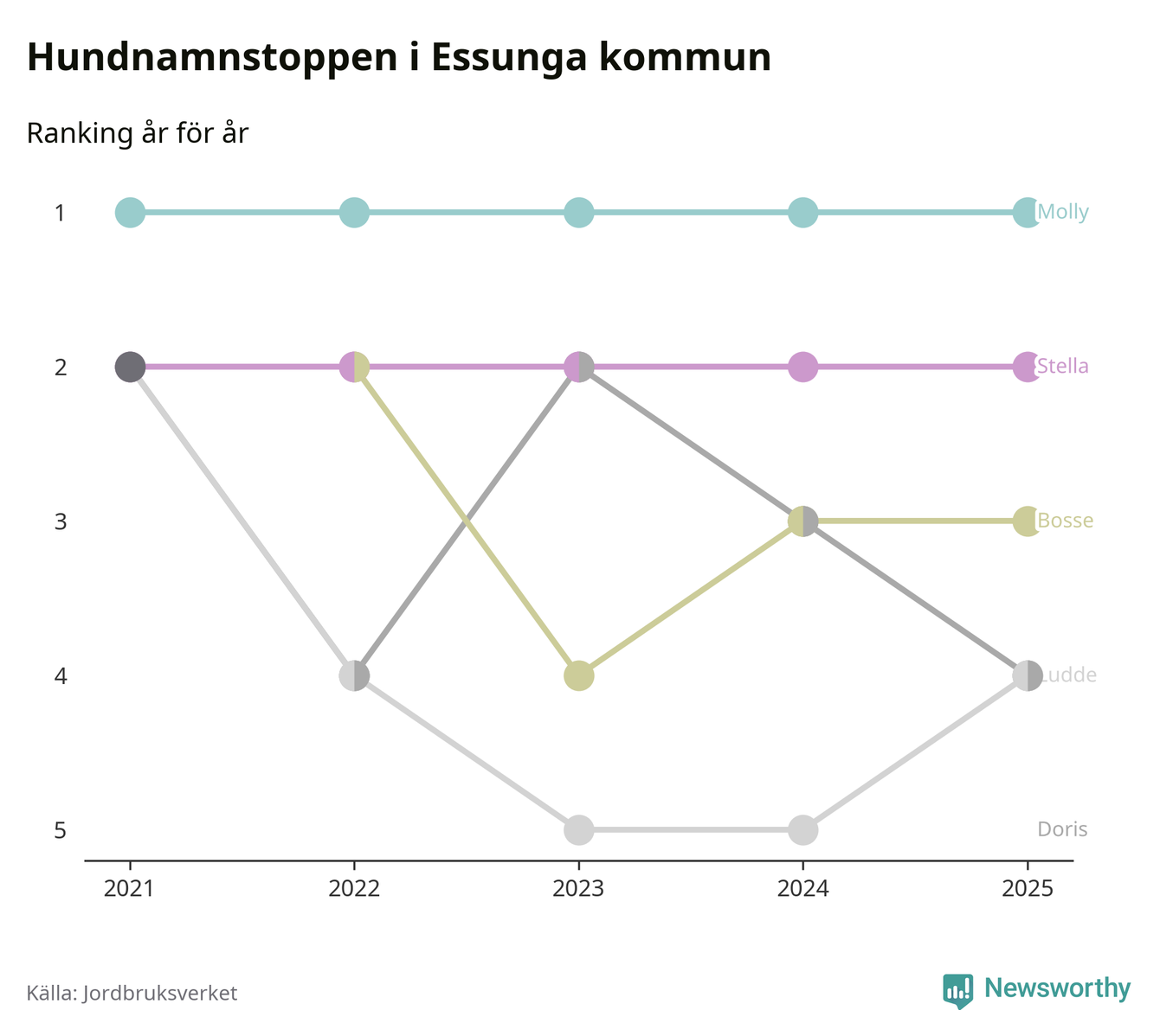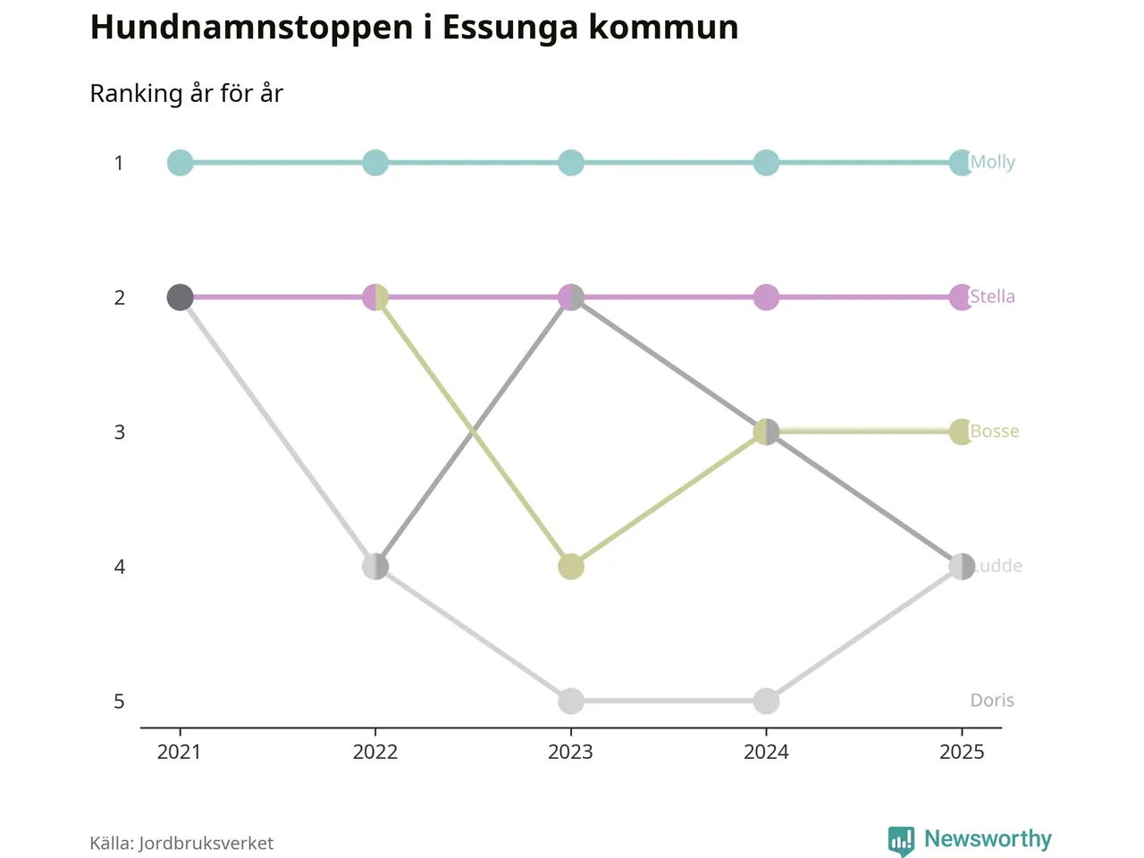 Molly toppar hundnamnsligan i Essunga kommun, precis som i landet som helhet. Det visar färsk statistik från Jordbruksverket. Här finns hela topplistan för kommunen.