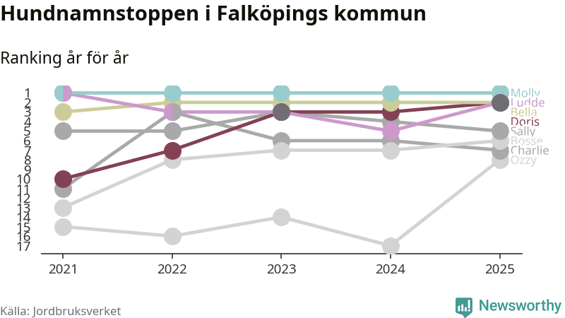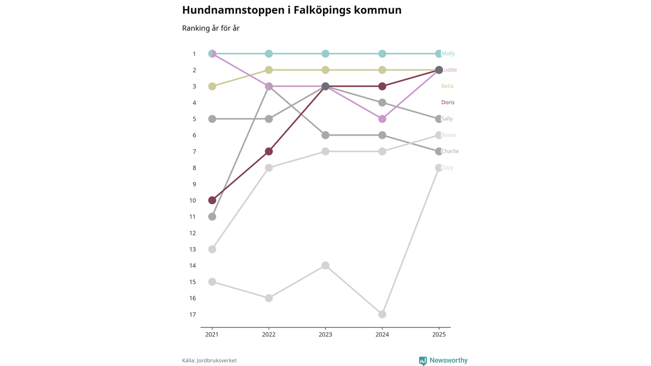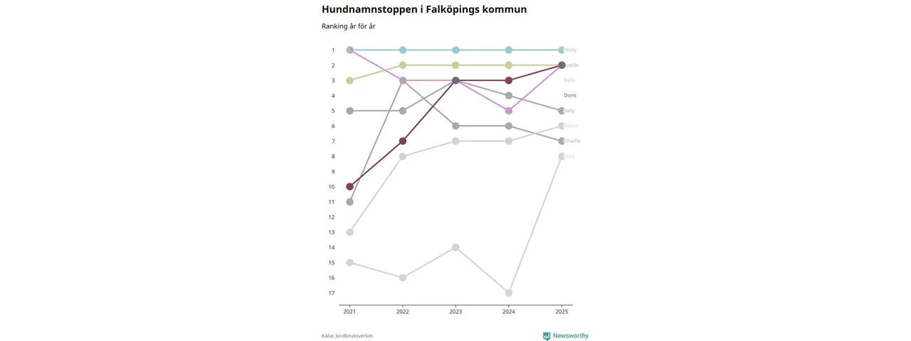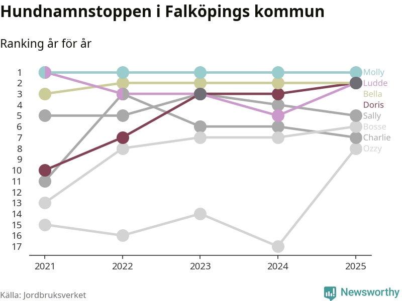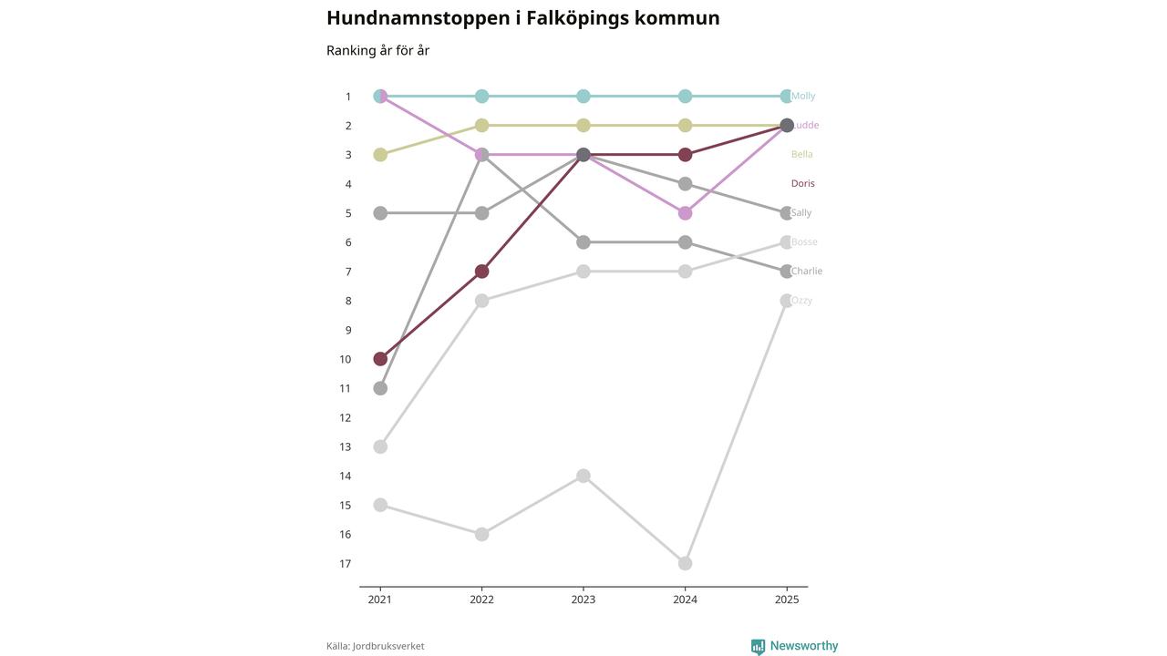 Molly toppar hundnamnsligan i Falköpings kommun, precis som i landet som helhet. Det visar färsk statistik från Jordbruksverket. Här finns hela topplistan för kommunen.