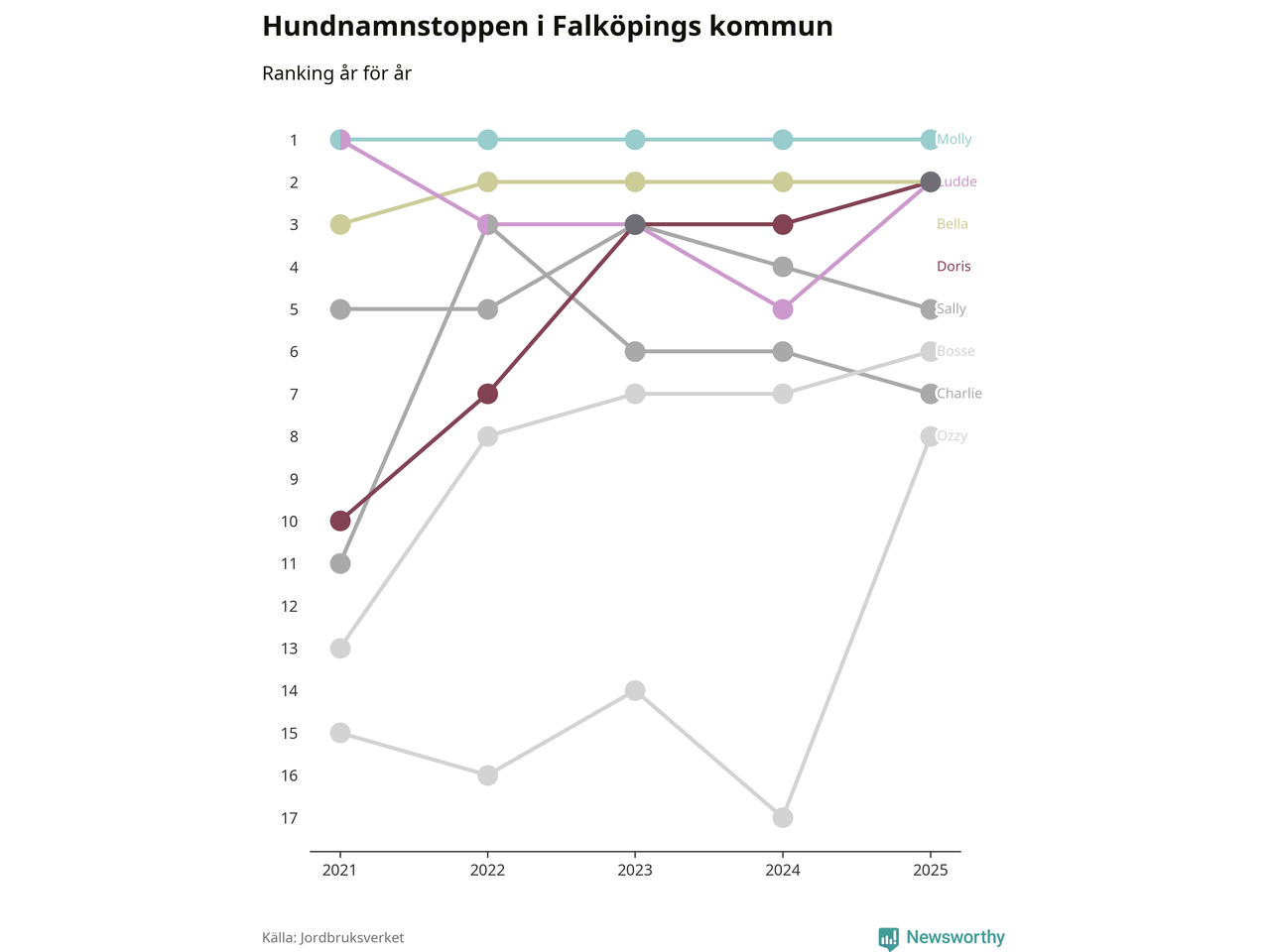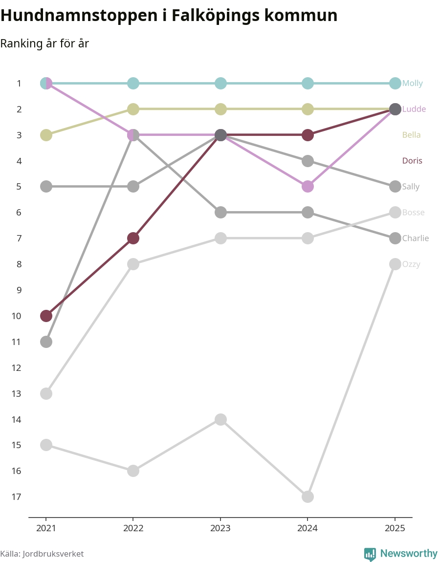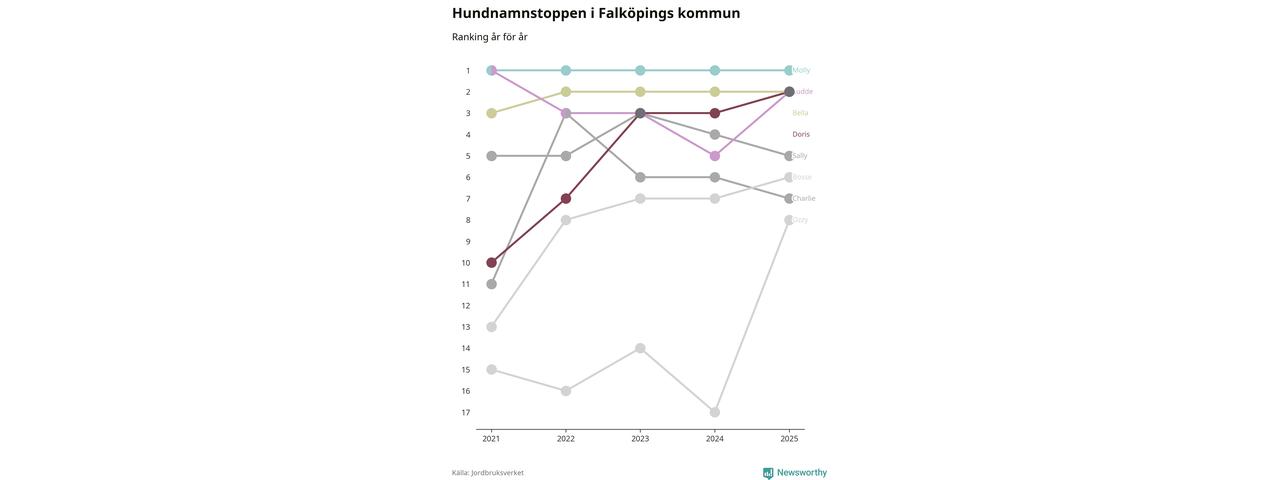 I hela landet är Molly det ohotat populäraste tilltalsnamnet för hundar sedan flera år, följt av Bella och Charlie. Något av de tre namnen toppar listan i 243 av 290 kommuner, och de har varit de vanligaste namnen sedan åtminstone 2018. Men det fjärde populäraste namnet, Doris, knappade in på ledartrion och kommer snart kunna utmana Charlie om tredjeplatsen, om trenden håller i sig.