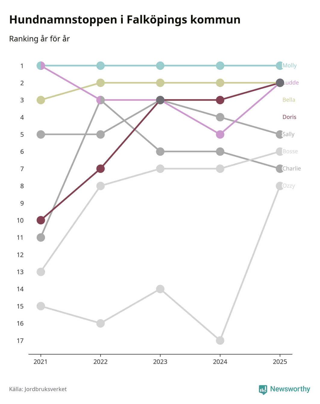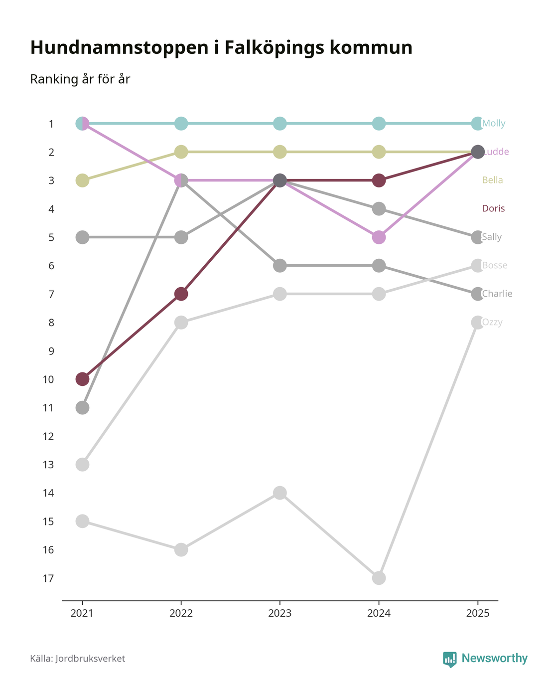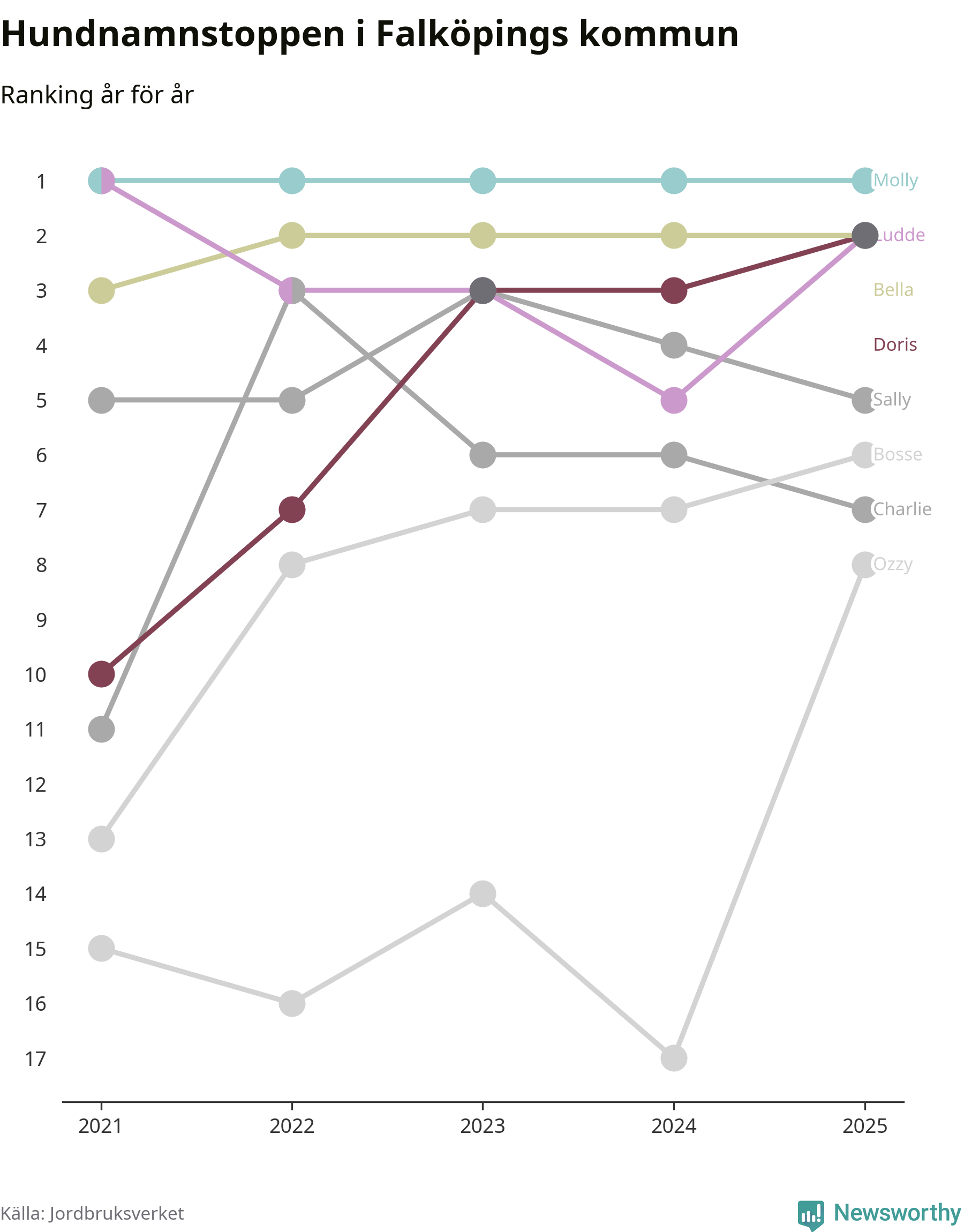 I hela landet är Molly det ohotat populäraste tilltalsnamnet för hundar sedan flera år, följt av Bella och Charlie. Något av de tre namnen toppar listan i 243 av 290 kommuner, och de har varit de vanligaste namnen sedan åtminstone 2018. Men det fjärde populäraste namnet, Doris, knappade in på ledartrion och kommer snart kunna utmana Charlie om tredjeplatsen, om trenden håller i sig.