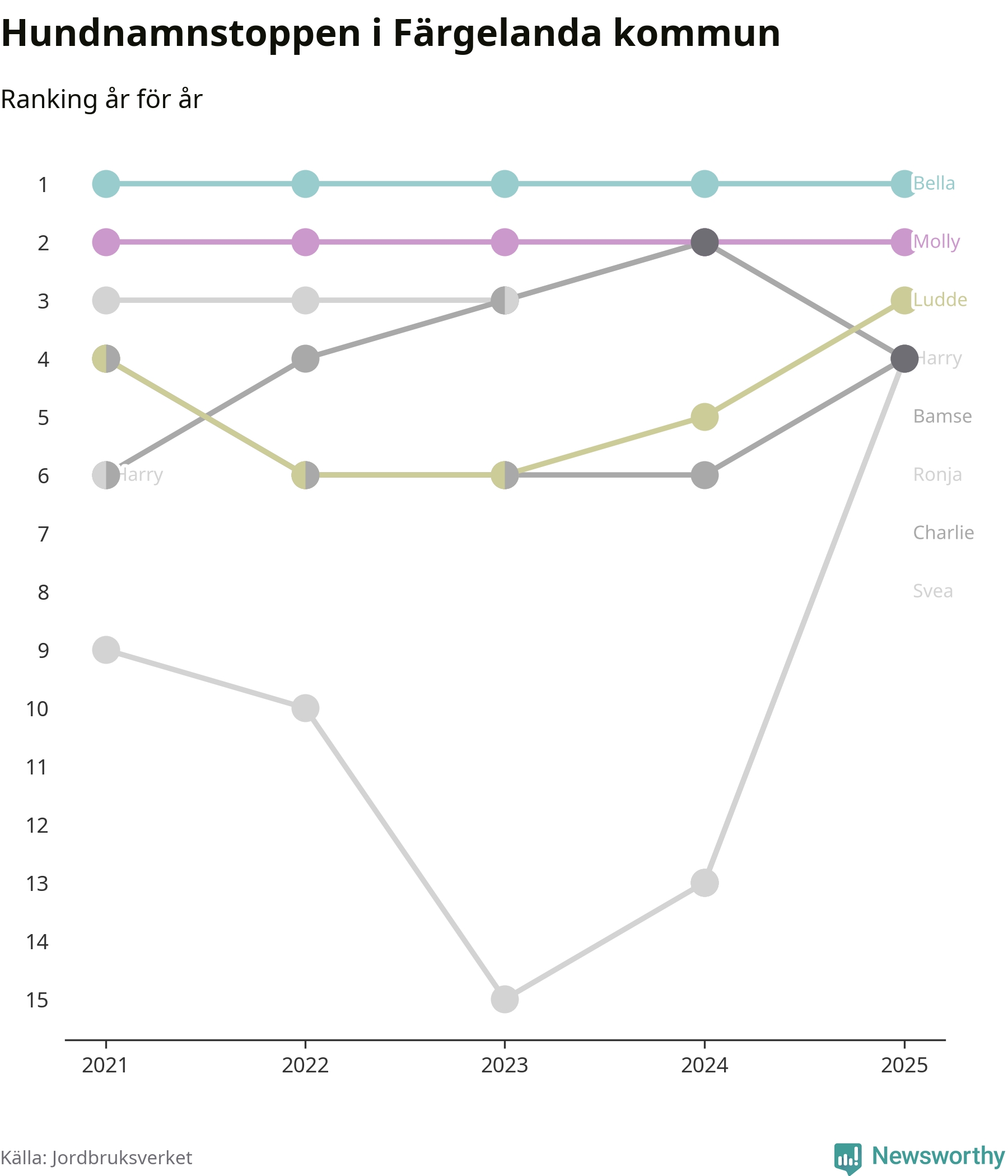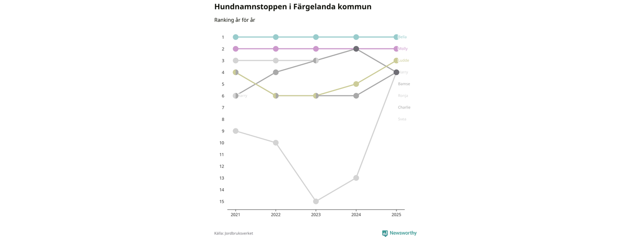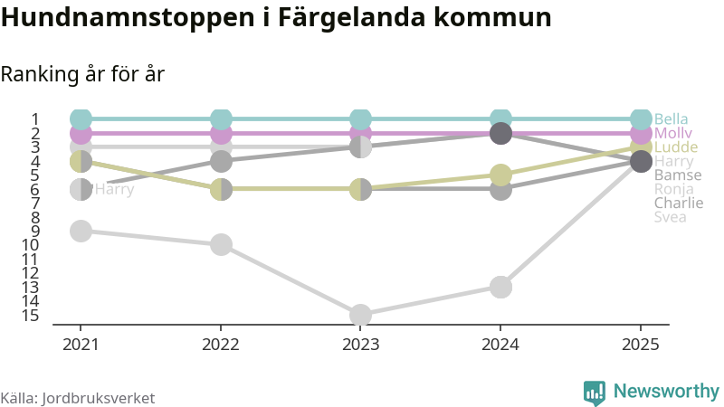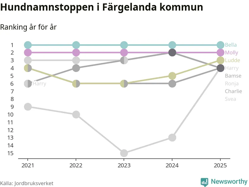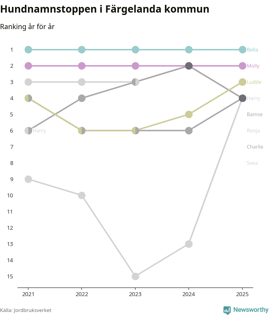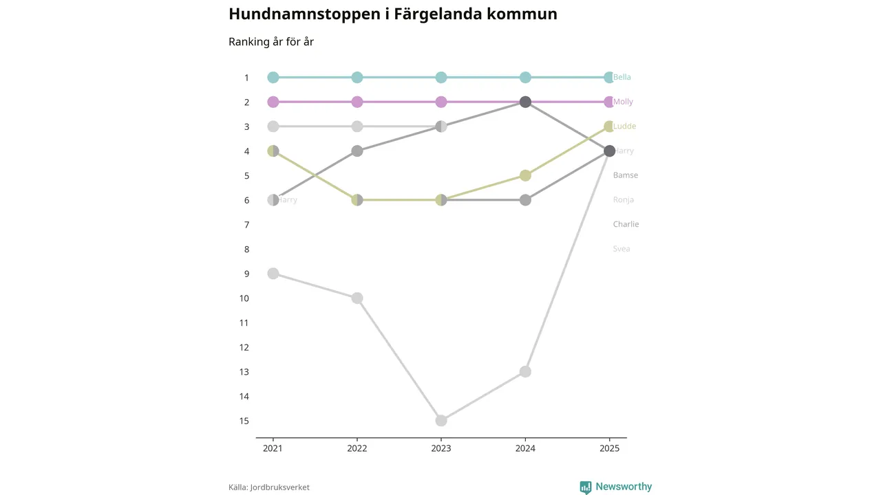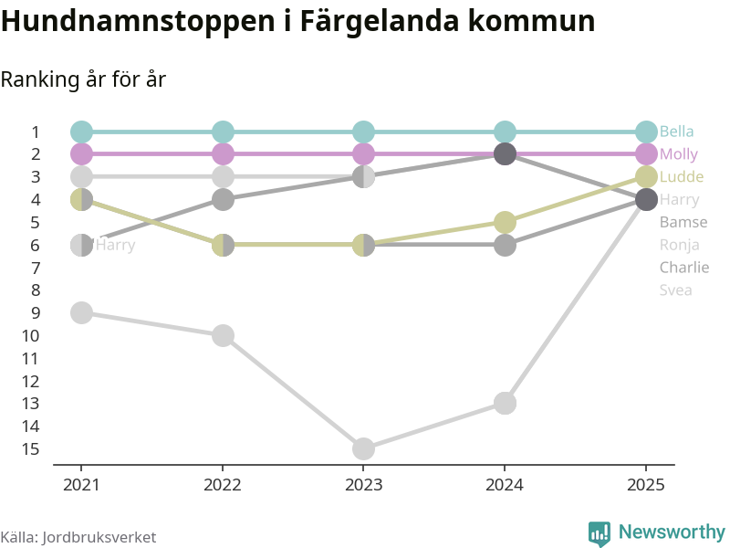 Molly är fortsatt ohotad etta bland hundnamnen i Sverige, följt av Bella och Charlie. Så har det sett ut flera år i rad, men bland Färgelandahundarna är Bella populärast.