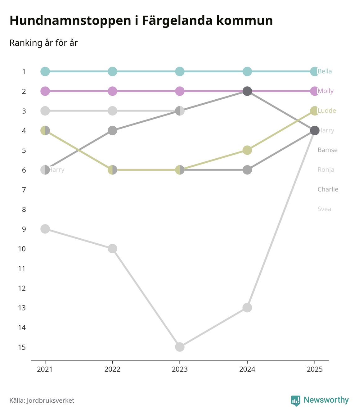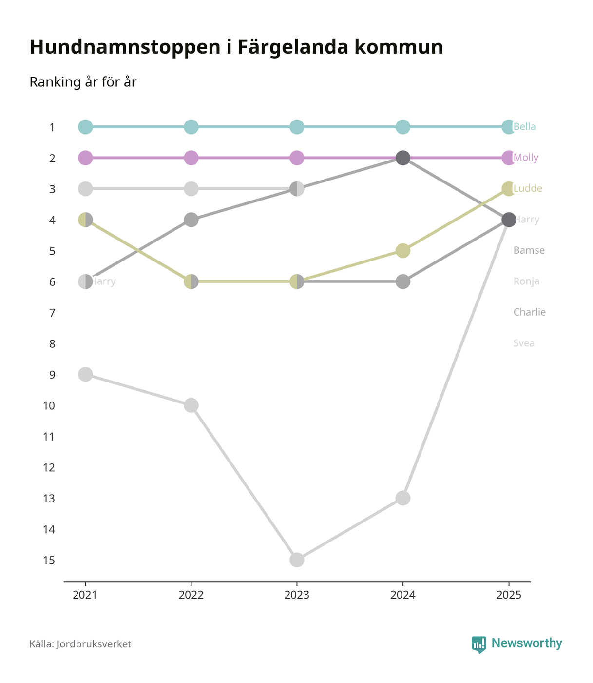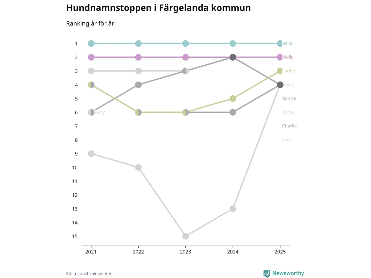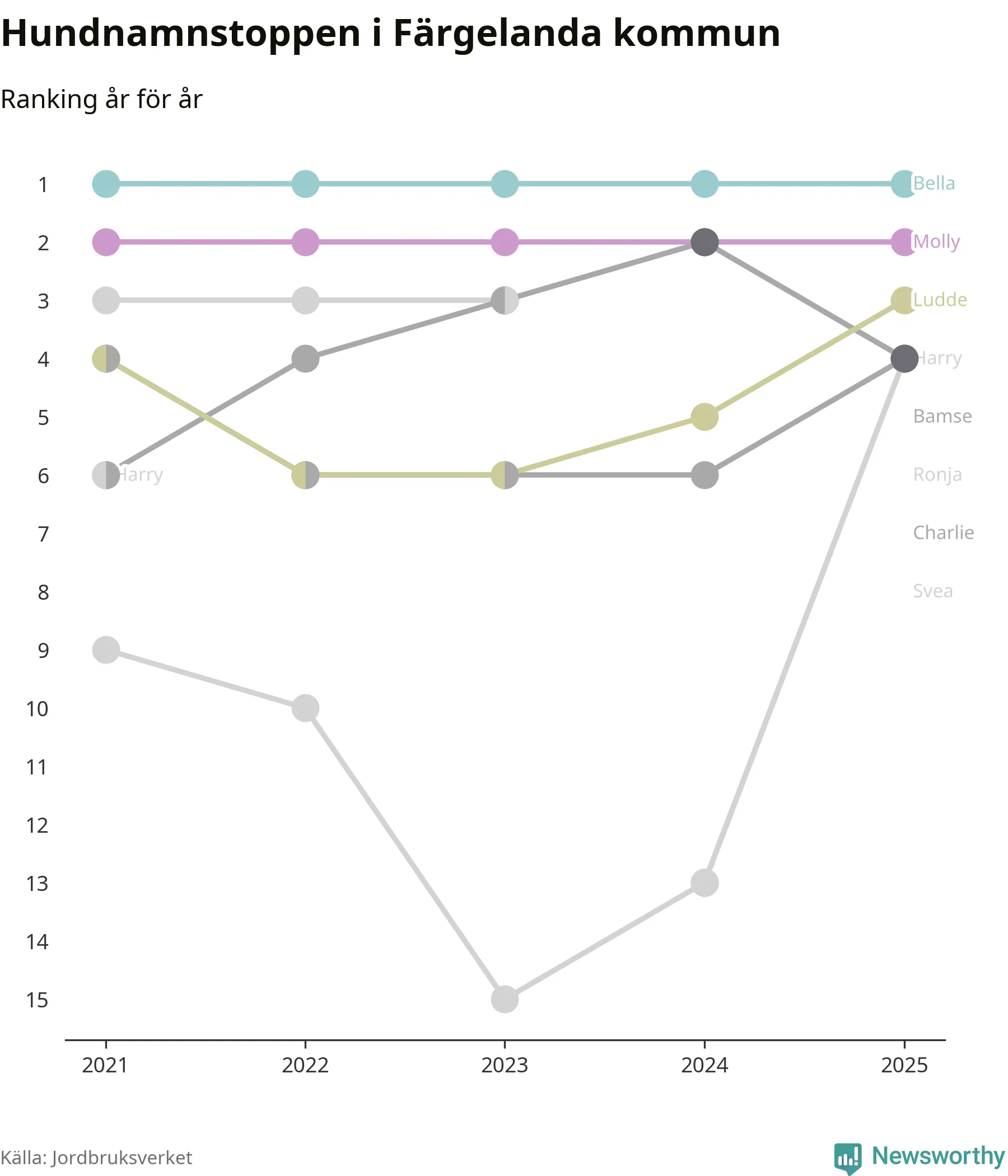 Molly är fortsatt ohotad etta bland hundnamnen i Sverige, följt av Bella och Charlie. Så har det sett ut flera år i rad, men bland Färgelandahundarna är Bella populärast.