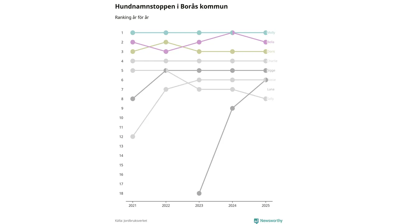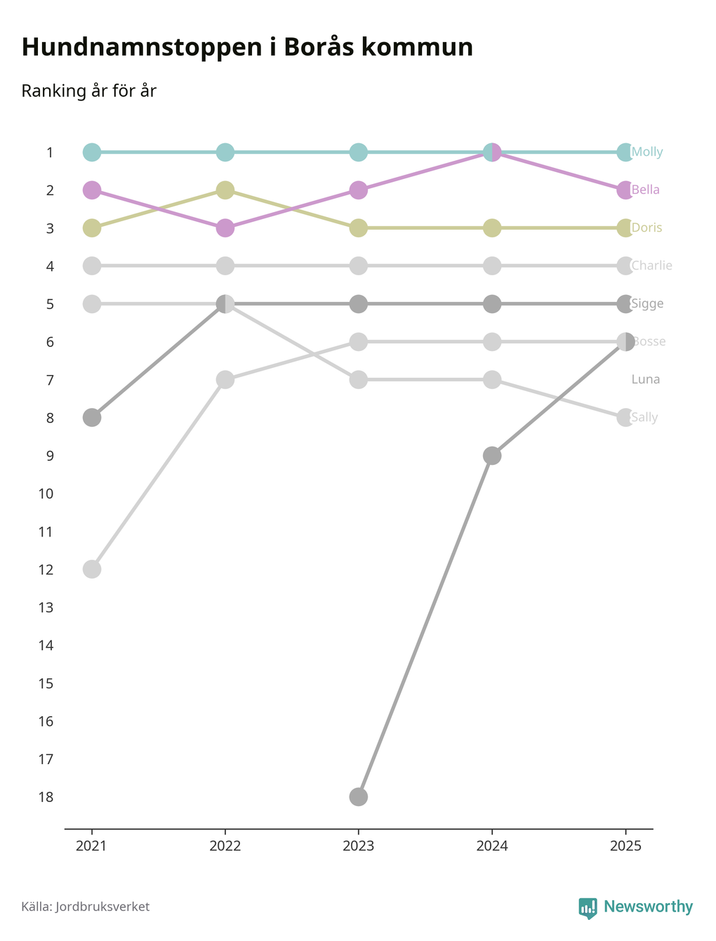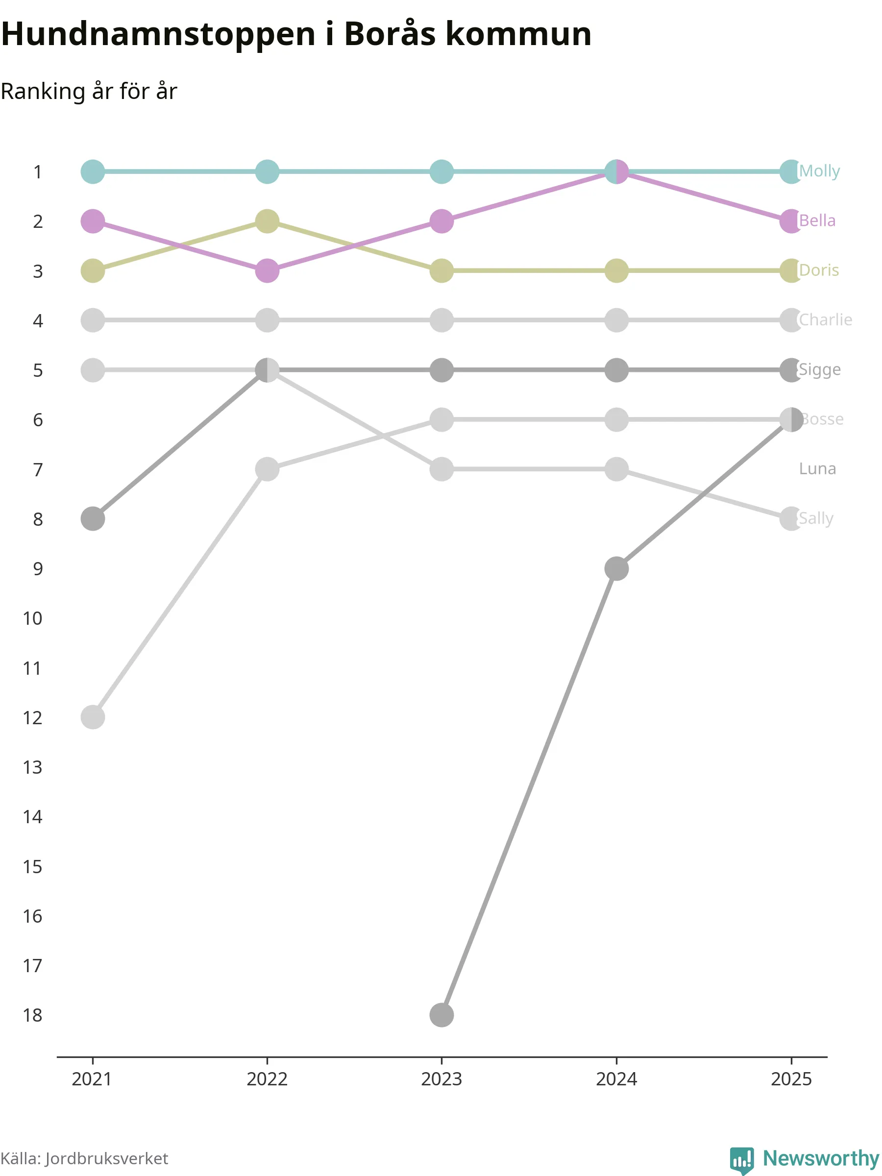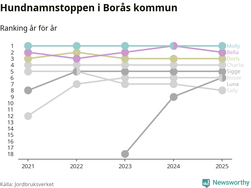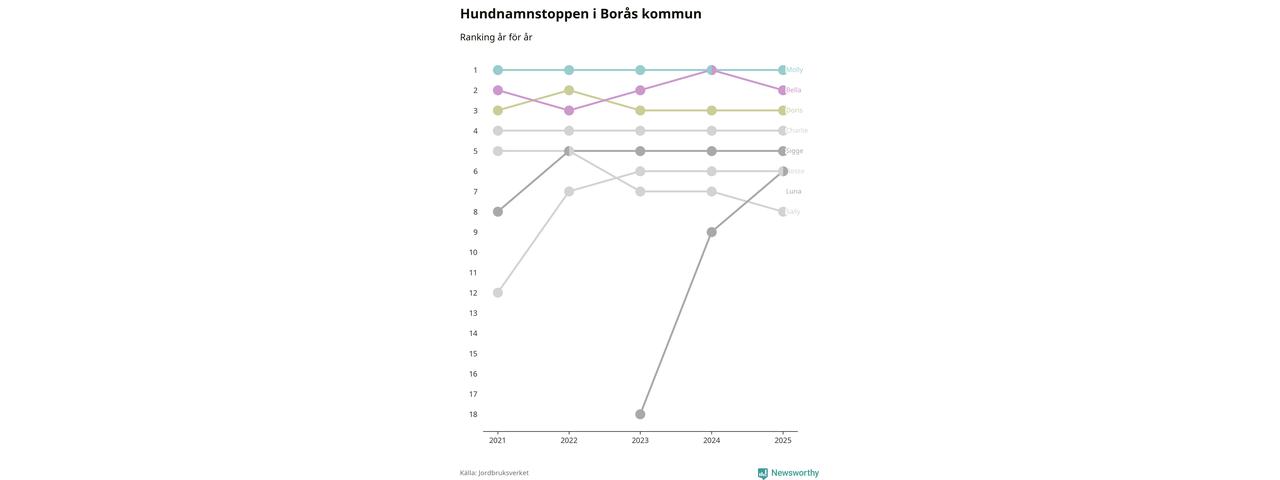 Molly toppar hundnamnsligan i Borås kommun, precis som i landet som helhet. Det visar färsk statistik från Jordbruksverket. Här finns hela topplistan för kommunen.
