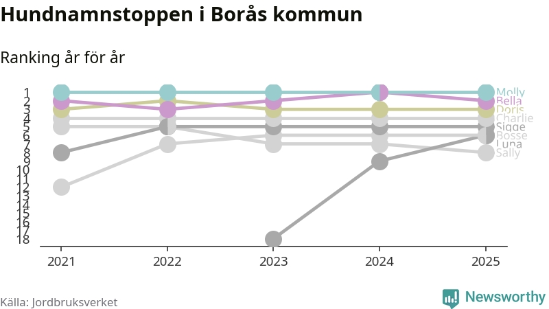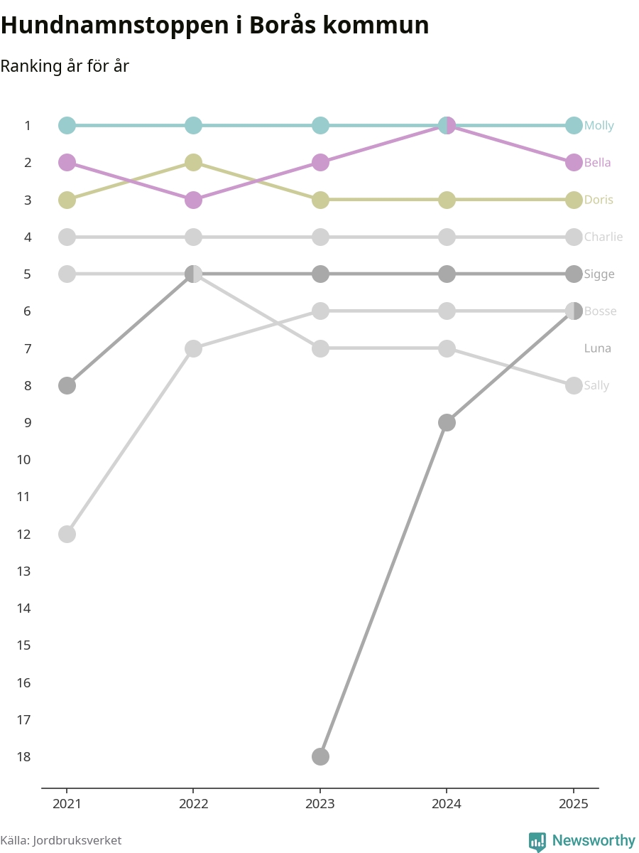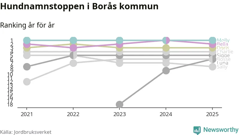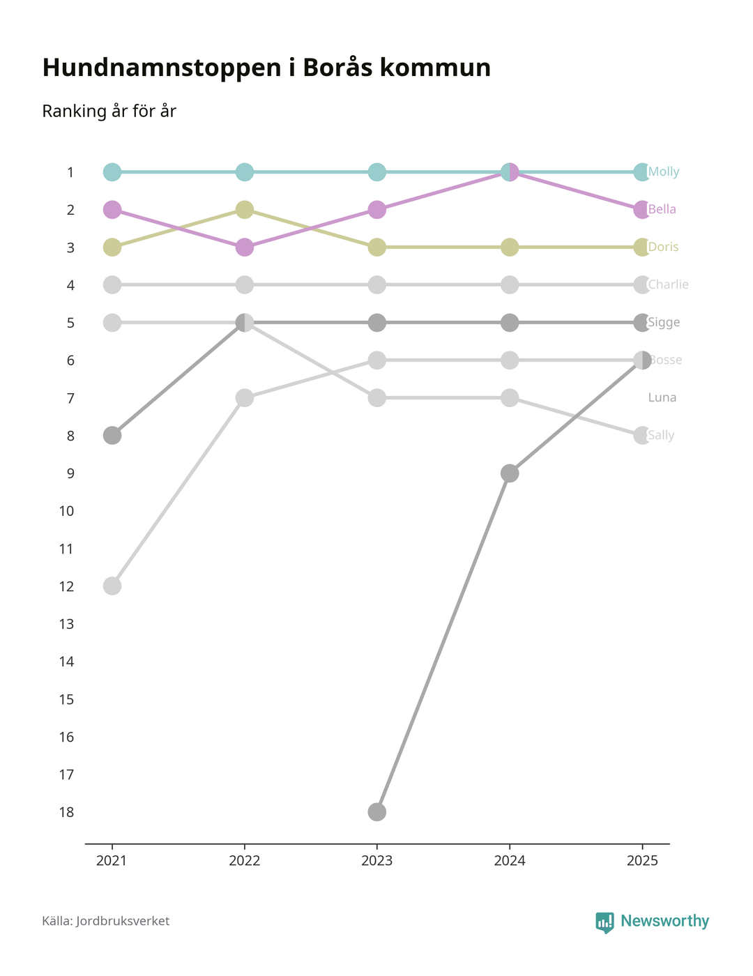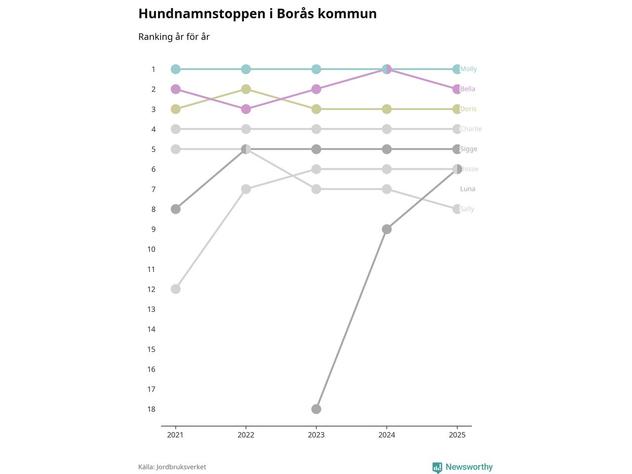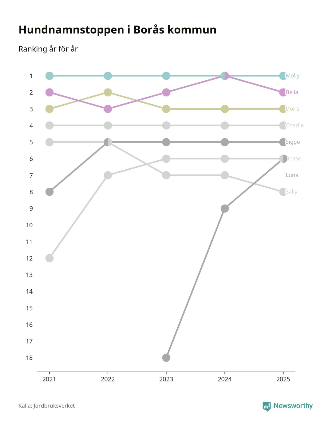 Molly toppar hundnamnsligan i Borås kommun, precis som i landet som helhet. Det visar färsk statistik från Jordbruksverket. Här finns hela topplistan för kommunen.