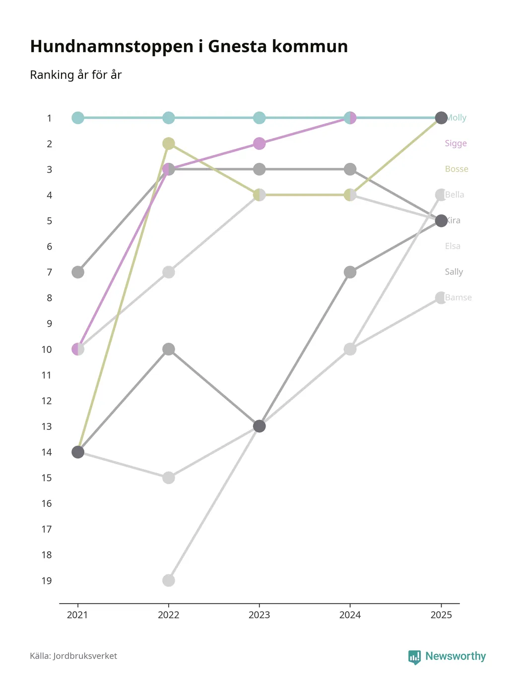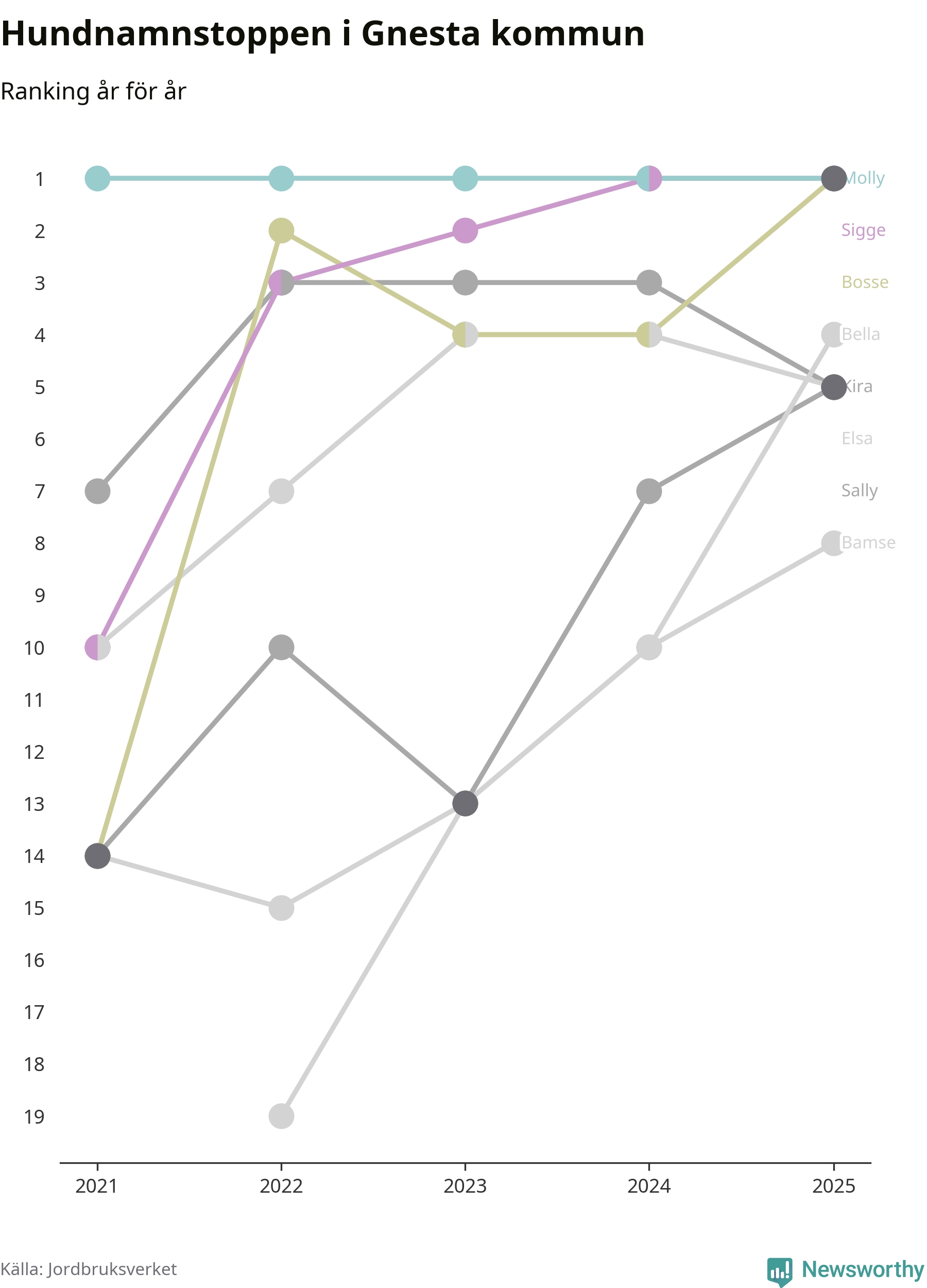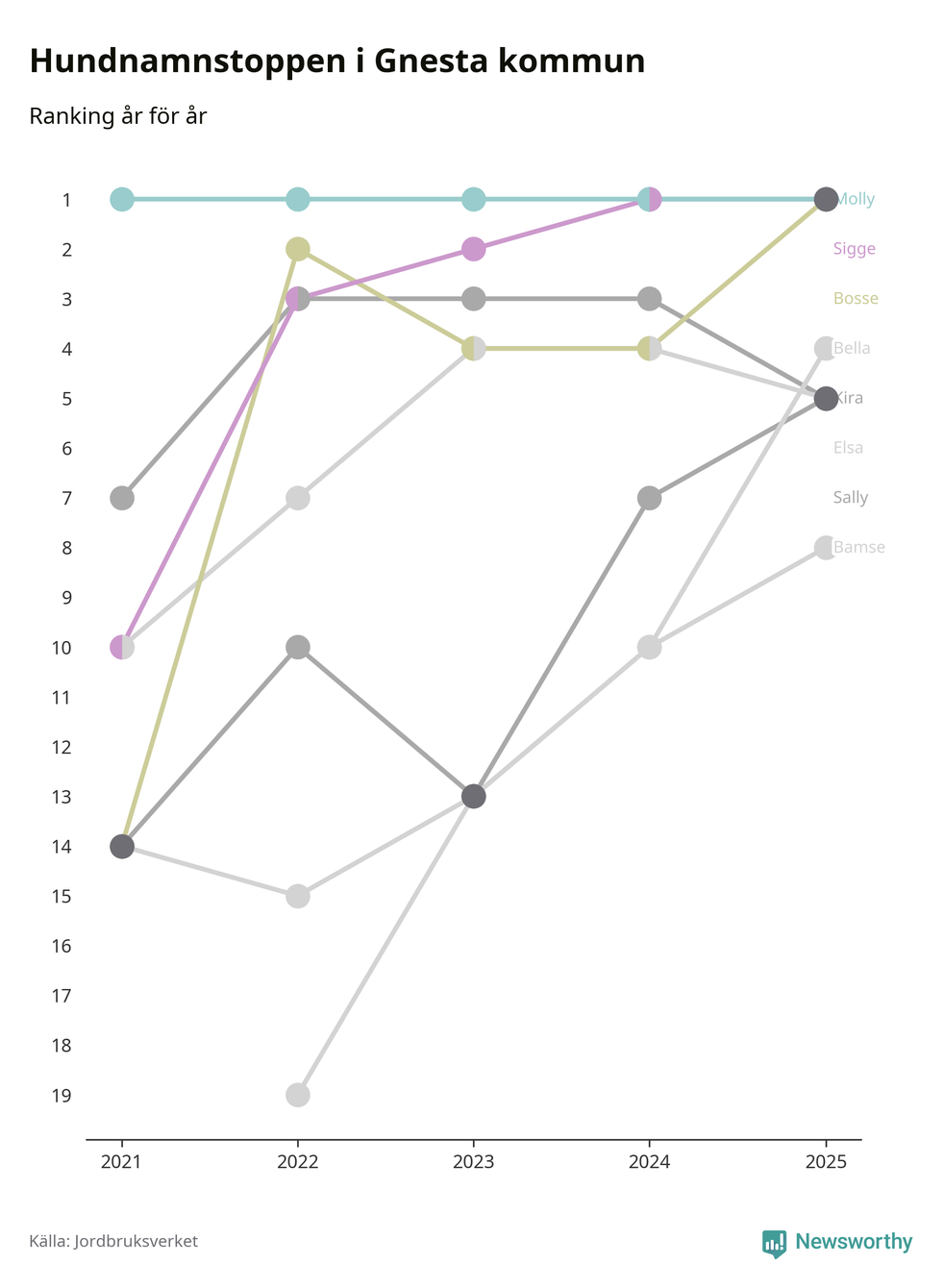 Molly är fortsatt ohotad etta bland hundnamnen i Sverige, följt av Bella och Charlie. Så har det sett ut flera år i rad, och även bland Gnestahundarna ligger Molly i topp, tillsammans med Sigge och Bosse.