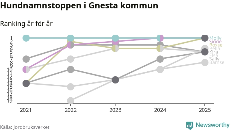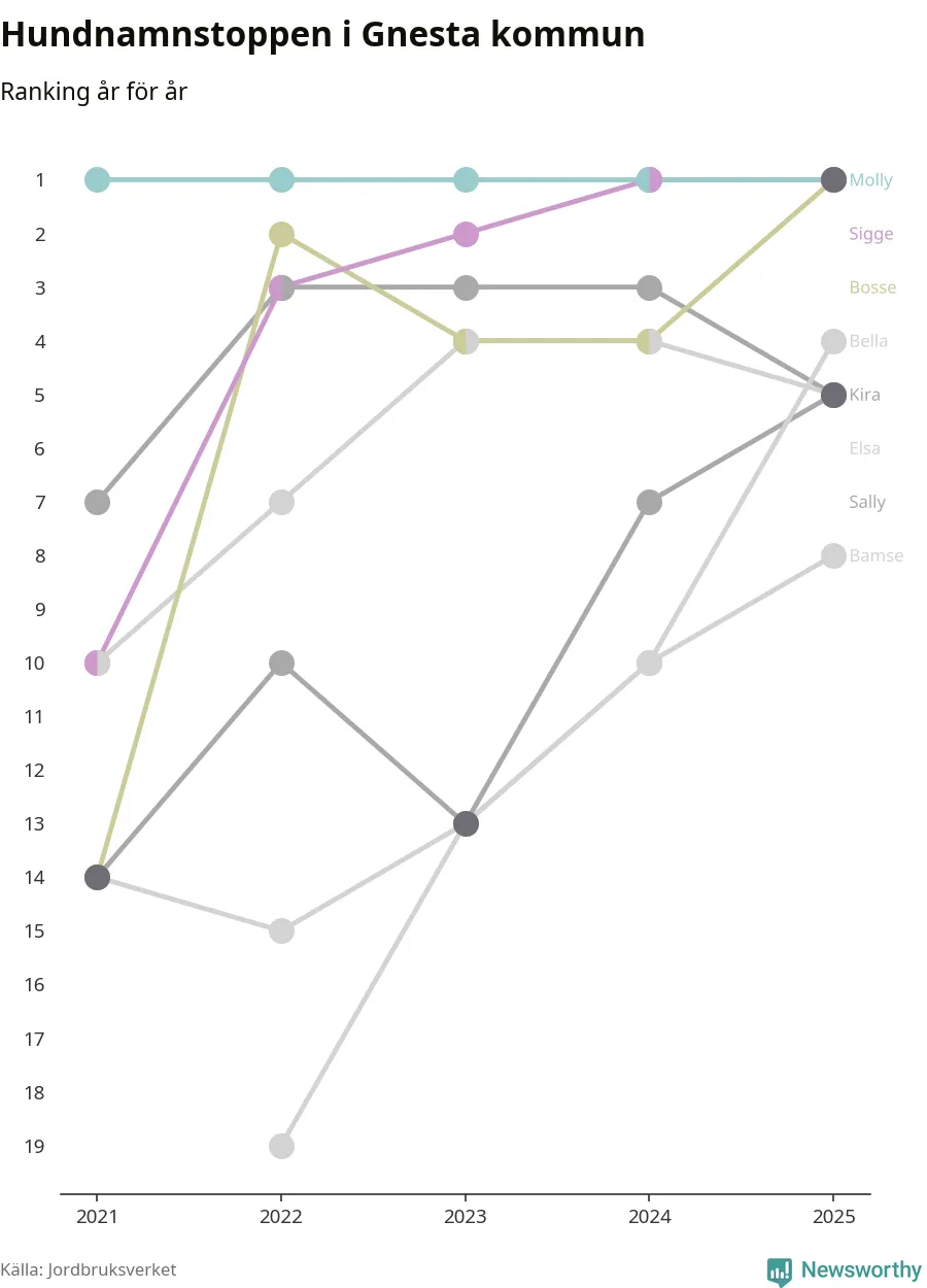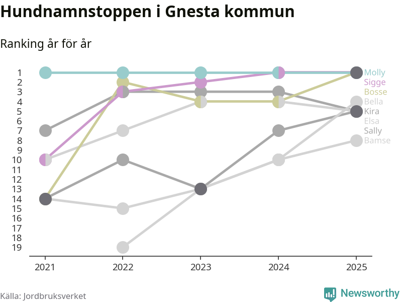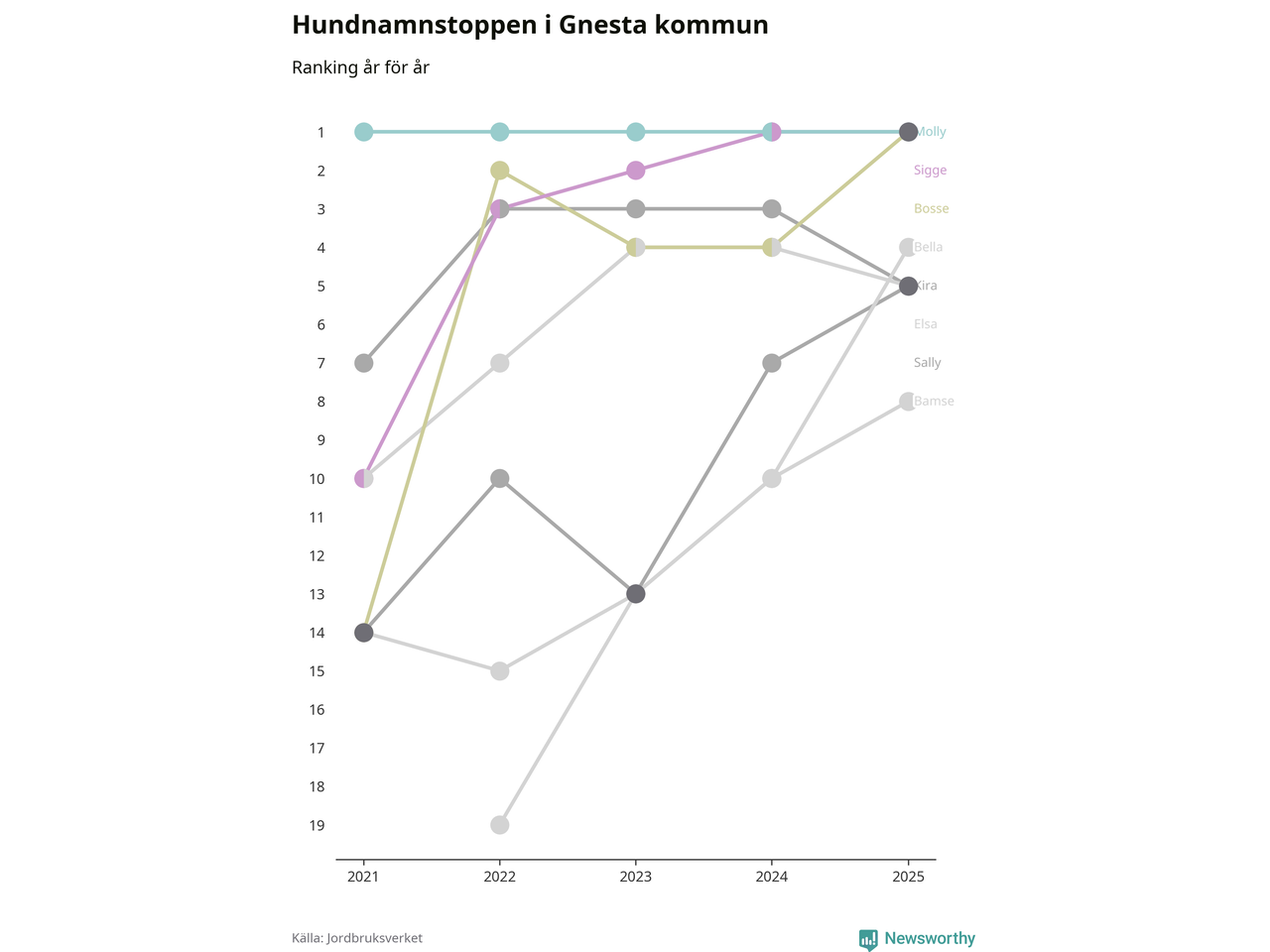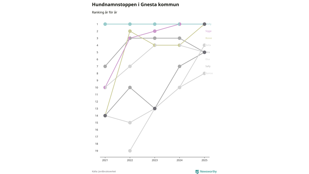 Molly är fortsatt ohotad etta bland hundnamnen i Sverige, följt av Bella och Charlie. Så har det sett ut flera år i rad, och även bland Gnestahundarna ligger Molly i topp, tillsammans med Sigge och Bosse.