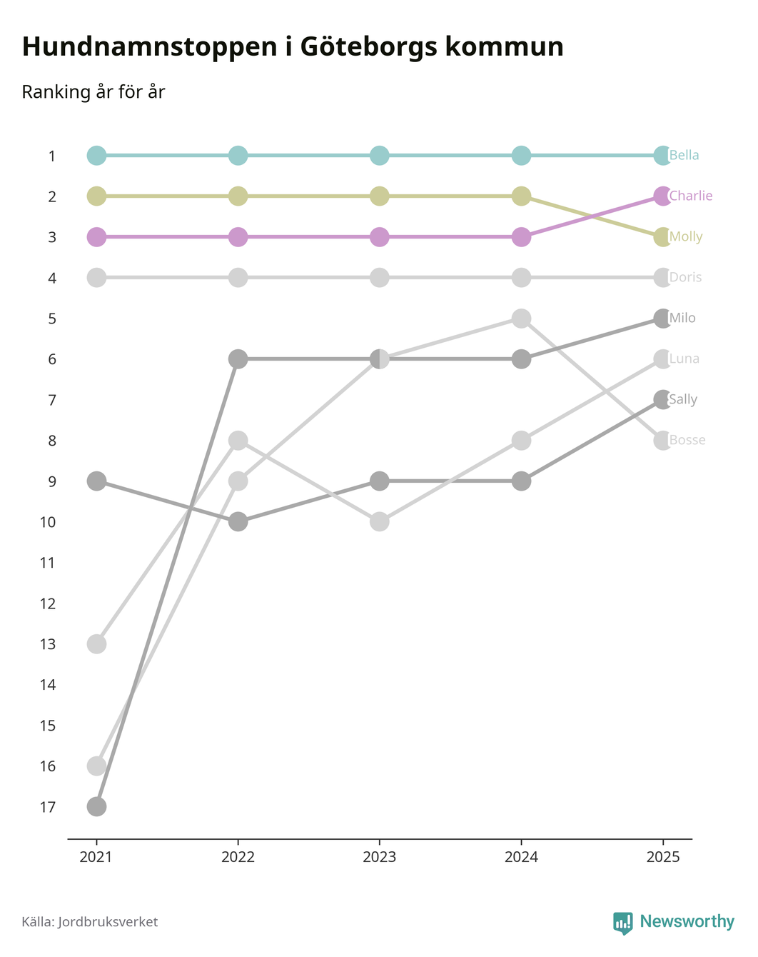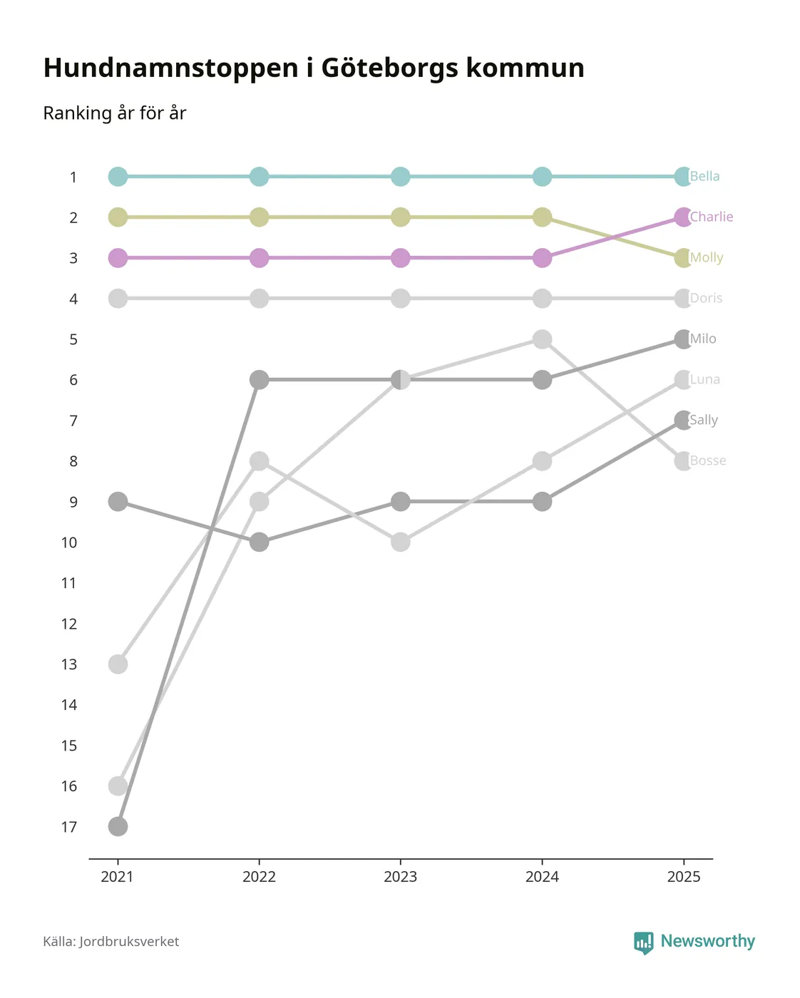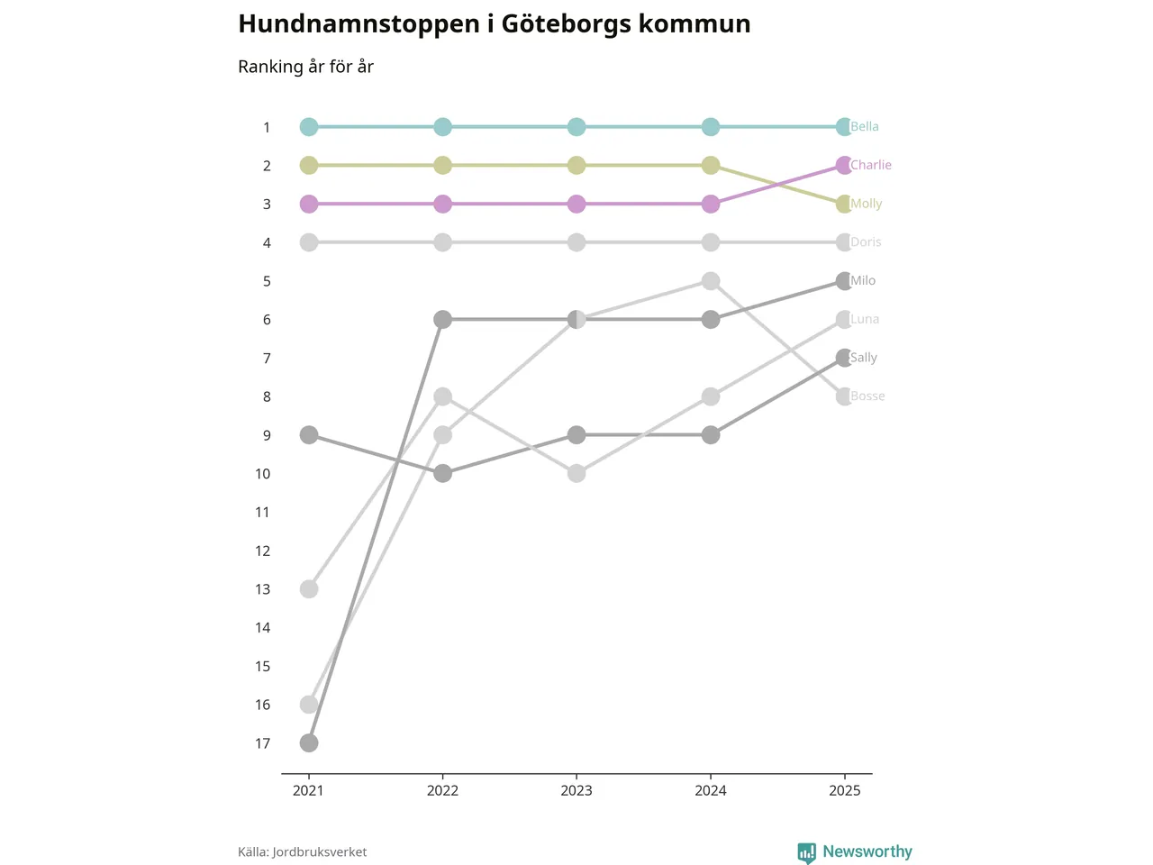 I hela landet är Molly det ohotat populäraste tilltalsnamnet för hundar sedan flera år, följt av Bella och Charlie. Något av de tre namnen toppar listan i 243 av 290 kommuner, och de har varit de vanligaste namnen sedan åtminstone 2018. Men det fjärde populäraste namnet, Doris, knappade in på ledartrion och kommer snart kunna utmana Charlie om tredjeplatsen, om trenden håller i sig.