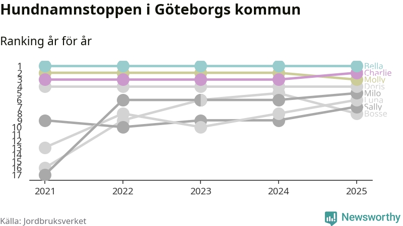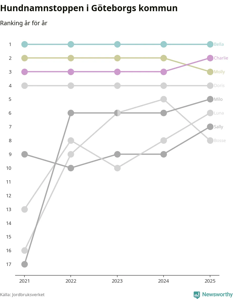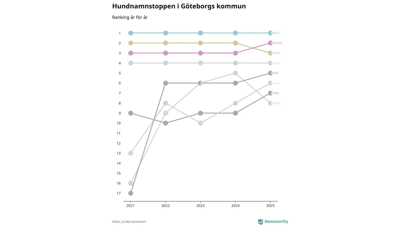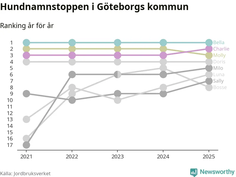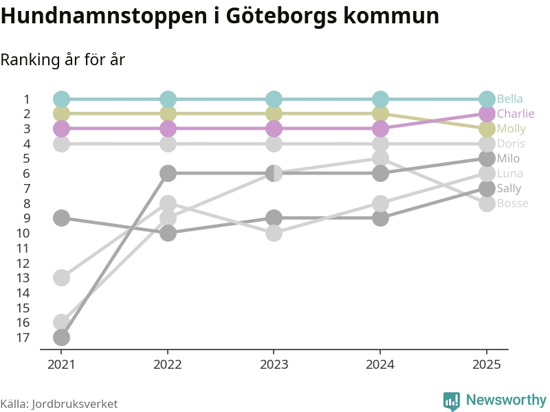 I hela landet är Molly det ohotat populäraste tilltalsnamnet för hundar sedan flera år, följt av Bella och Charlie. Något av de tre namnen toppar listan i 243 av 290 kommuner, och de har varit de vanligaste namnen sedan åtminstone 2018. Men det fjärde populäraste namnet, Doris, knappade in på ledartrion och kommer snart kunna utmana Charlie om tredjeplatsen, om trenden håller i sig.
