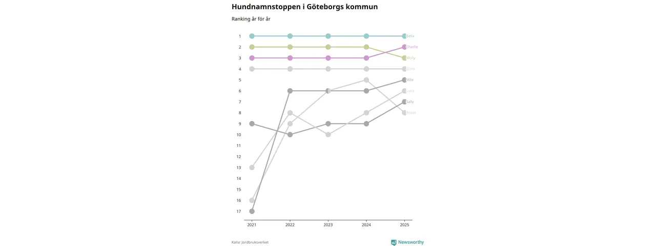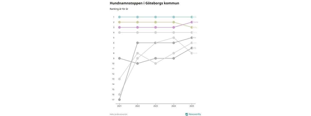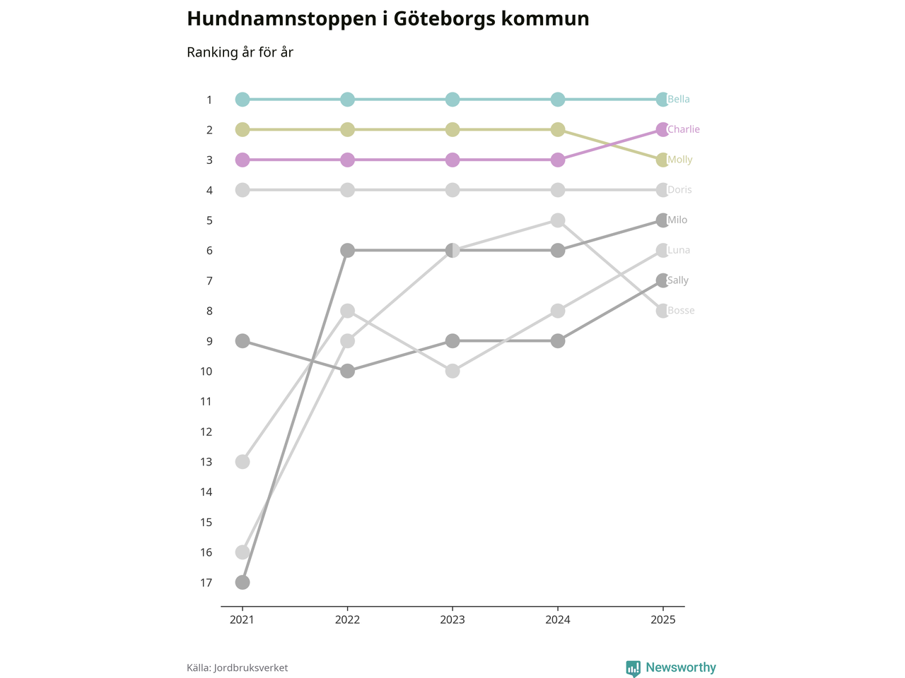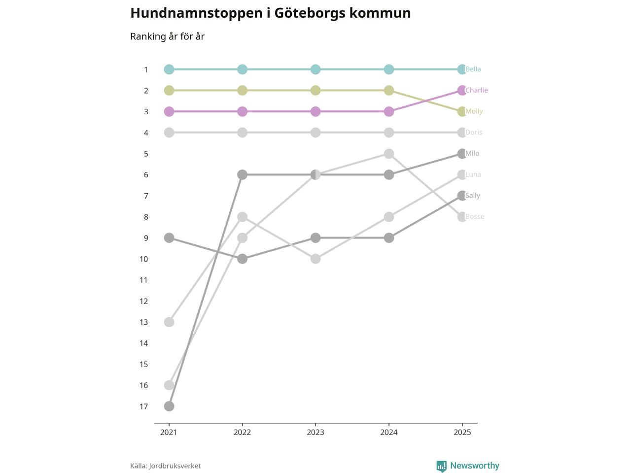 Molly är fortsatt ohotad etta bland hundnamnen i Sverige, följt av Bella och Charlie. Så har det sett ut flera år i rad, men bland Göteborgshundarna är Bella populärast.