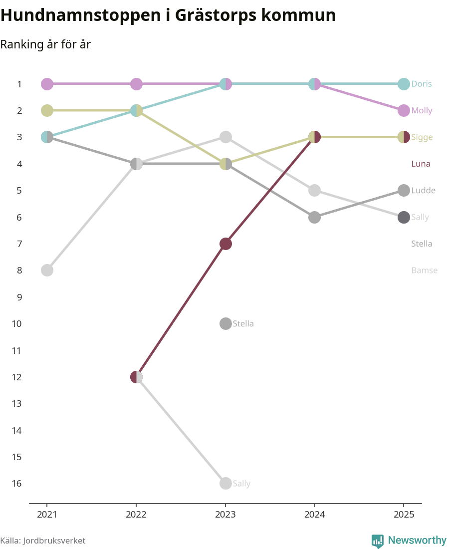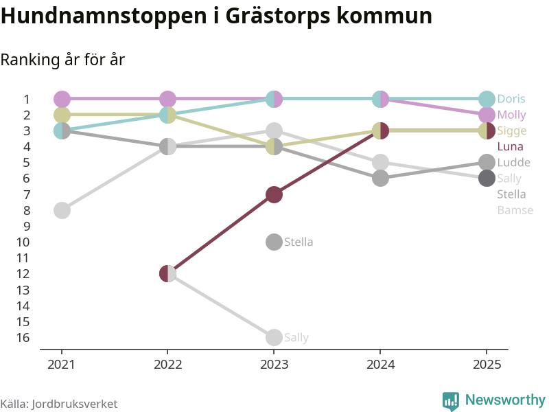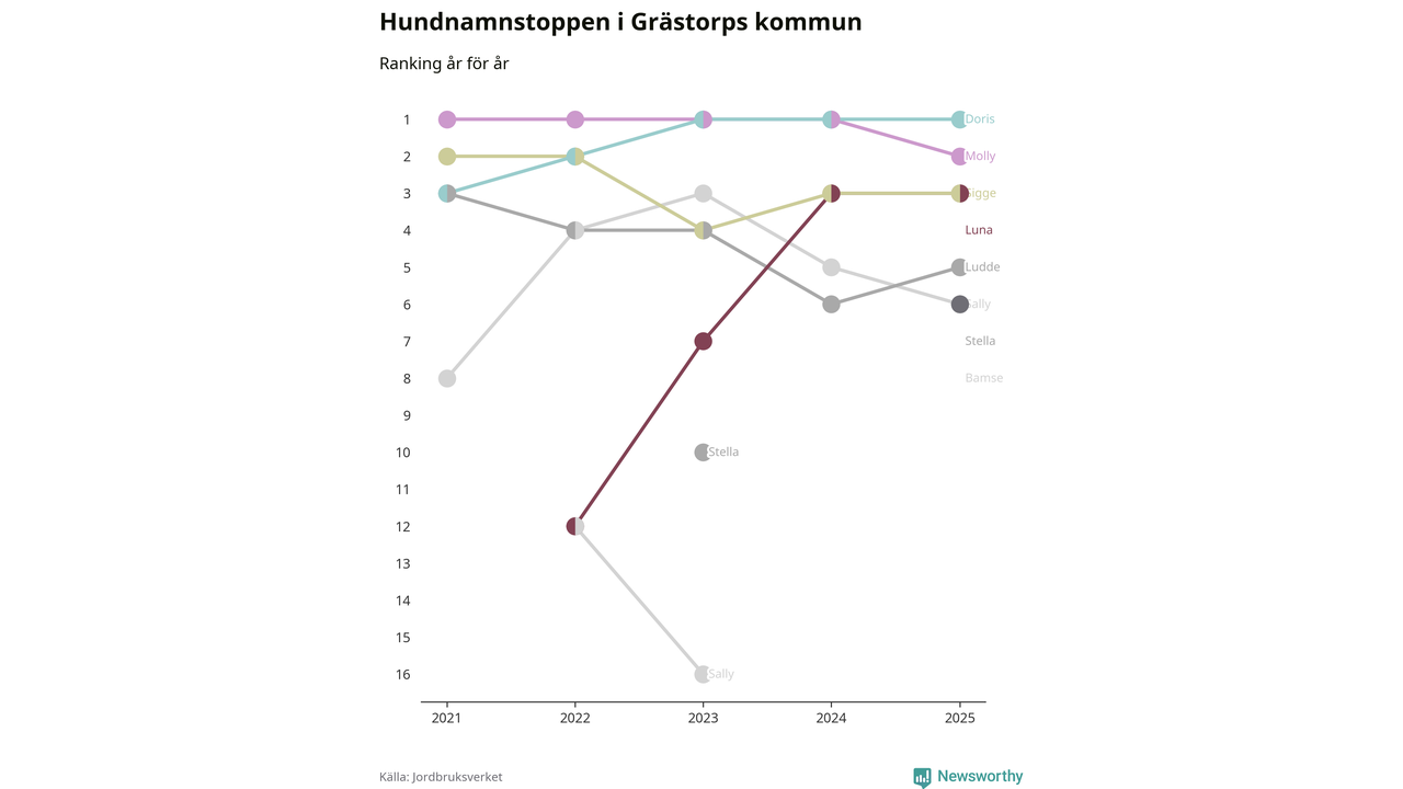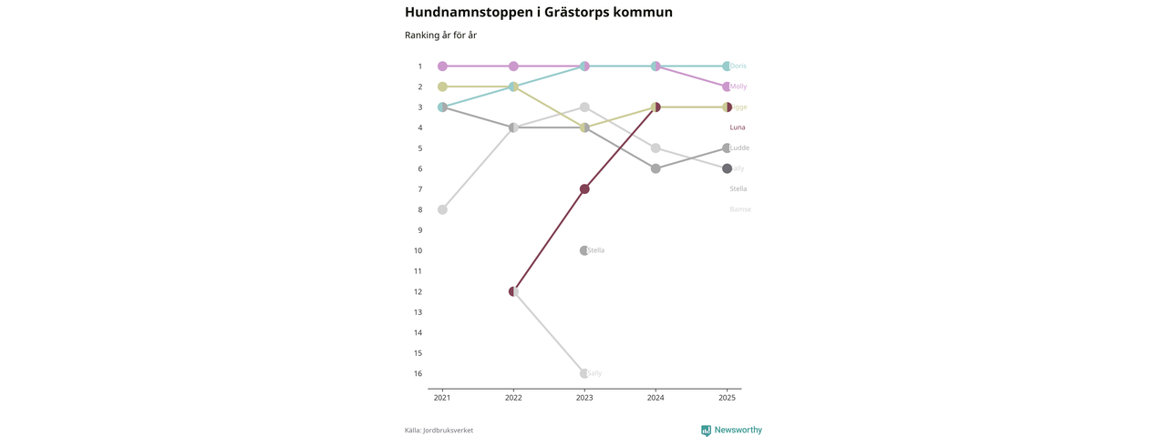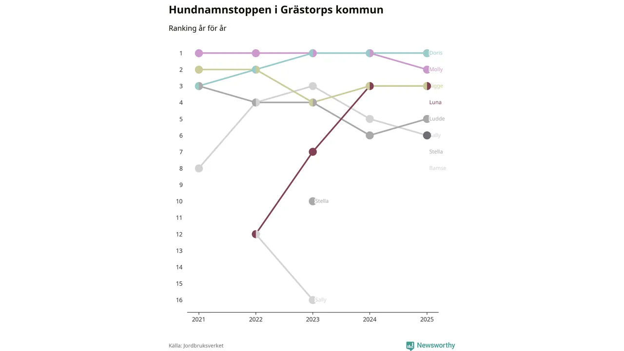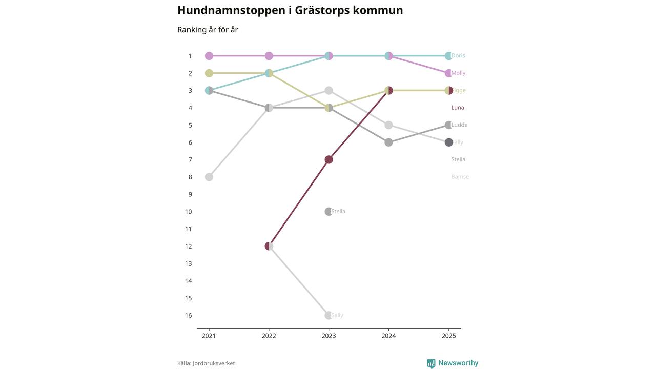 Molly är fortsatt ohotad etta bland hundnamnen i Sverige, följt av Bella och Charlie. Så har det sett ut flera år i rad, men bland Grästorpshundarna är Doris populärast. Det gör Grästorp till en av få kommuner i landet där toppnamnet inte hör till de tre vanligaste (Molly, Bella eller Charlie).