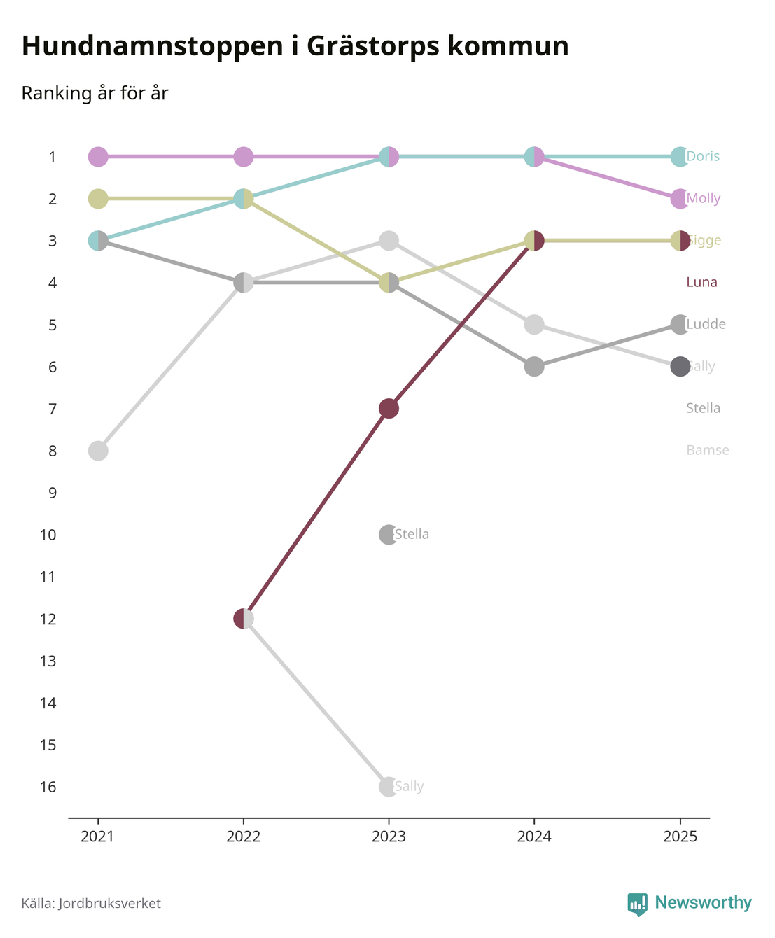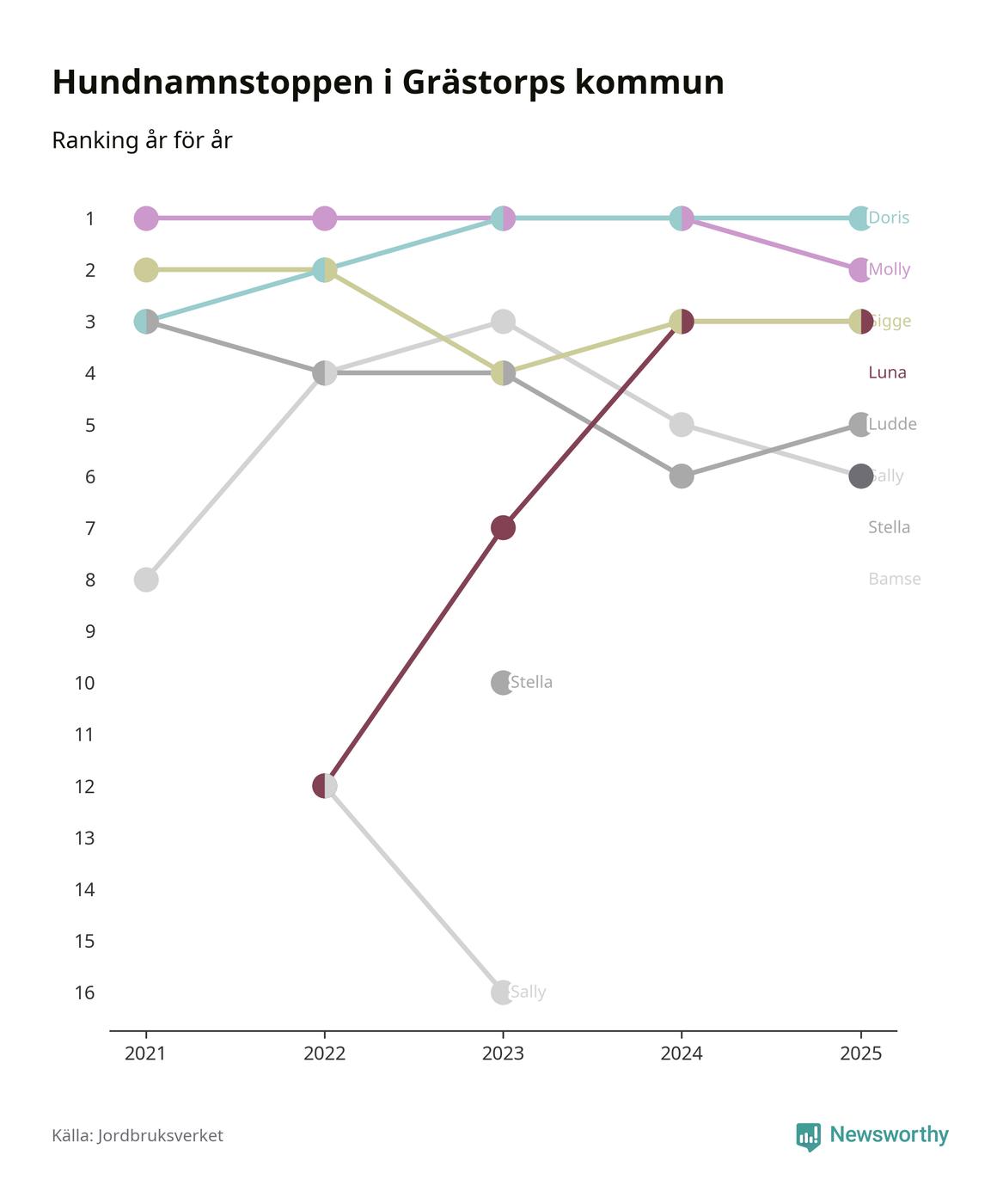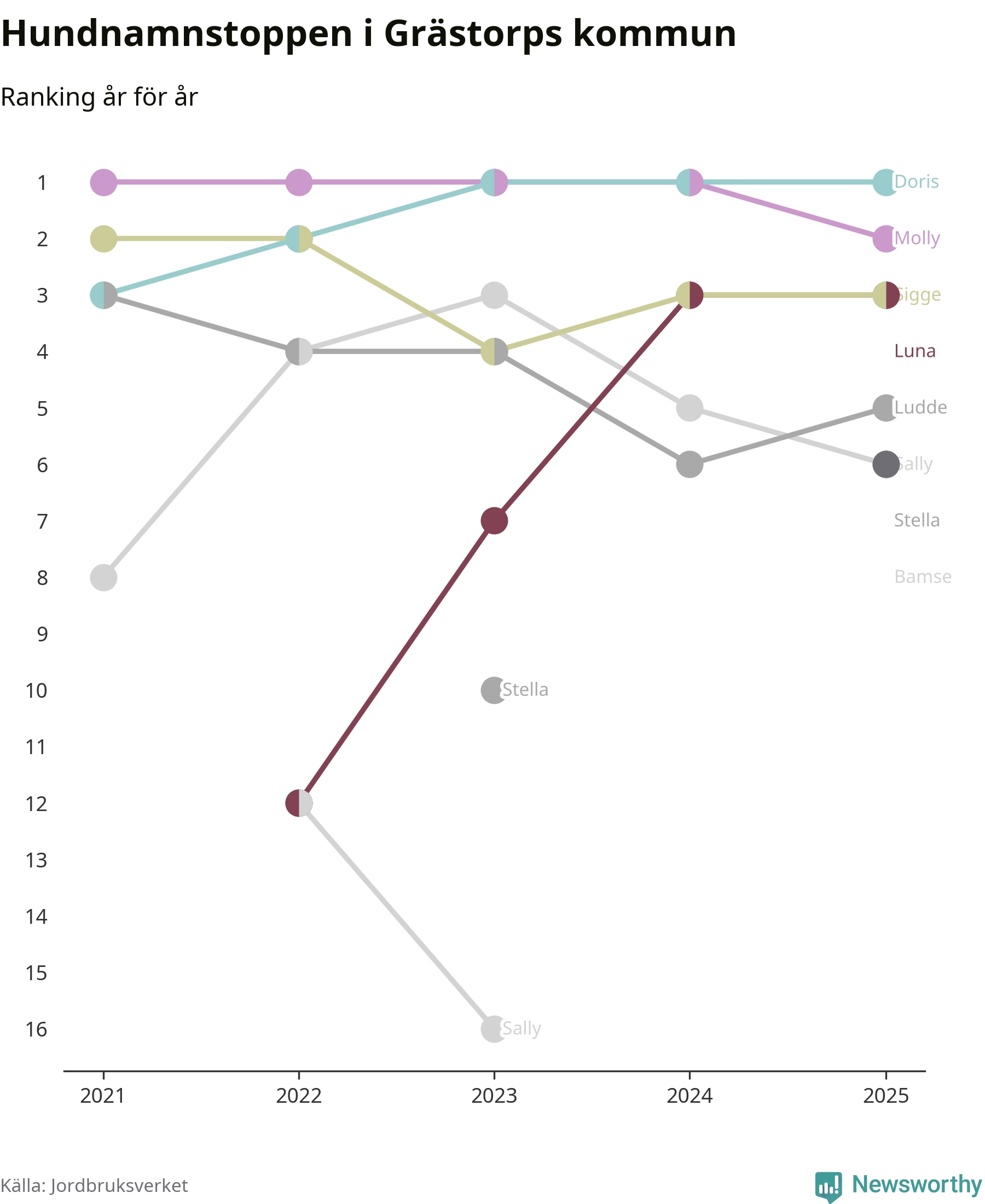 I hela landet är Molly det ohotat populäraste tilltalsnamnet för hundar sedan flera år, följt av Bella och Charlie. Något av de tre namnen toppar listan i 243 av 290 kommuner, och de har varit de vanligaste namnen sedan åtminstone 2018. Men det fjärde populäraste namnet, Doris, knappade in på ledartrion och kommer snart kunna utmana Charlie om tredjeplatsen, om trenden håller i sig.