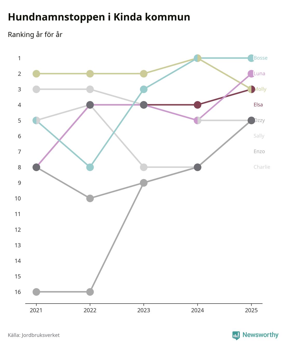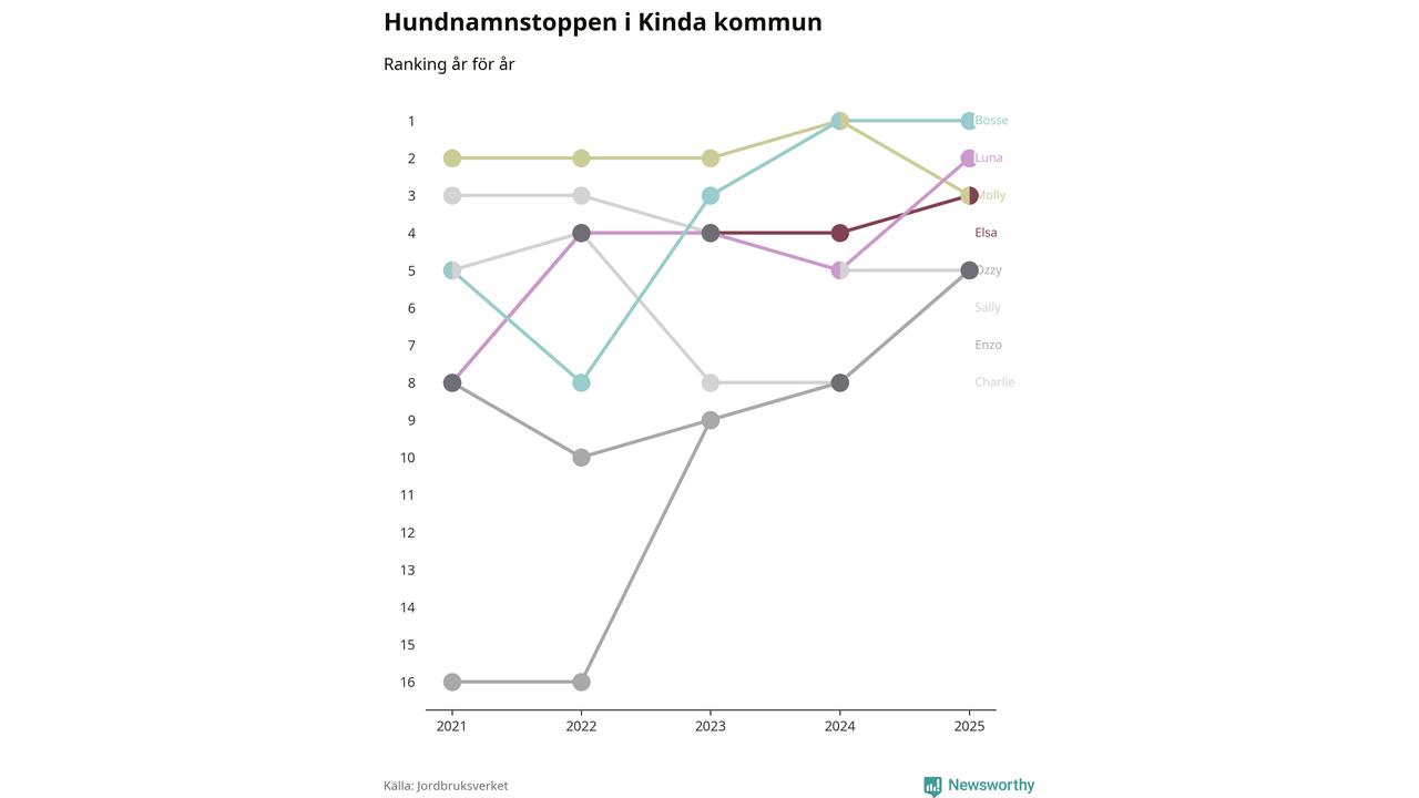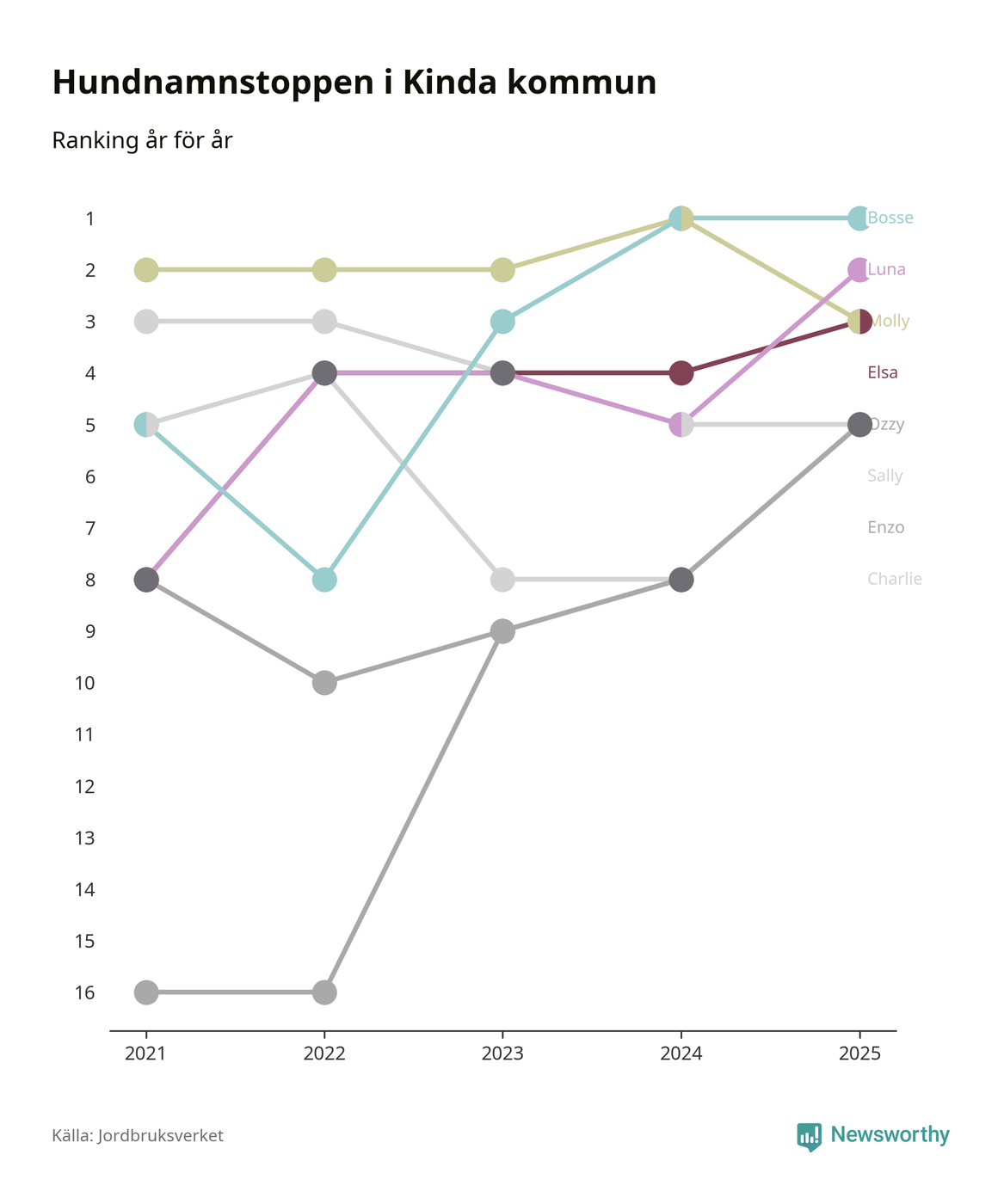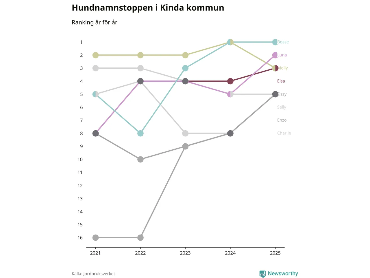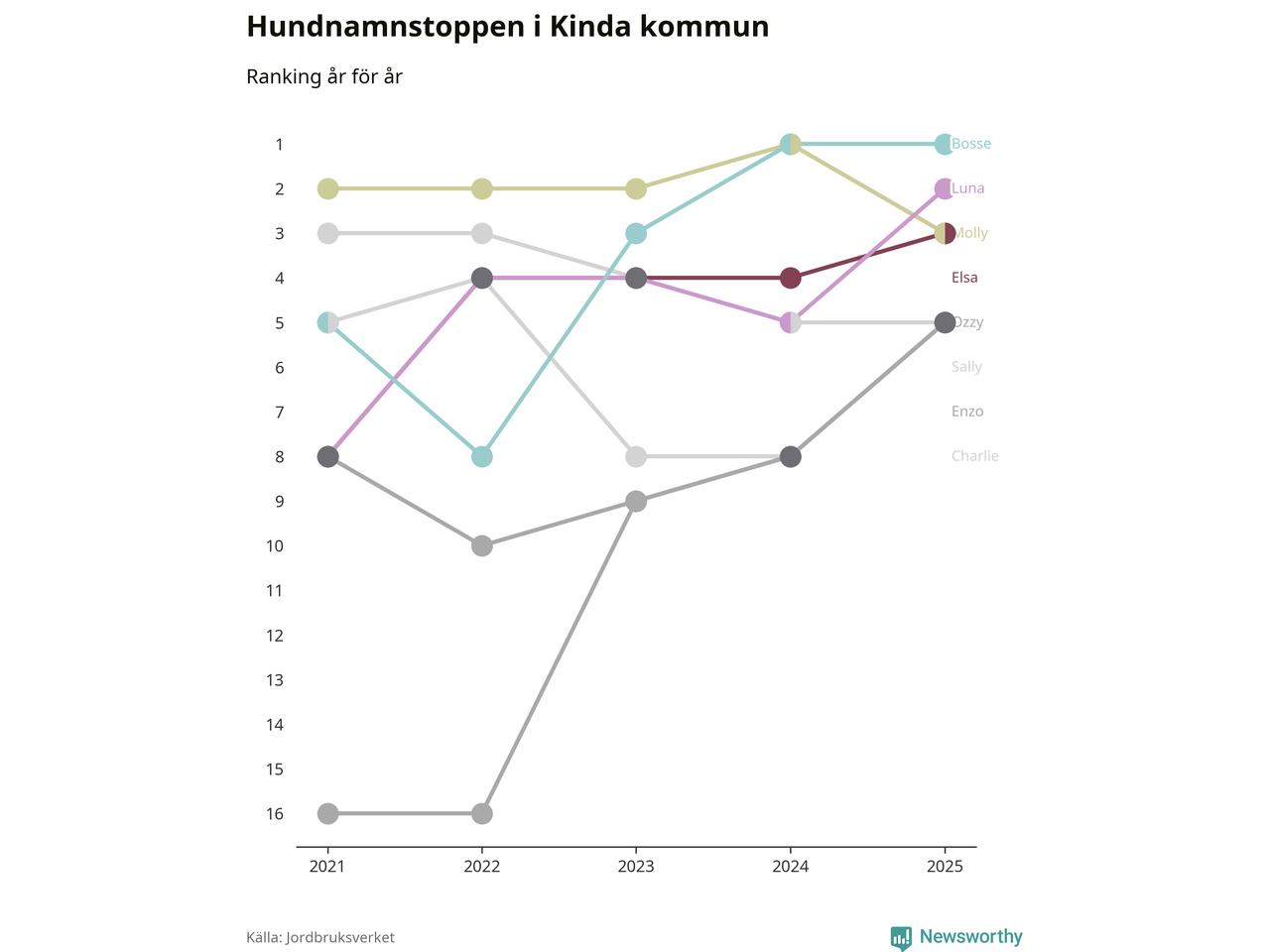 Molly är fortsatt ohotad etta bland hundnamnen i Sverige, följt av Bella och Charlie. Så har det sett ut flera år i rad, men bland Kindahundarna är Bosse populärast. Kinda är en av åtta kommuner i landet där Bosse är vanligast, eller på delad förstaplats.