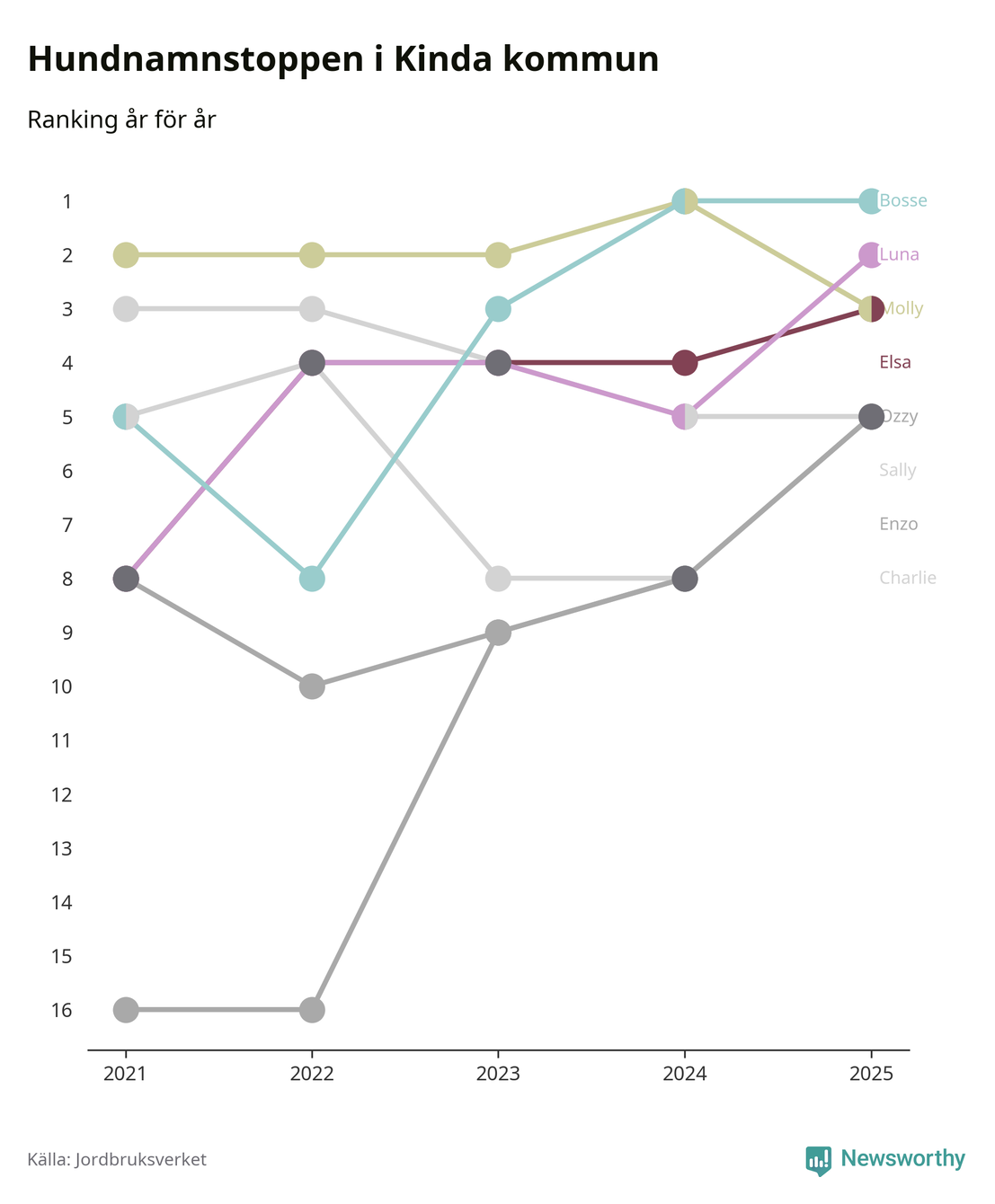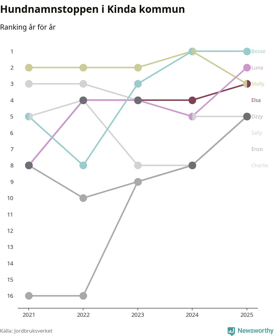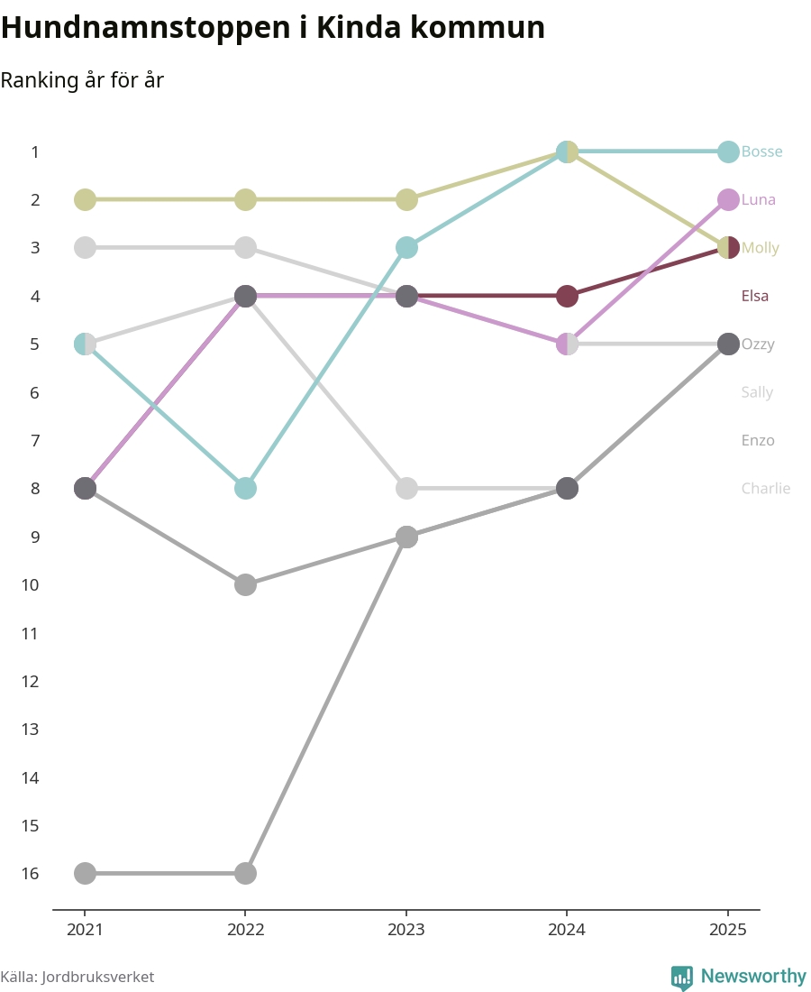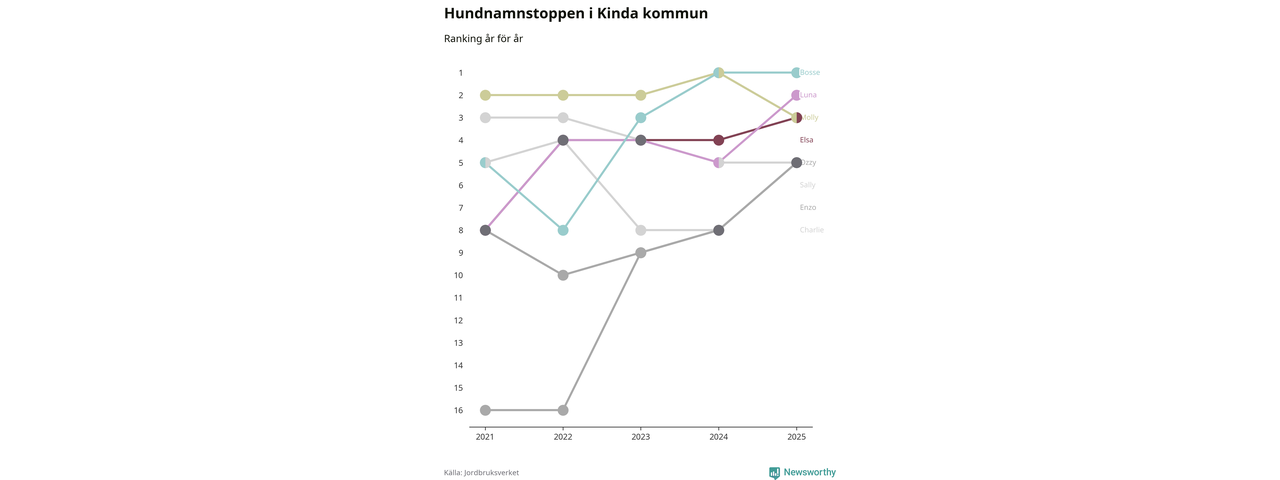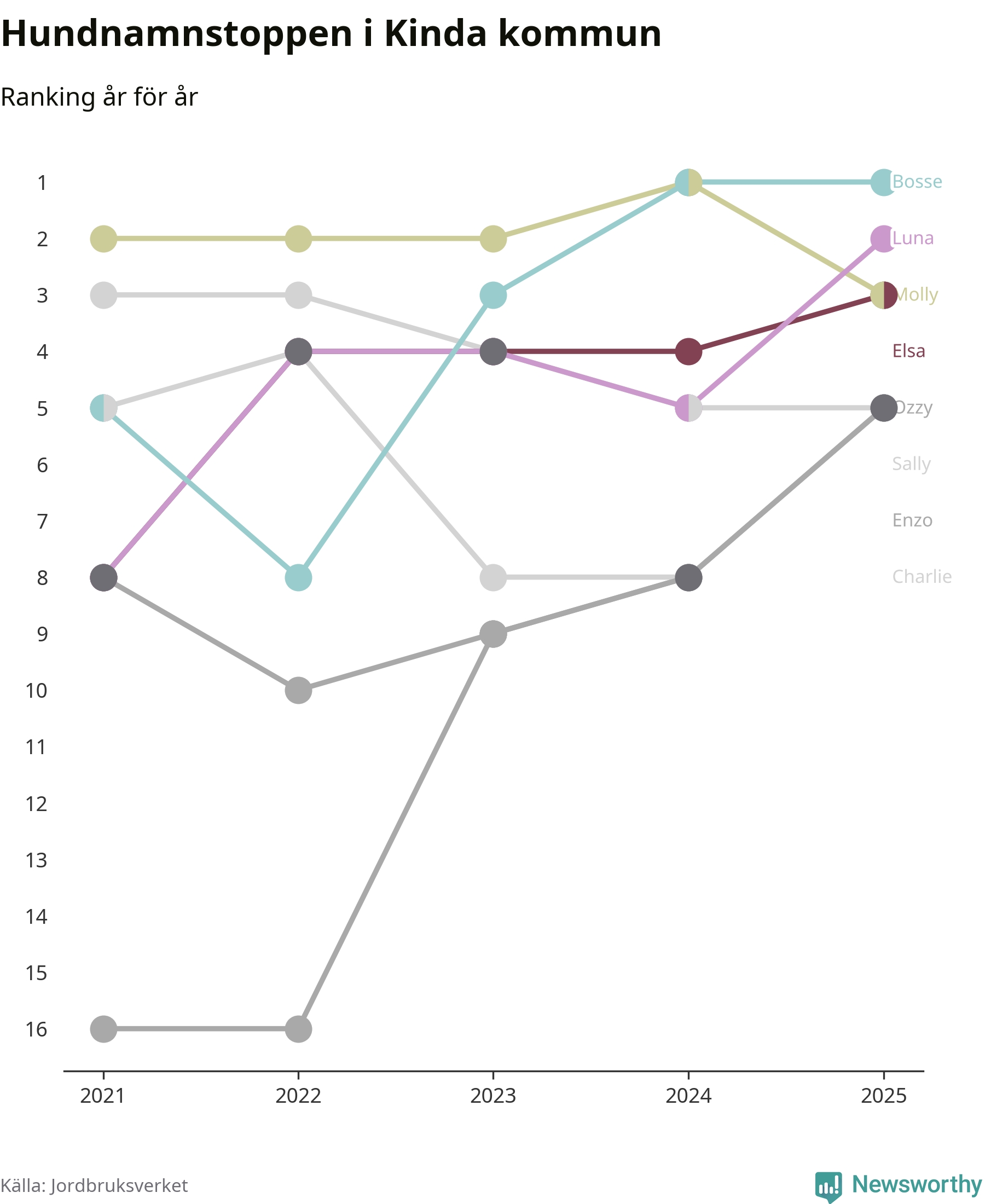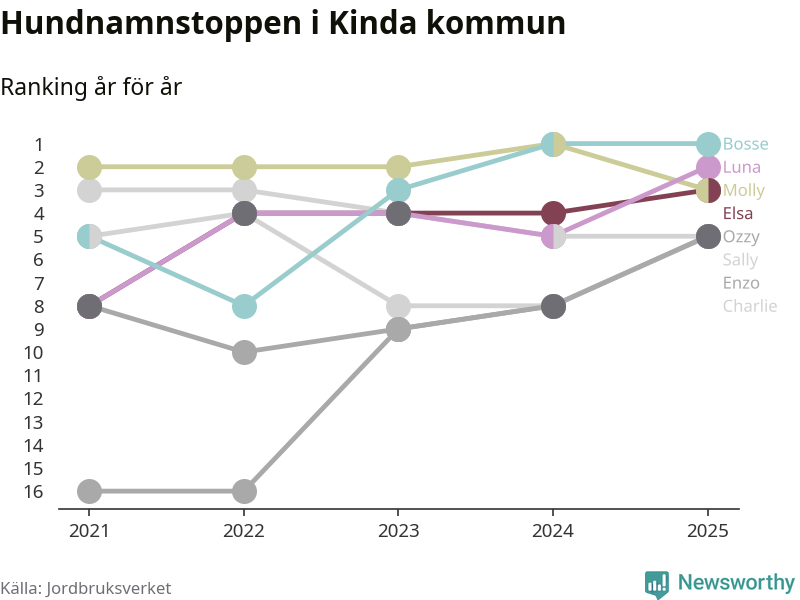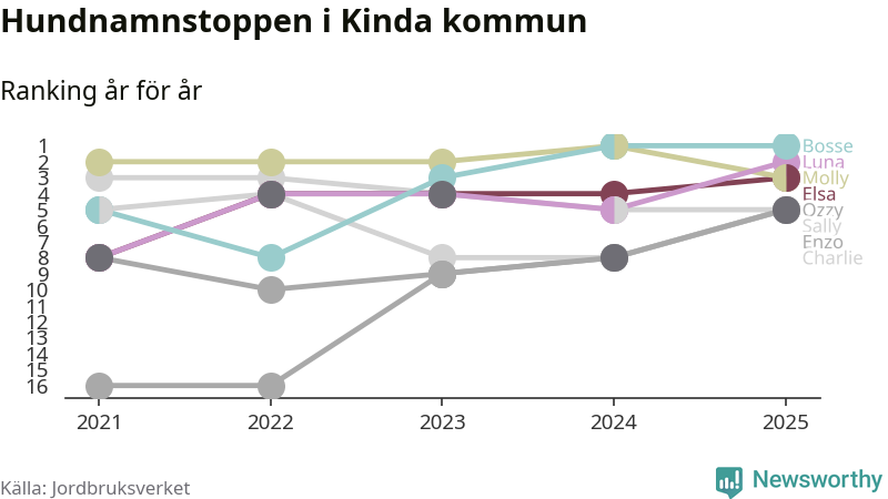 Molly är fortsatt ohotad etta bland hundnamnen i Sverige, följt av Bella och Charlie. Så har det sett ut flera år i rad, men bland Kindahundarna är Bosse populärast. Kinda är en av åtta kommuner i landet där Bosse är vanligast, eller på delad förstaplats.