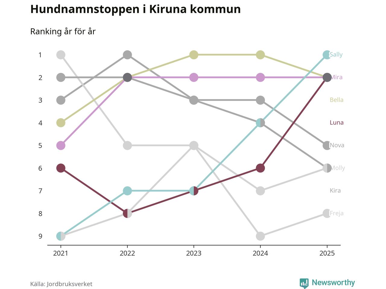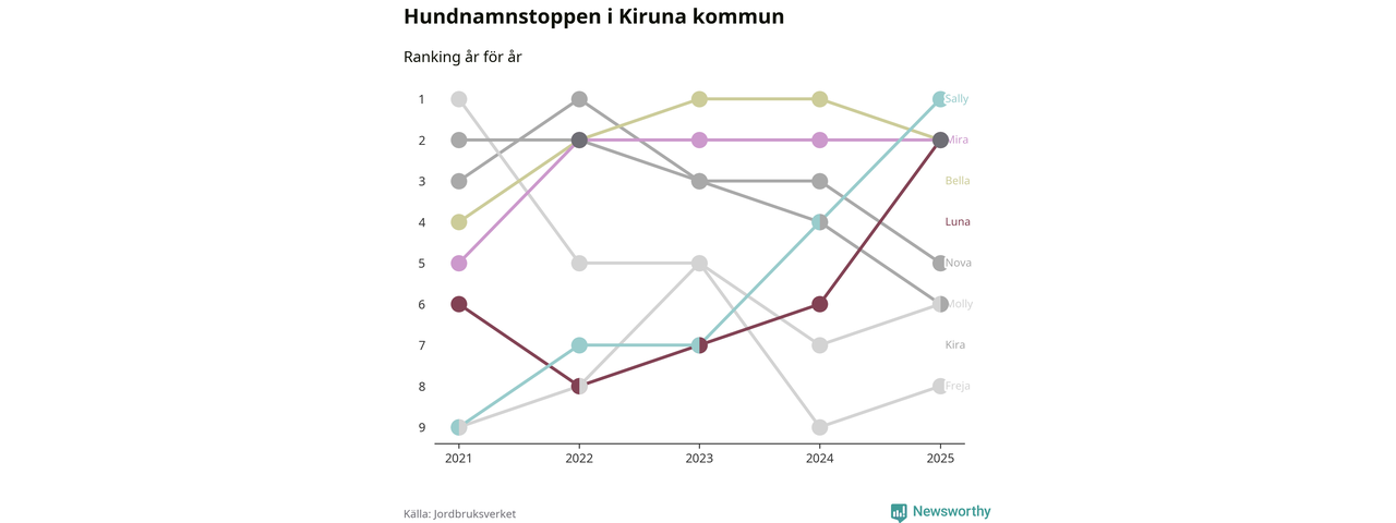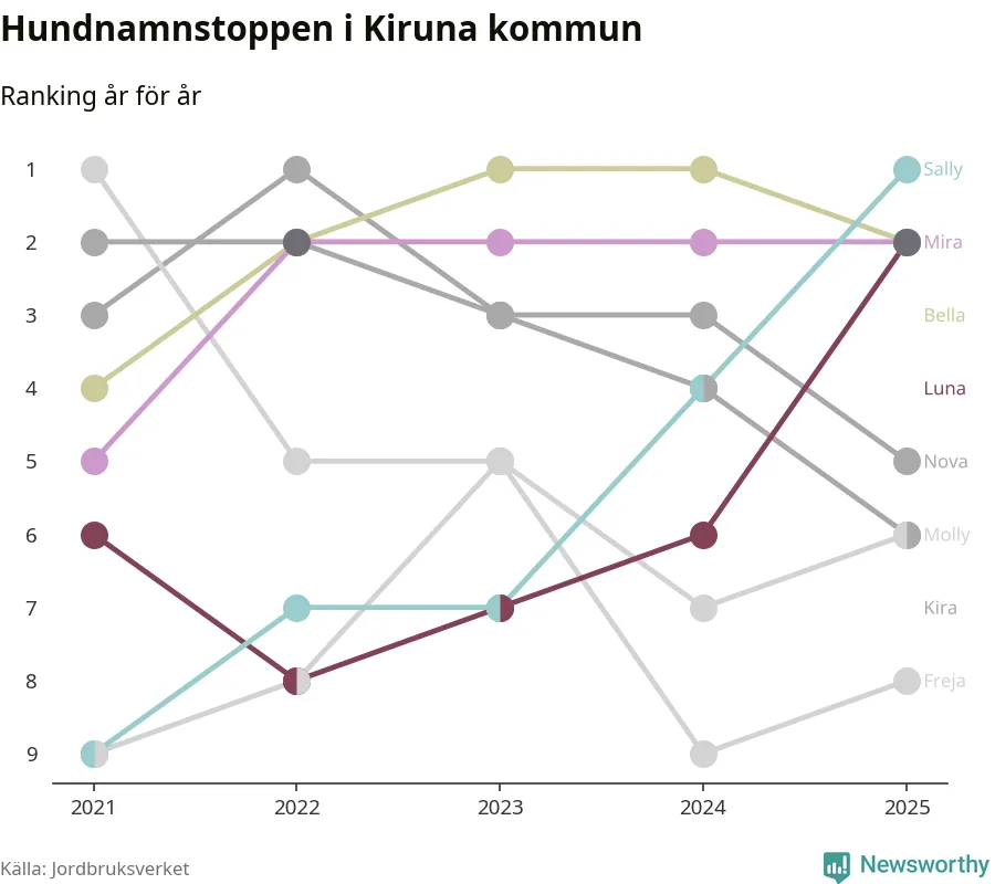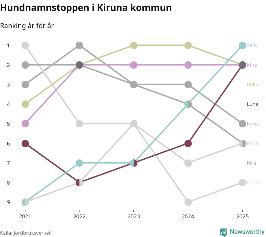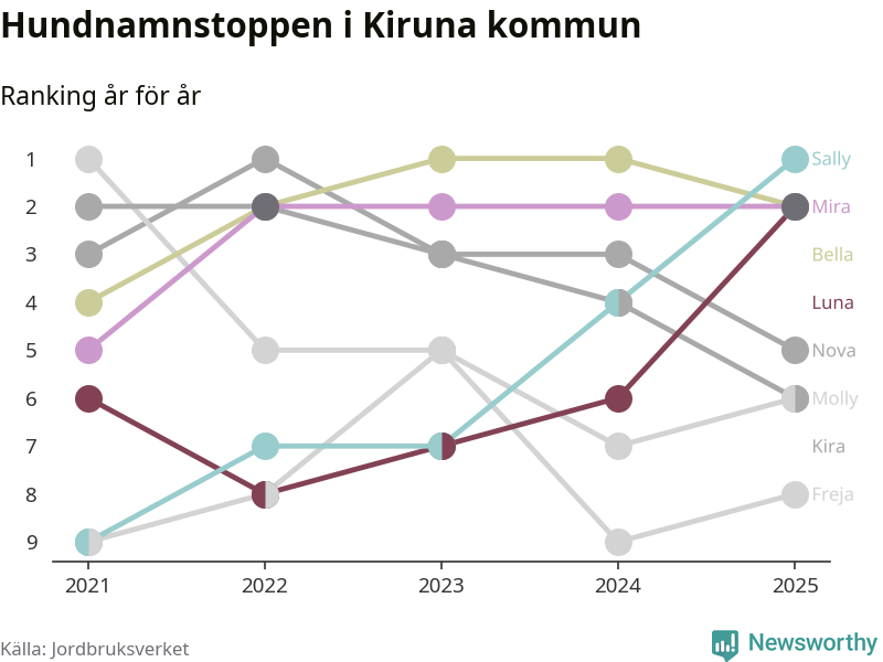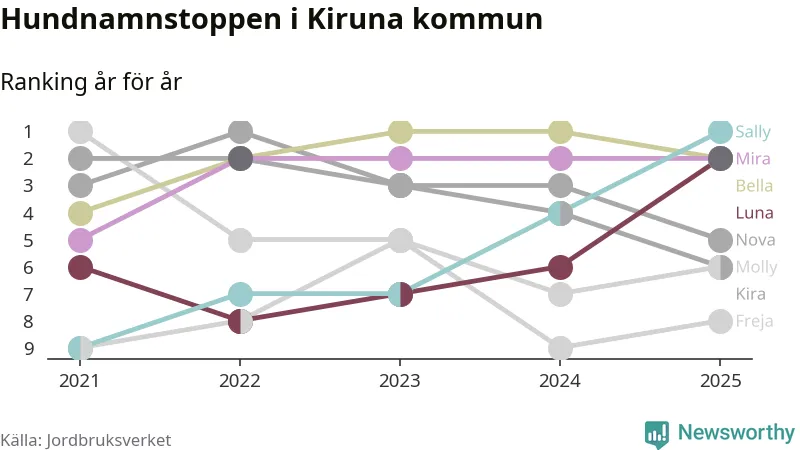 Molly är fortsatt ohotad etta bland hundnamnen i Sverige, följt av Bella och Charlie. Så har det sett ut flera år i rad, men bland Kirunahundarna är Sally populärast. Kiruna är en av 18 kommuner i landet där Sally är vanligast, eller på delad förstaplats.