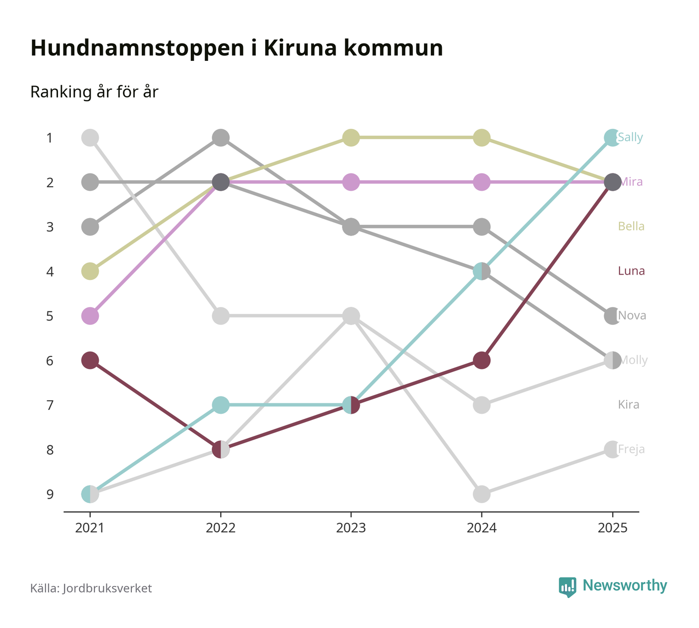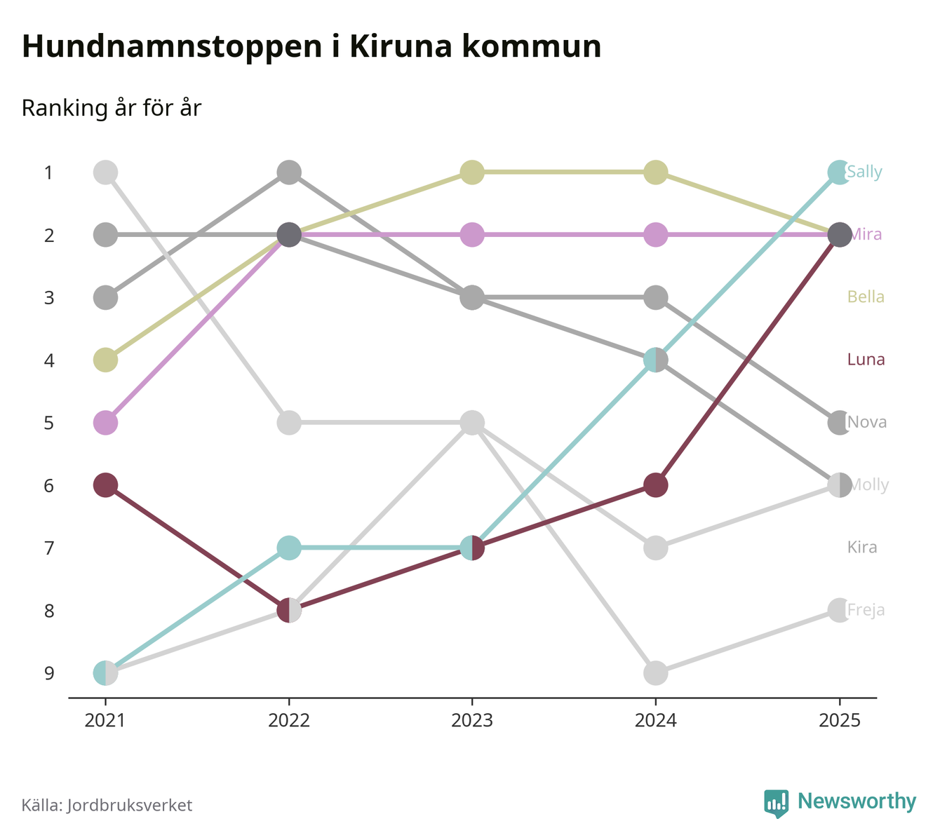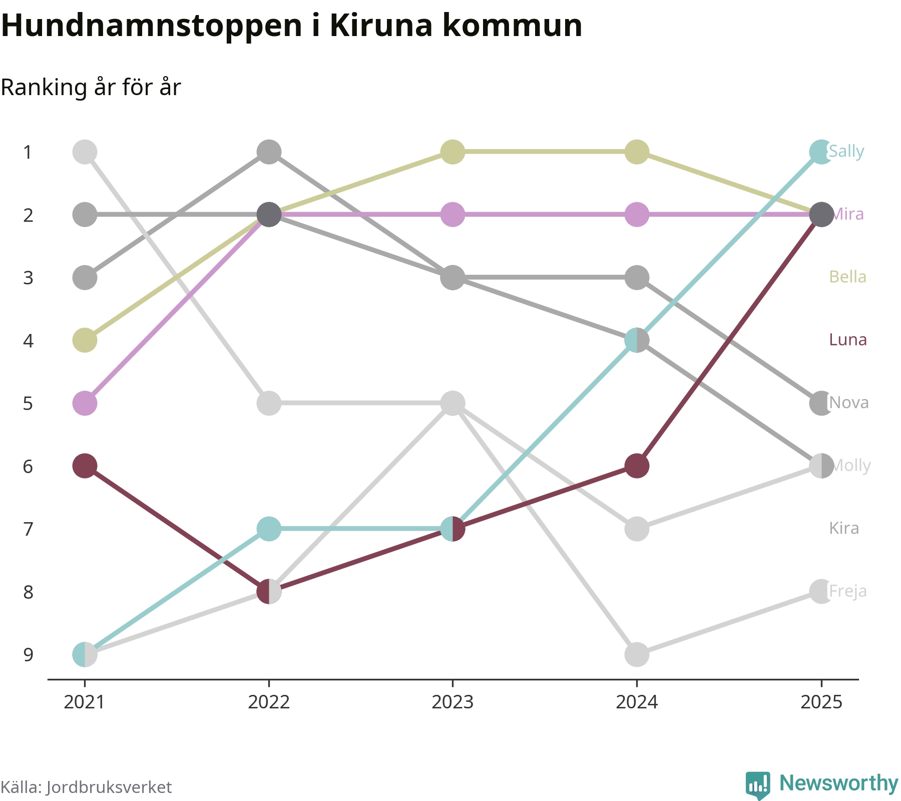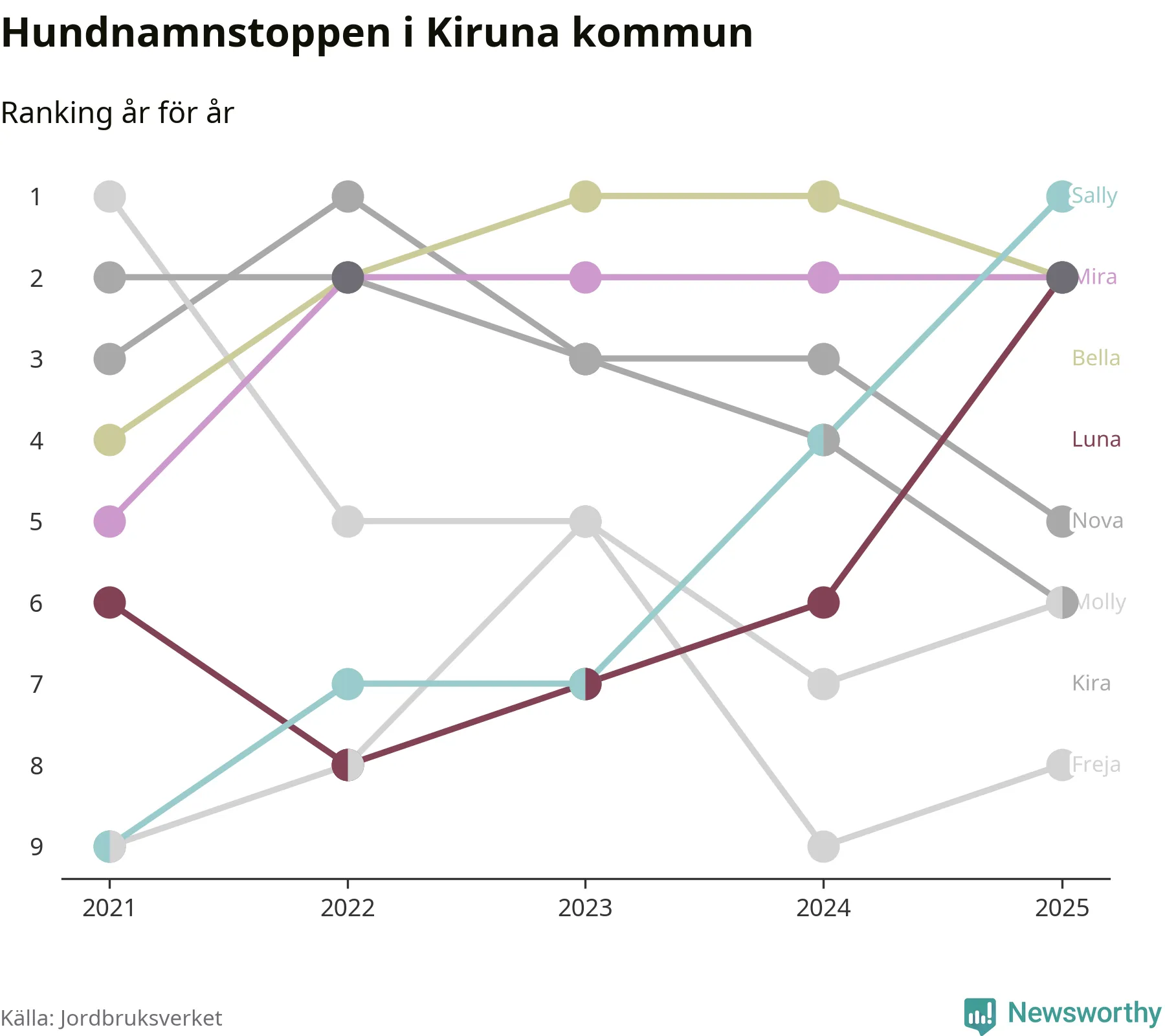 Molly är fortsatt ohotad etta bland hundnamnen i Sverige, följt av Bella och Charlie. Så har det sett ut flera år i rad, men bland Kirunahundarna är Sally populärast. Kiruna är en av 18 kommuner i landet där Sally är vanligast, eller på delad förstaplats.