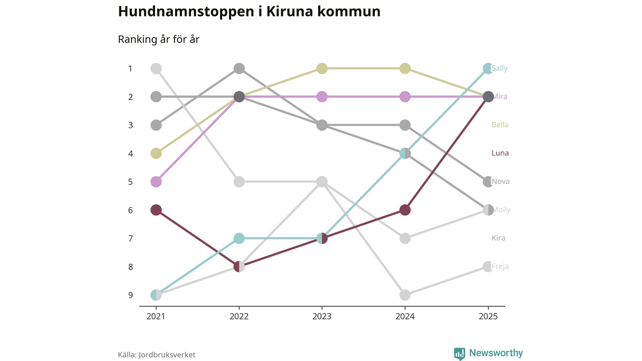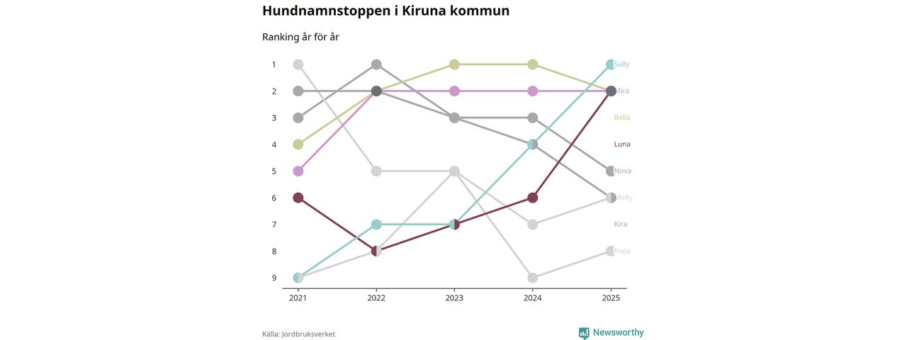 Sally är det vanligaste hundnamnet i Kiruna kommun, enligt färsk statistik från Jordbruksverket. Det gör Kiruna till en av de kommuner där något av landets allra vanligaste hundnamn, Molly, Bella och Charlie, inte toppar listan.