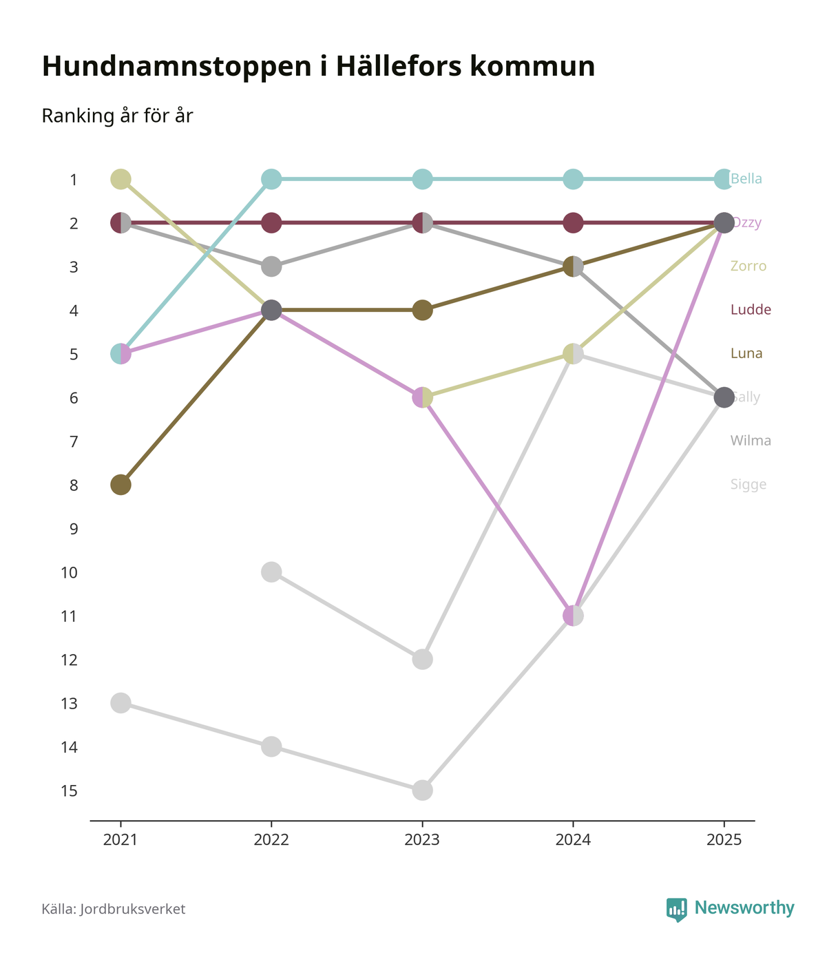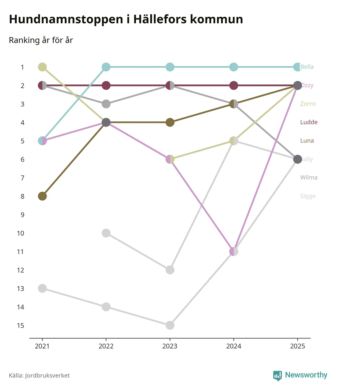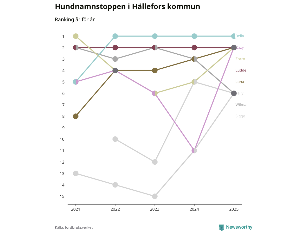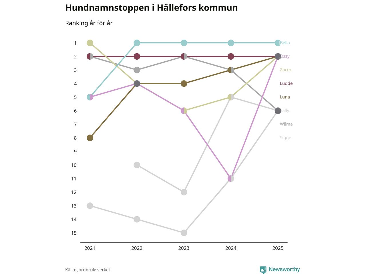 I hela landet är Molly det ohotat populäraste tilltalsnamnet för hundar sedan flera år, följt av Bella och Charlie. Något av de tre namnen toppar listan i 243 av 290 kommuner, och de har varit de vanligaste namnen sedan åtminstone 2018. Men det fjärde populäraste namnet, Doris, knappade in på ledartrion och kommer snart kunna utmana Charlie om tredjeplatsen, om trenden håller i sig.