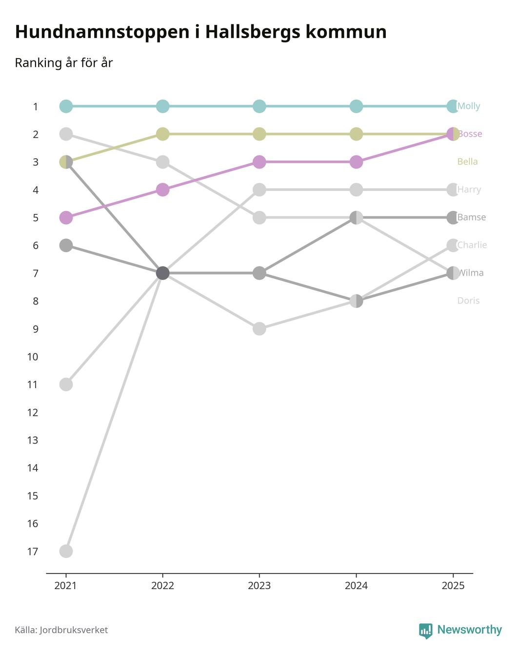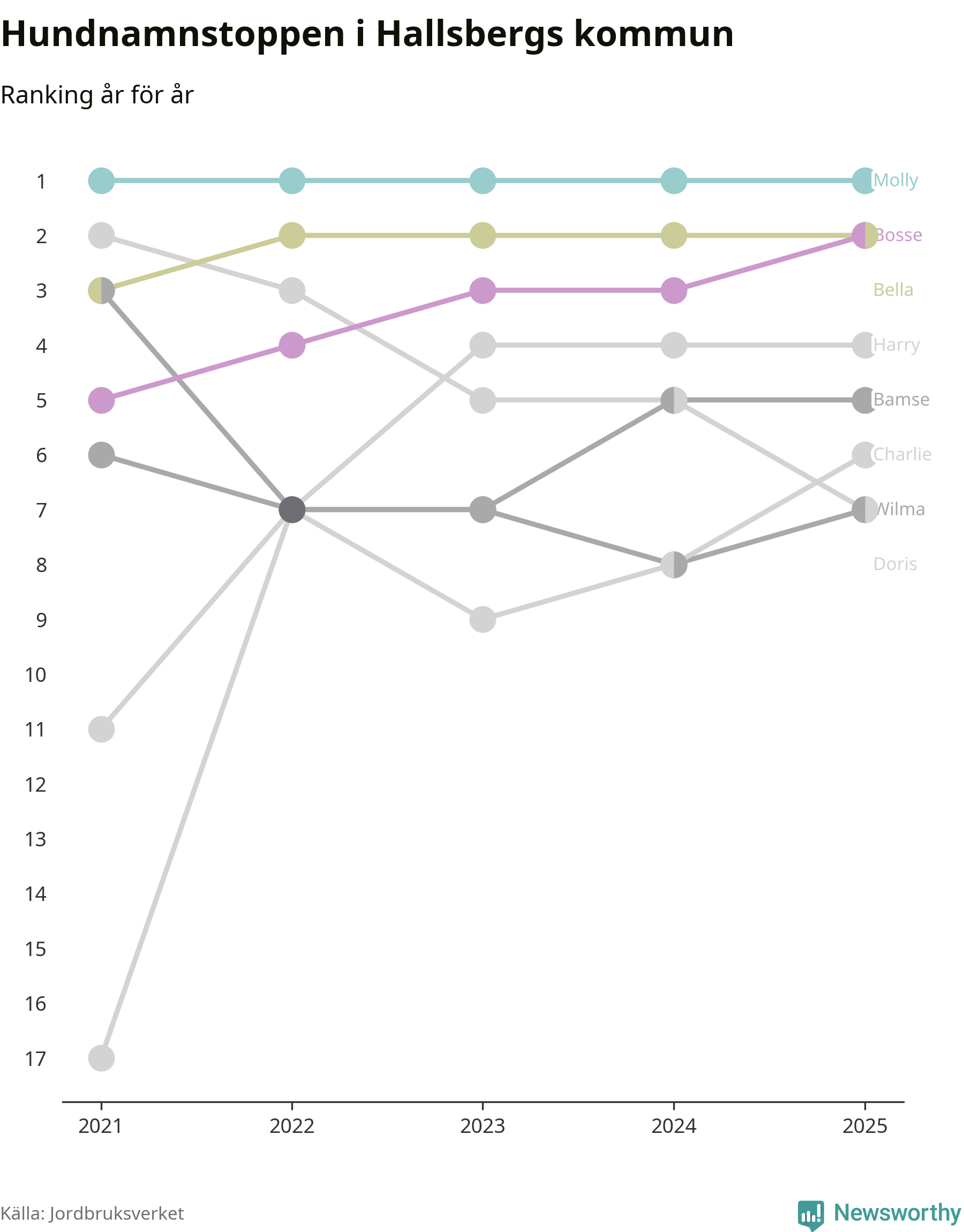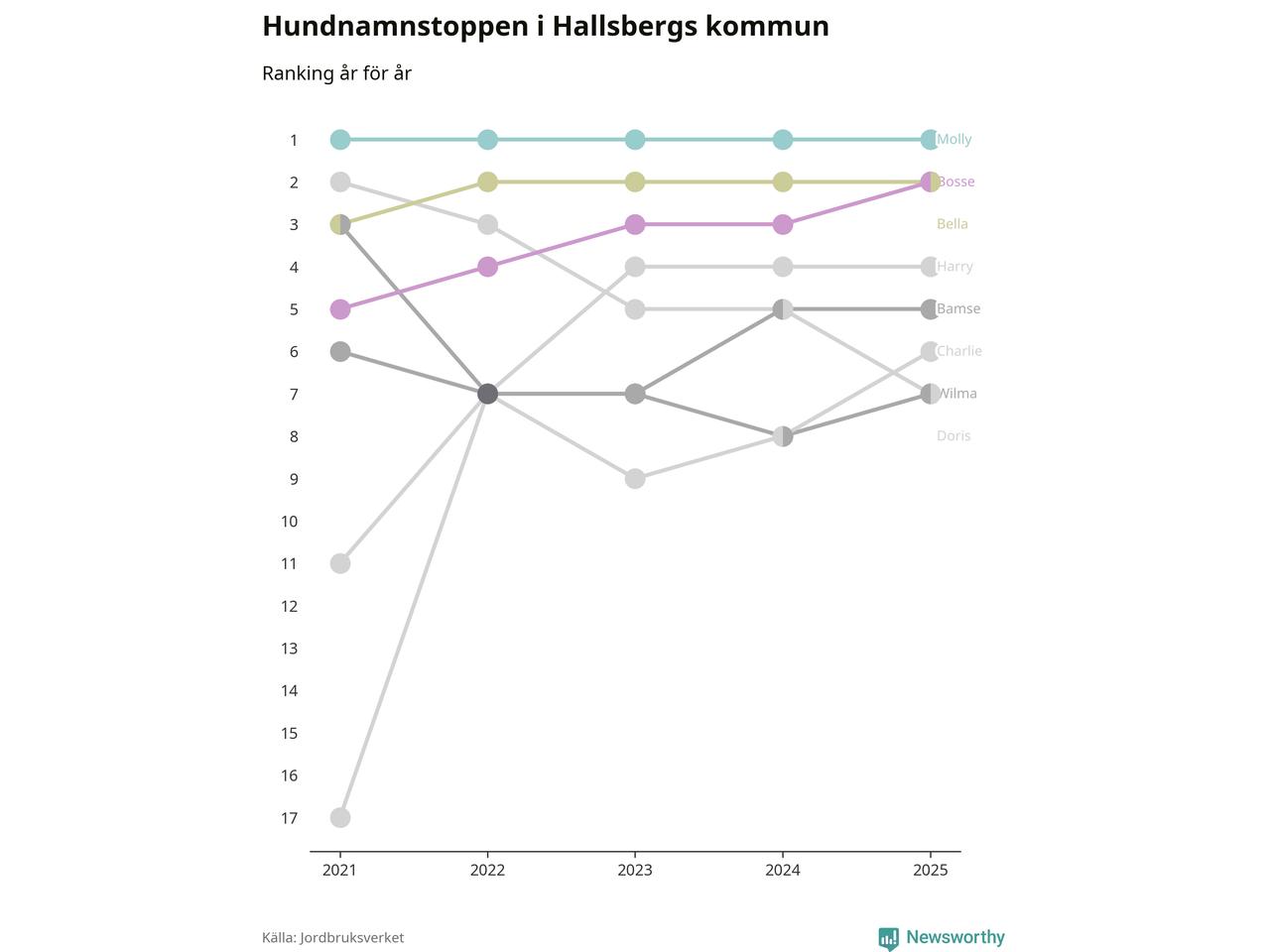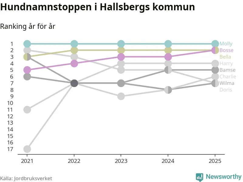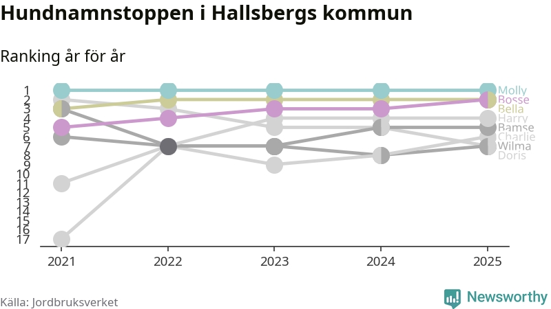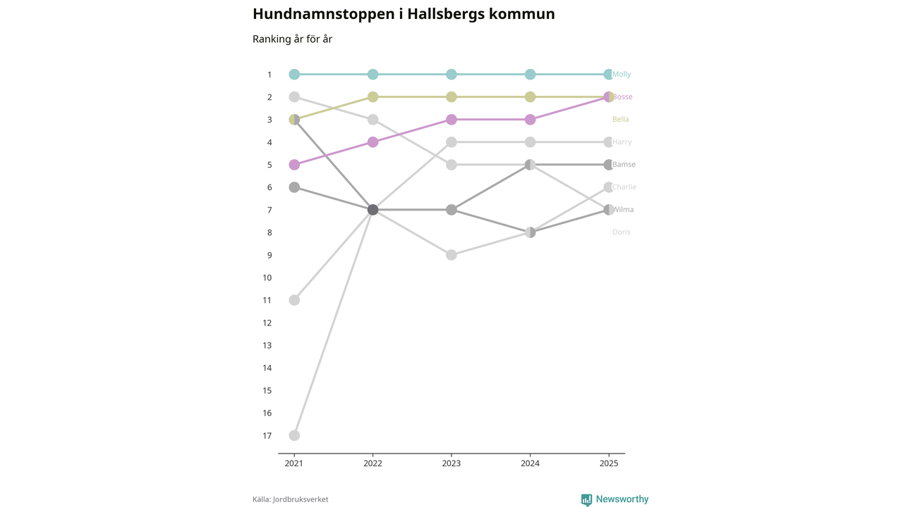 I hela landet är Molly det ohotat populäraste tilltalsnamnet för hundar sedan flera år, följt av Bella och Charlie. Något av de tre namnen toppar listan i 243 av 290 kommuner, och de har varit de vanligaste namnen sedan åtminstone 2018. Men det fjärde populäraste namnet, Doris, knappade in på ledartrion och kommer snart kunna utmana Charlie om tredjeplatsen, om trenden håller i sig.