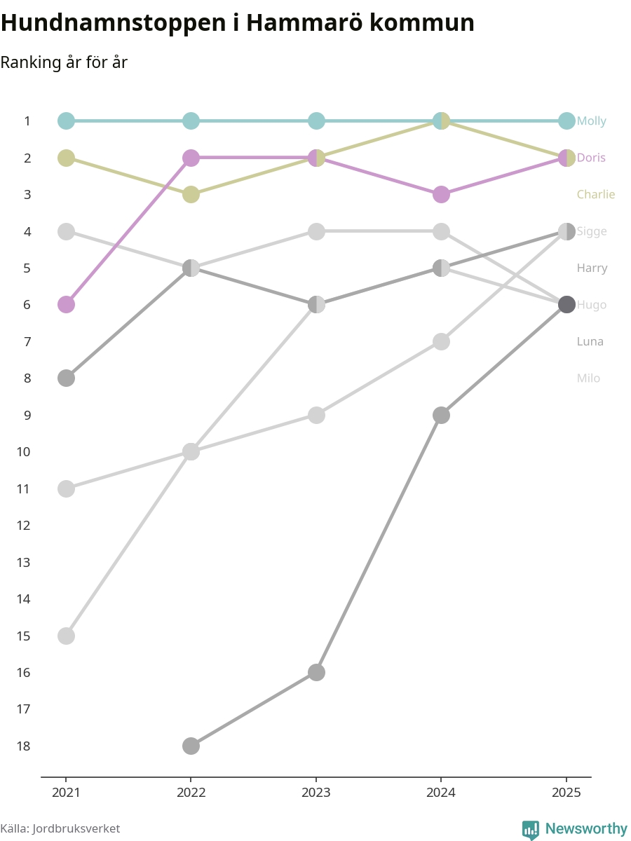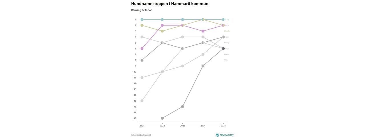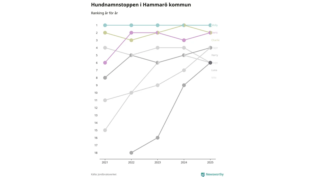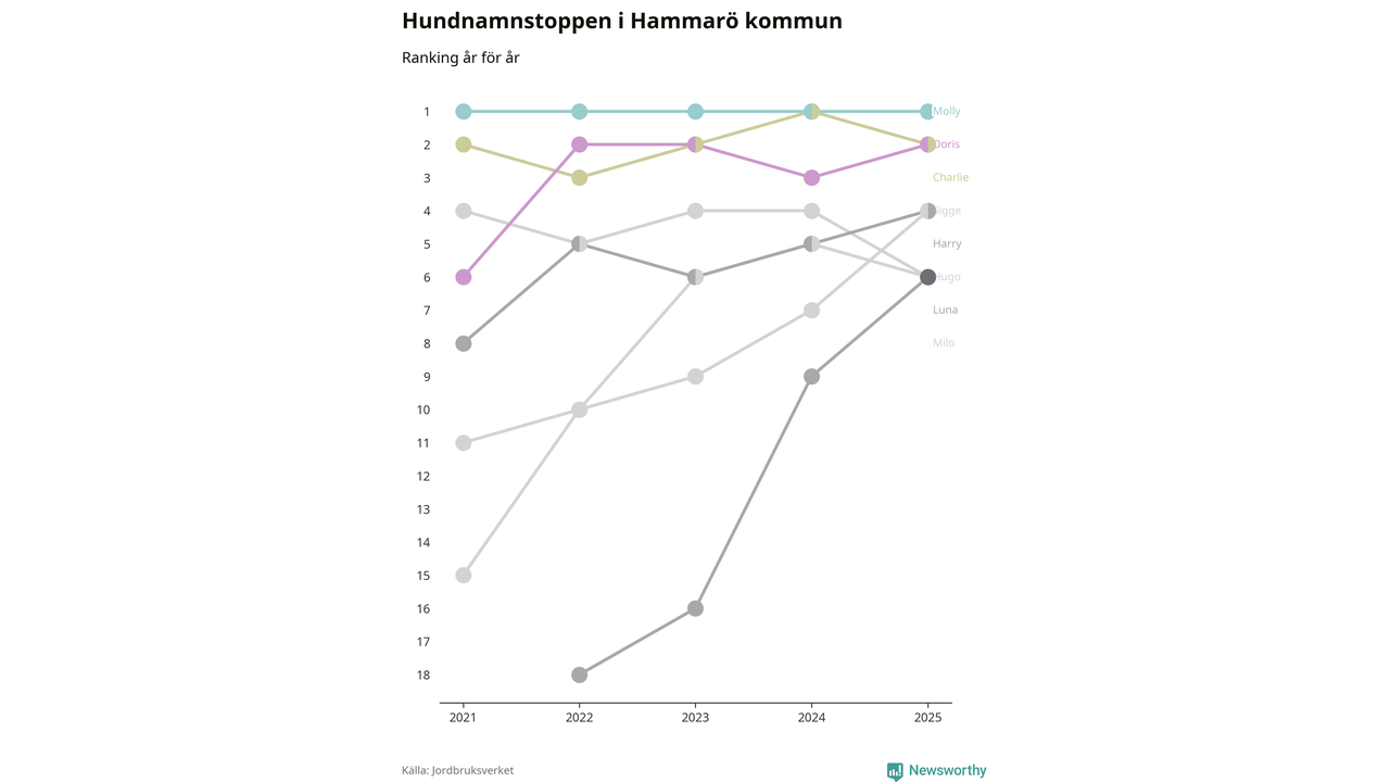 Molly toppar hundnamnsligan i Hammarö kommun, precis som i landet som helhet. Det visar färsk statistik från Jordbruksverket. Här finns hela topplistan för kommunen.