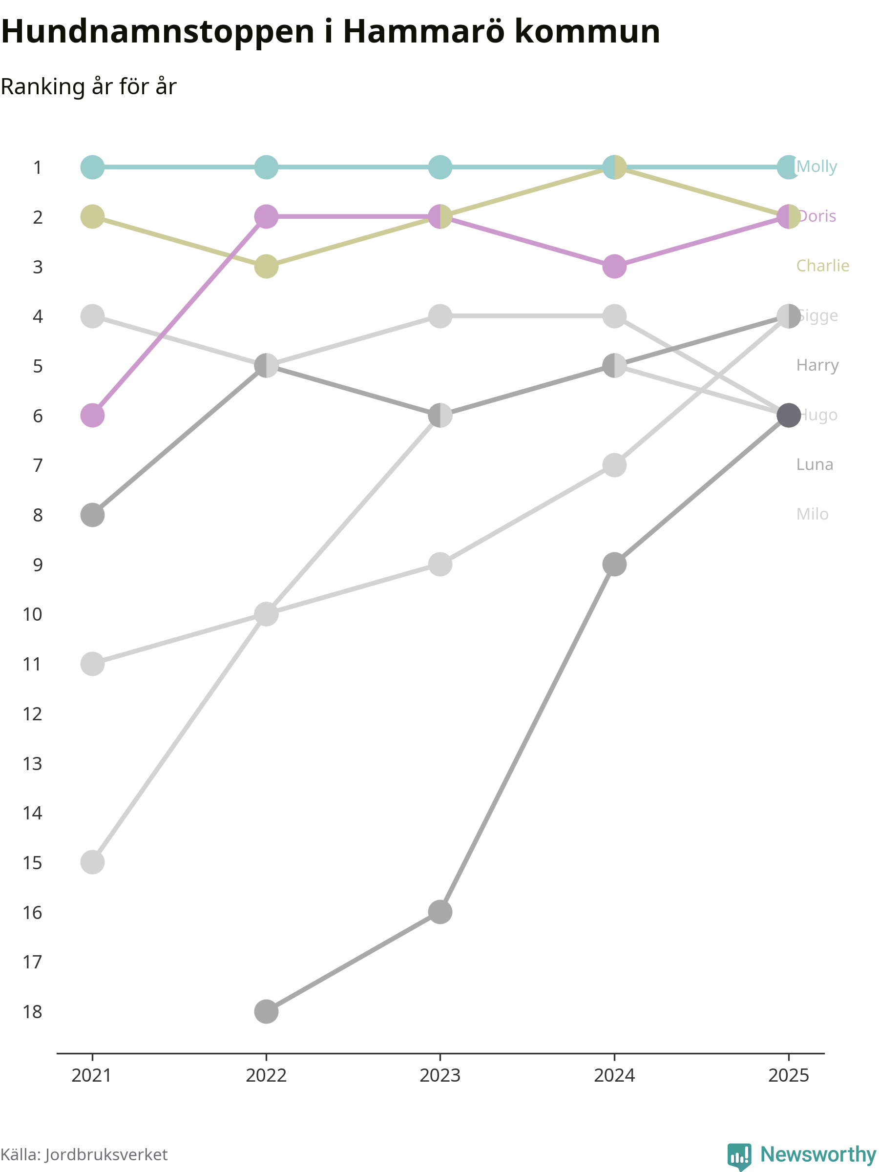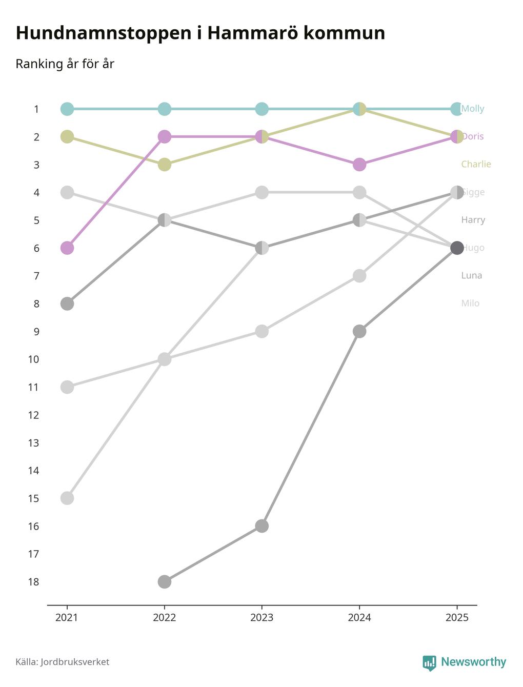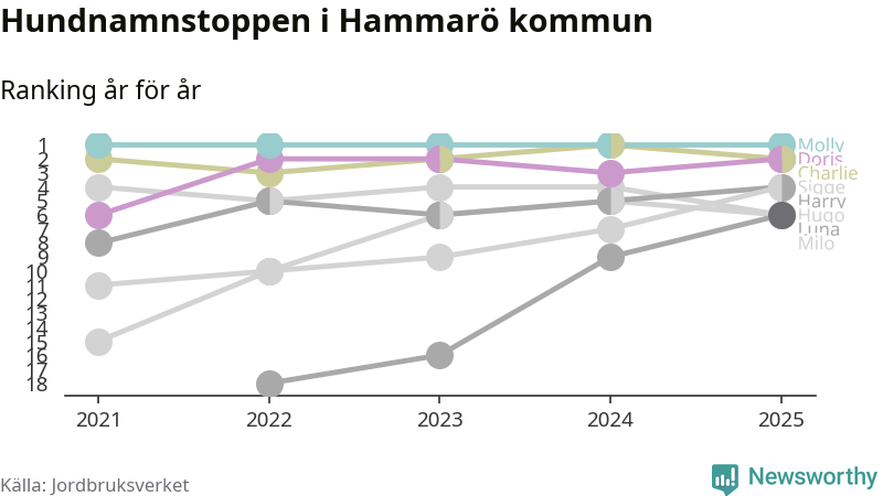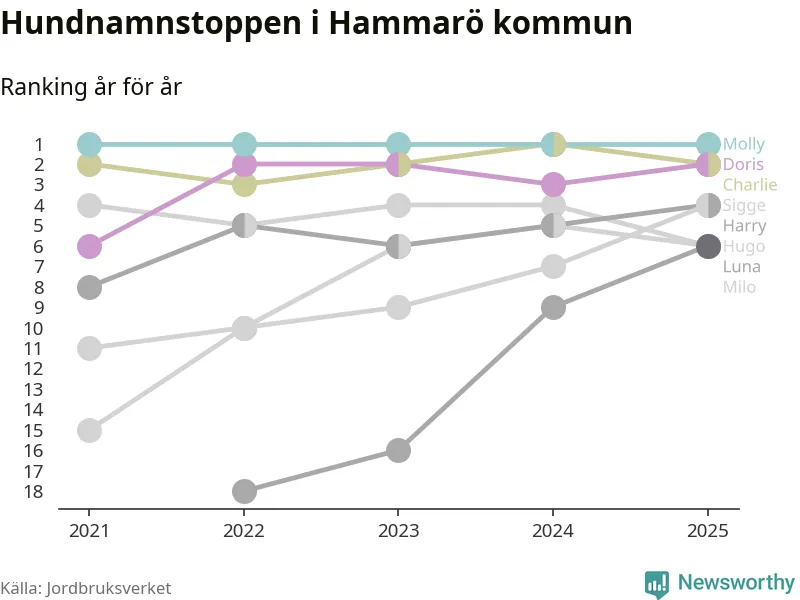 Molly toppar hundnamnsligan i Hammarö kommun, precis som i landet som helhet. Det visar färsk statistik från Jordbruksverket. Här finns hela topplistan för kommunen.