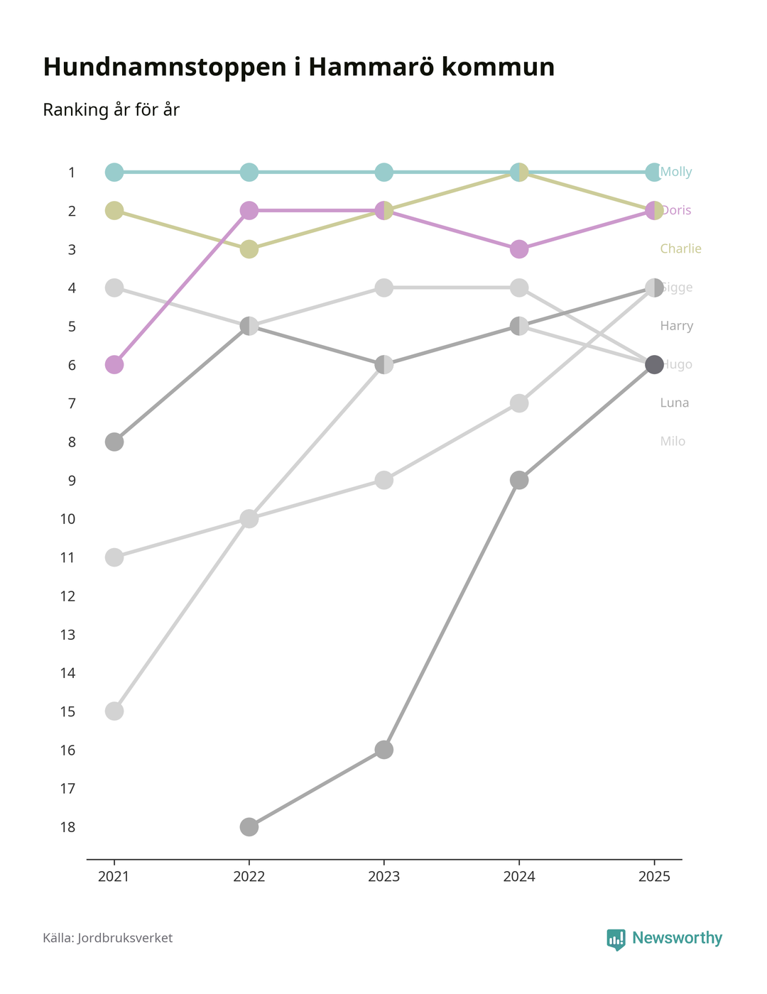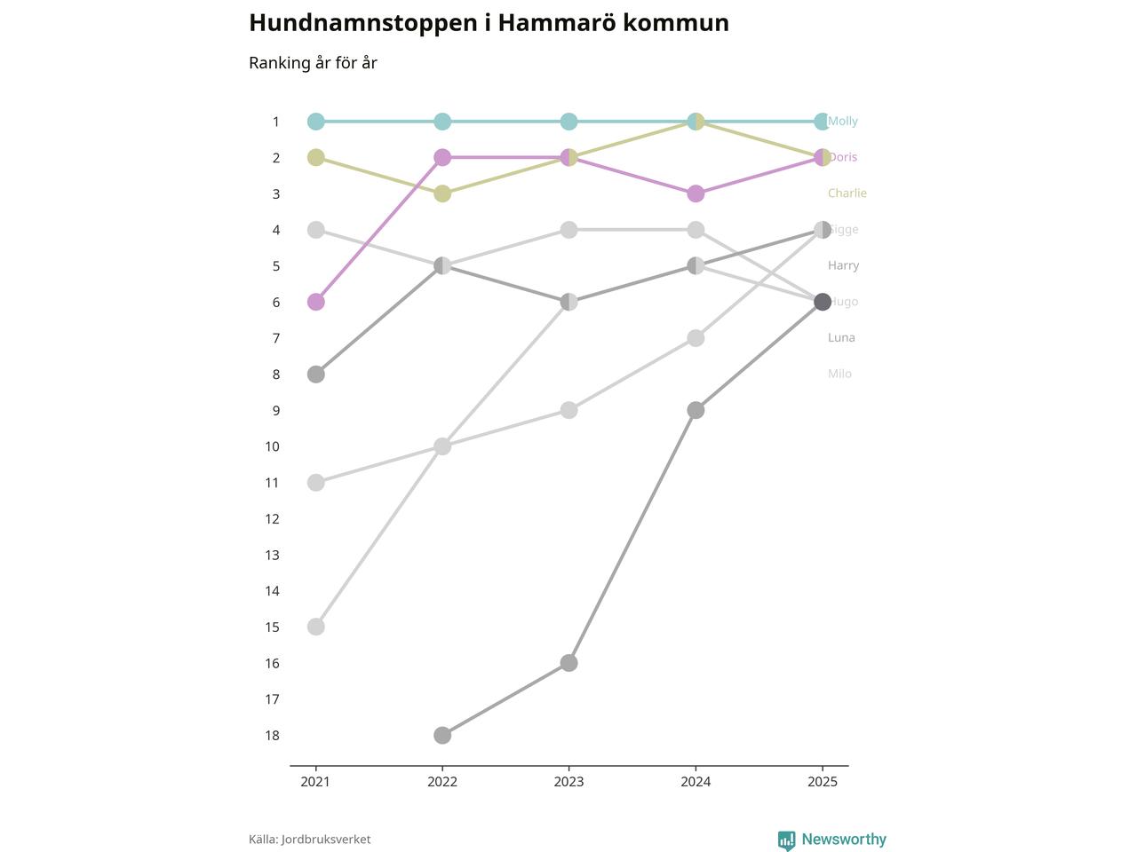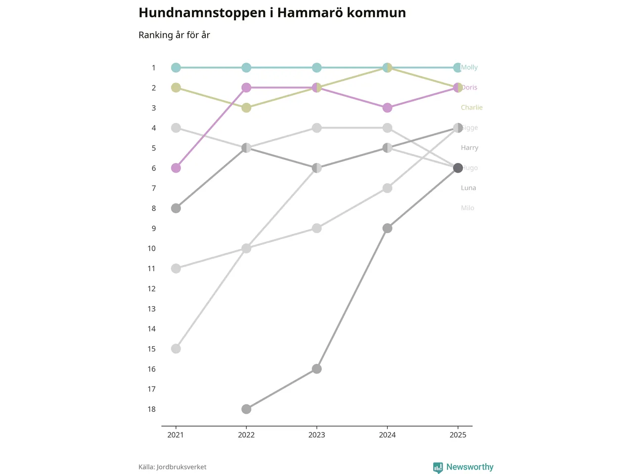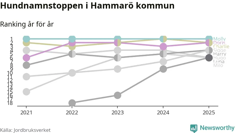I hela landet är Molly det ohotat populäraste tilltalsnamnet för hundar sedan flera år, följt av Bella och Charlie. Något av de tre namnen toppar listan i 243 av 290 kommuner, och de har varit de vanligaste namnen sedan åtminstone 2018. Men det fjärde populäraste namnet, Doris, knappade in på ledartrion och kommer snart kunna utmana Charlie om tredjeplatsen, om trenden håller i sig.