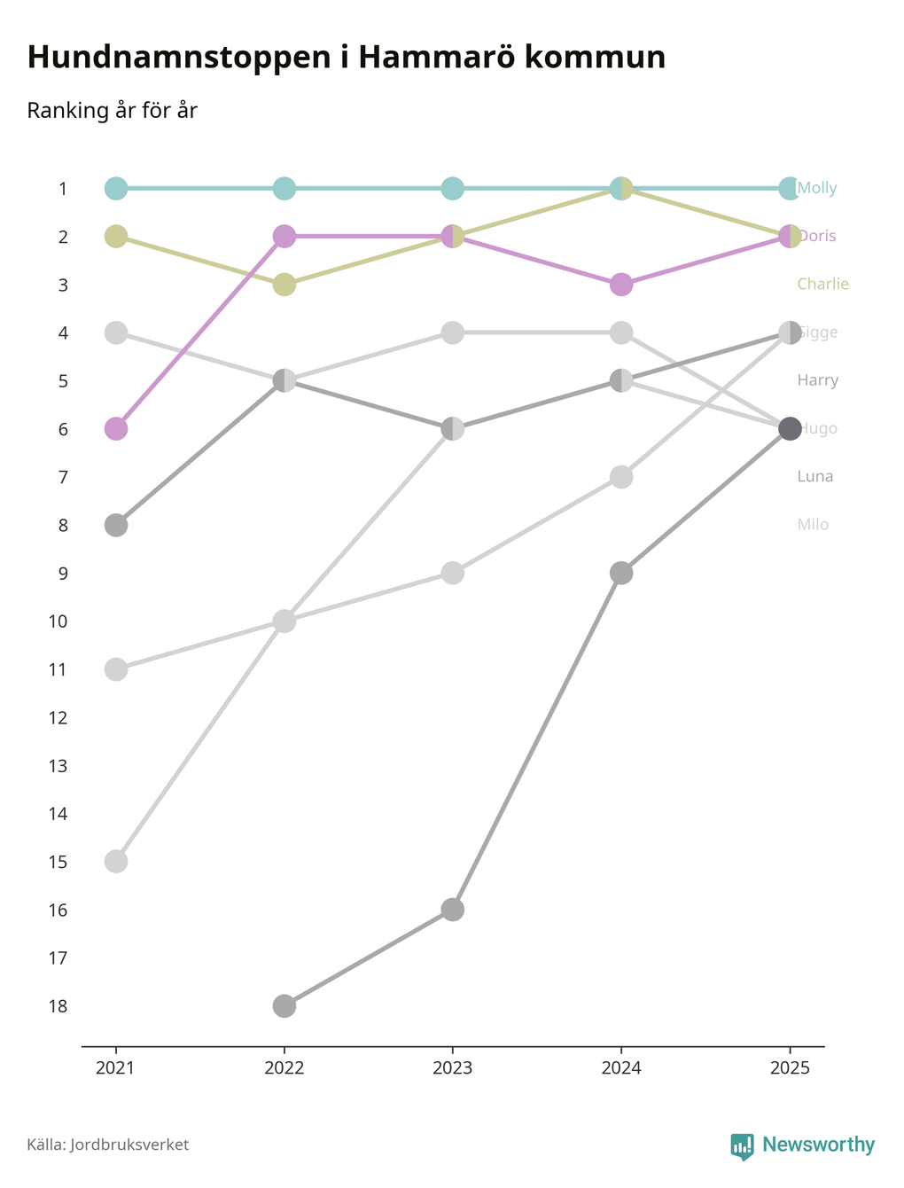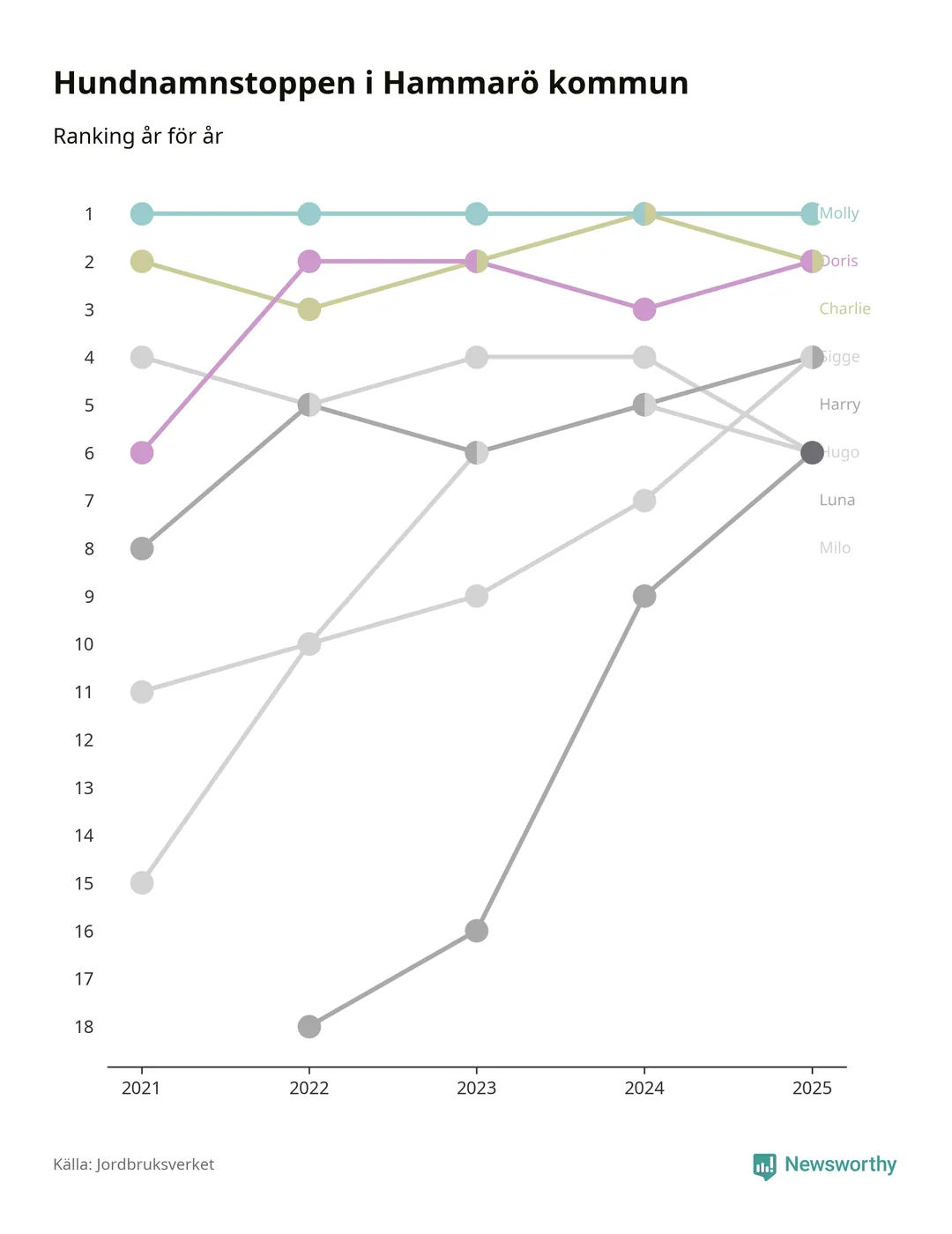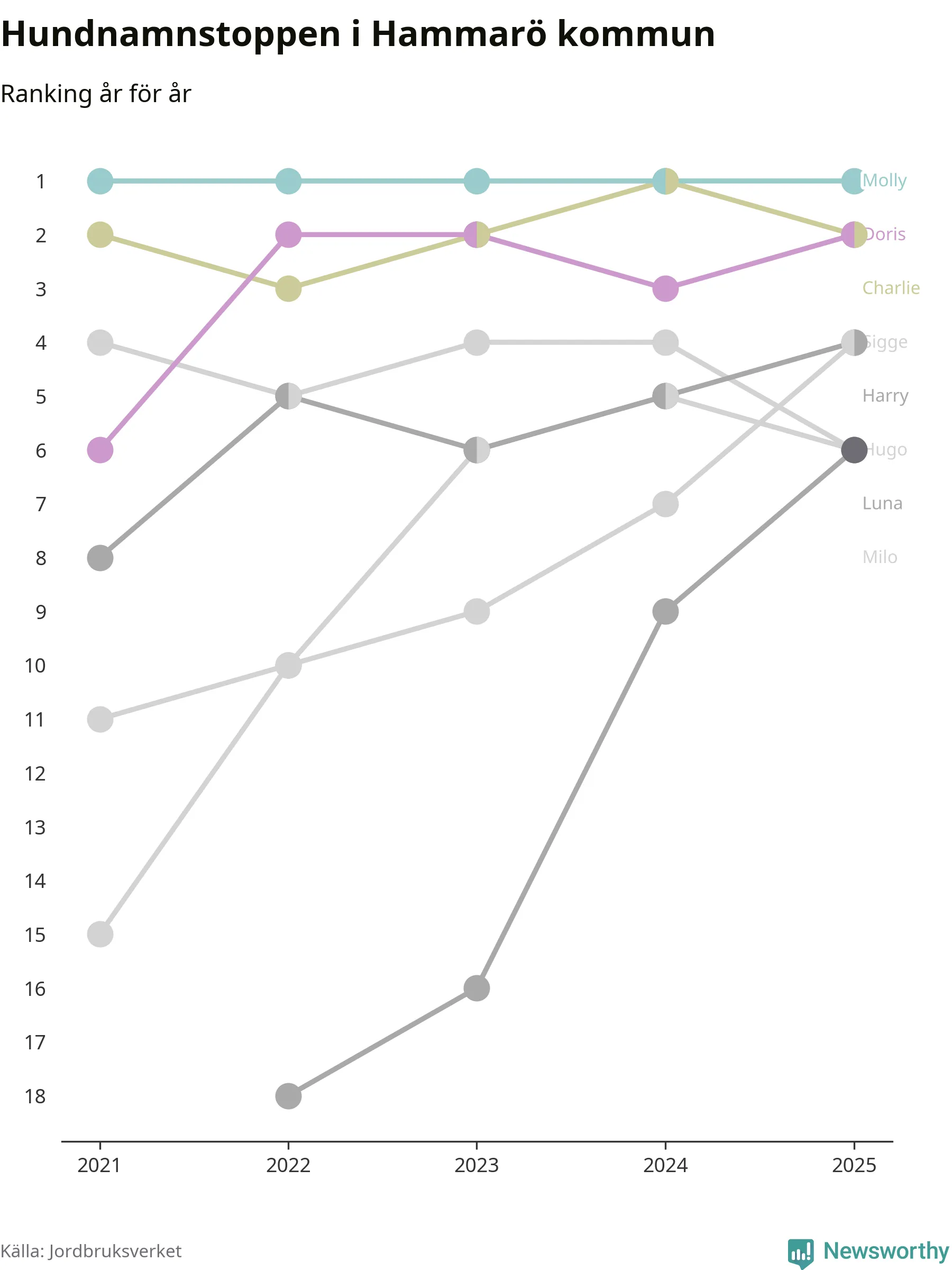I hela landet är Molly det ohotat populäraste tilltalsnamnet för hundar sedan flera år, följt av Bella och Charlie. Något av de tre namnen toppar listan i 243 av 290 kommuner, och de har varit de vanligaste namnen sedan åtminstone 2018. Men det fjärde populäraste namnet, Doris, knappade in på ledartrion och kommer snart kunna utmana Charlie om tredjeplatsen, om trenden håller i sig.