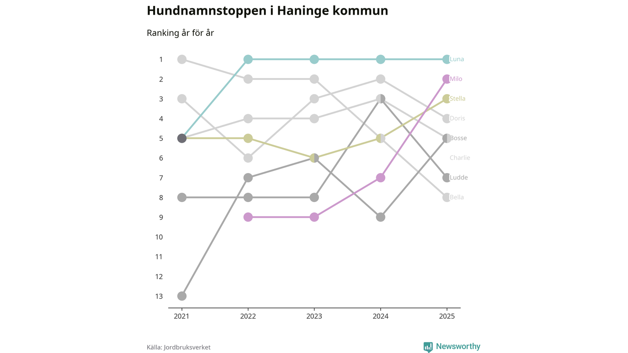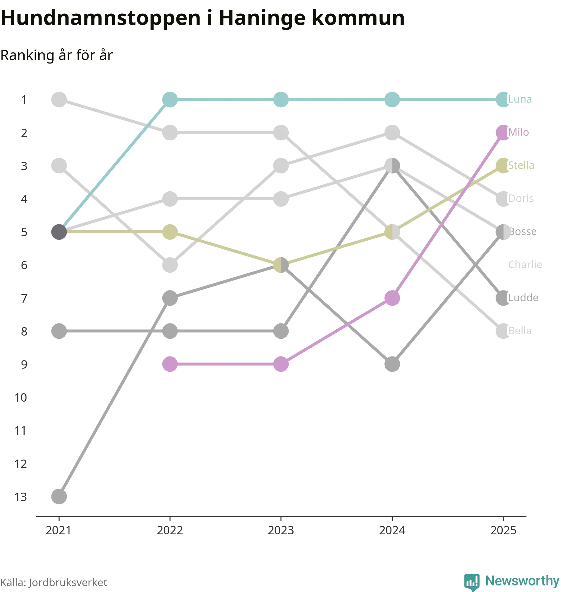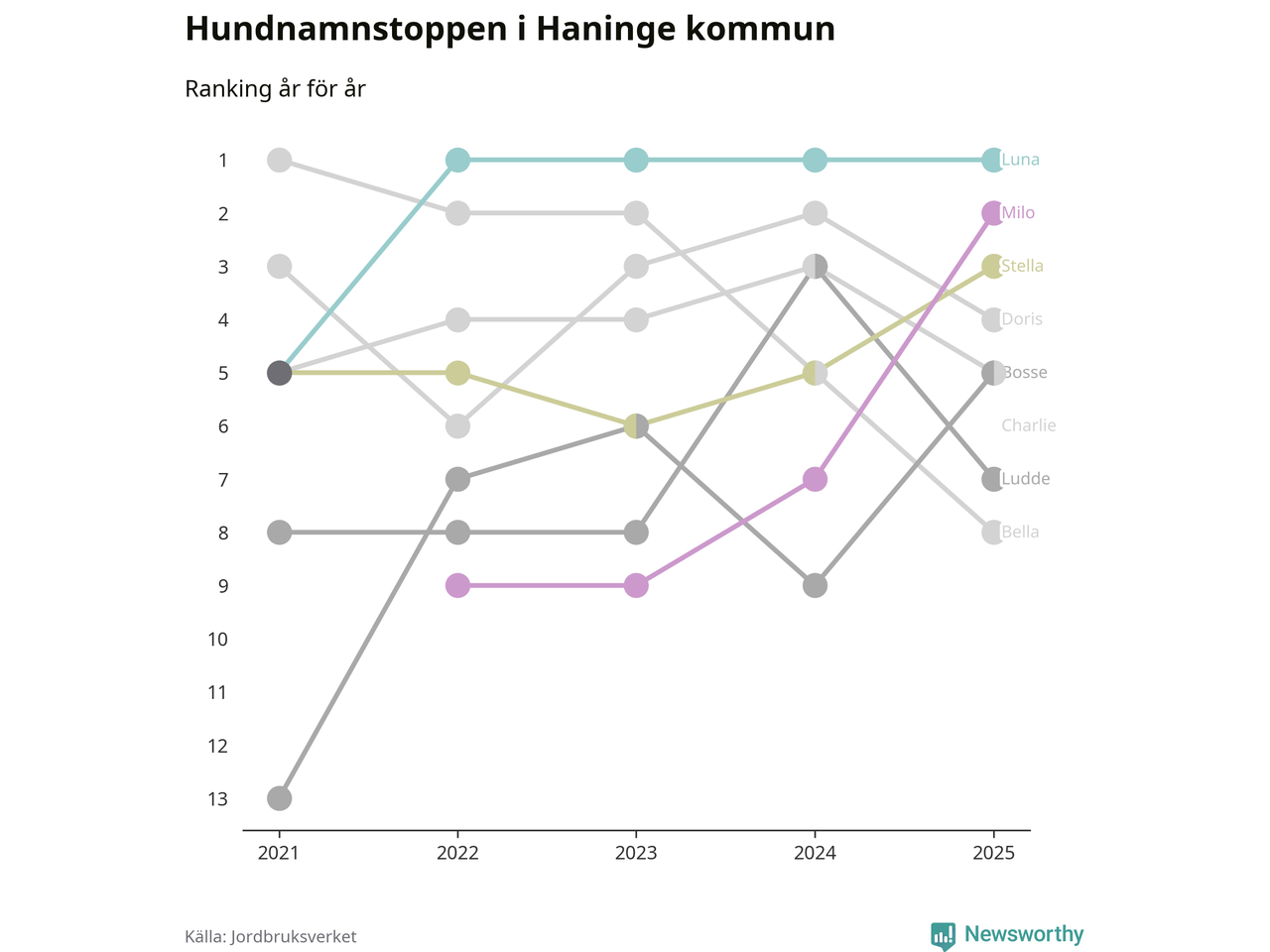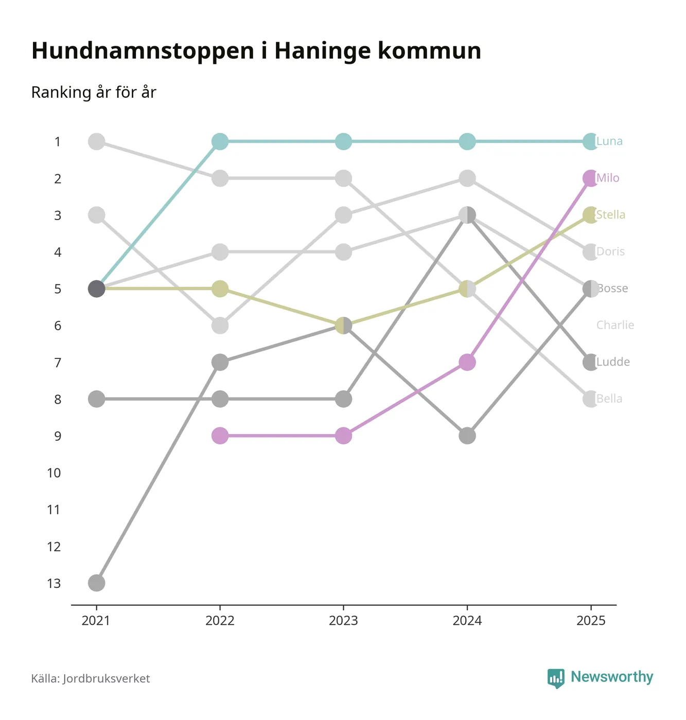 Molly är fortsatt ohotad etta bland hundnamnen i Sverige, följt av Bella och Charlie. Så har det sett ut flera år i rad, men bland Haningehundarna är Luna populärast. Haninge är en av elva kommuner i landet där Luna är vanligast, eller på delad förstaplats.