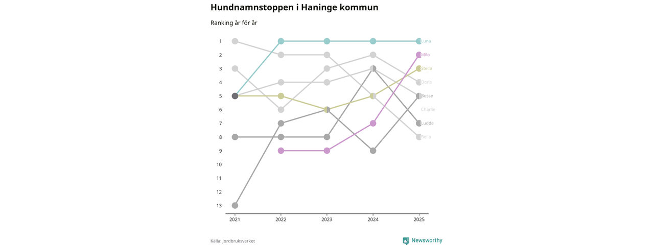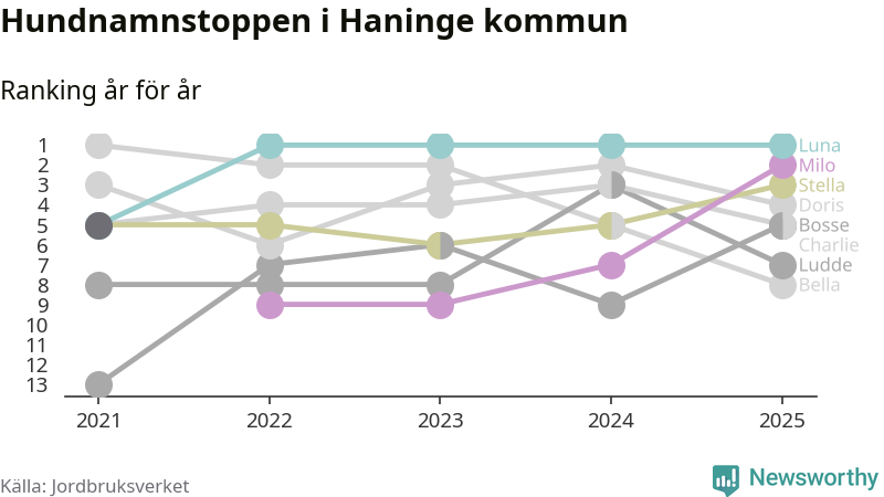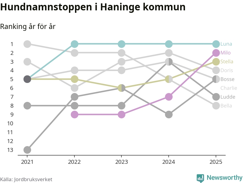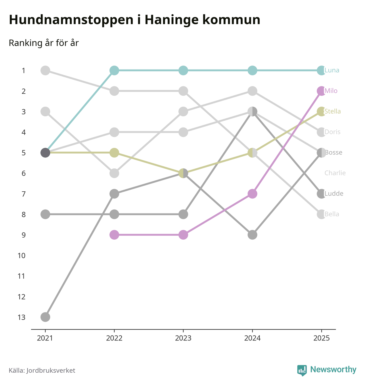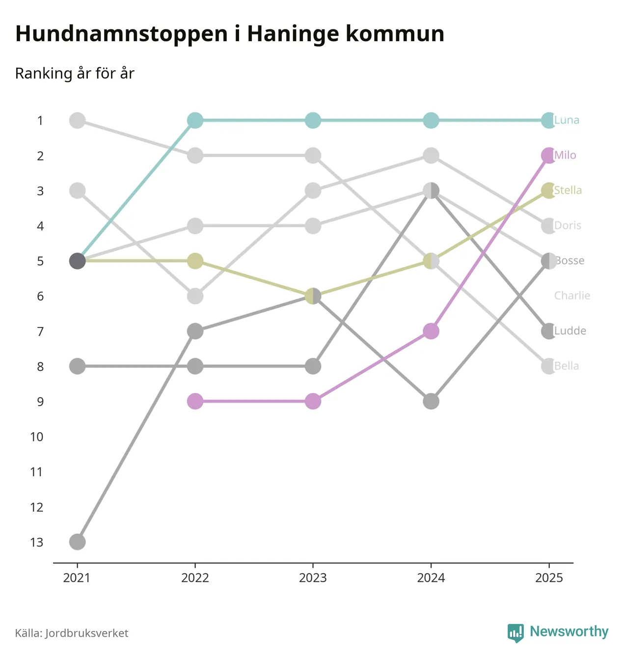 Molly är fortsatt ohotad etta bland hundnamnen i Sverige, följt av Bella och Charlie. Så har det sett ut flera år i rad, men bland Haningehundarna är Luna populärast. Haninge är en av elva kommuner i landet där Luna är vanligast, eller på delad förstaplats.