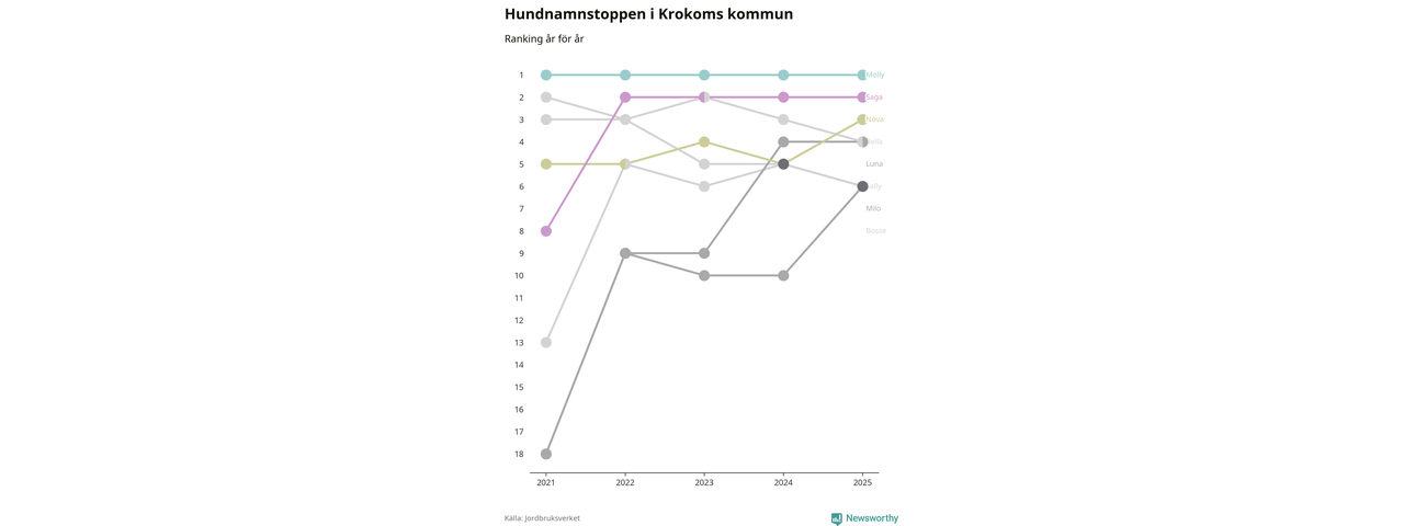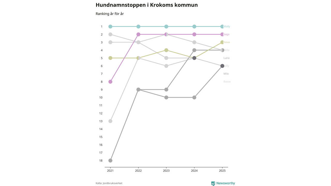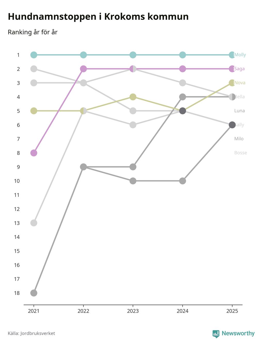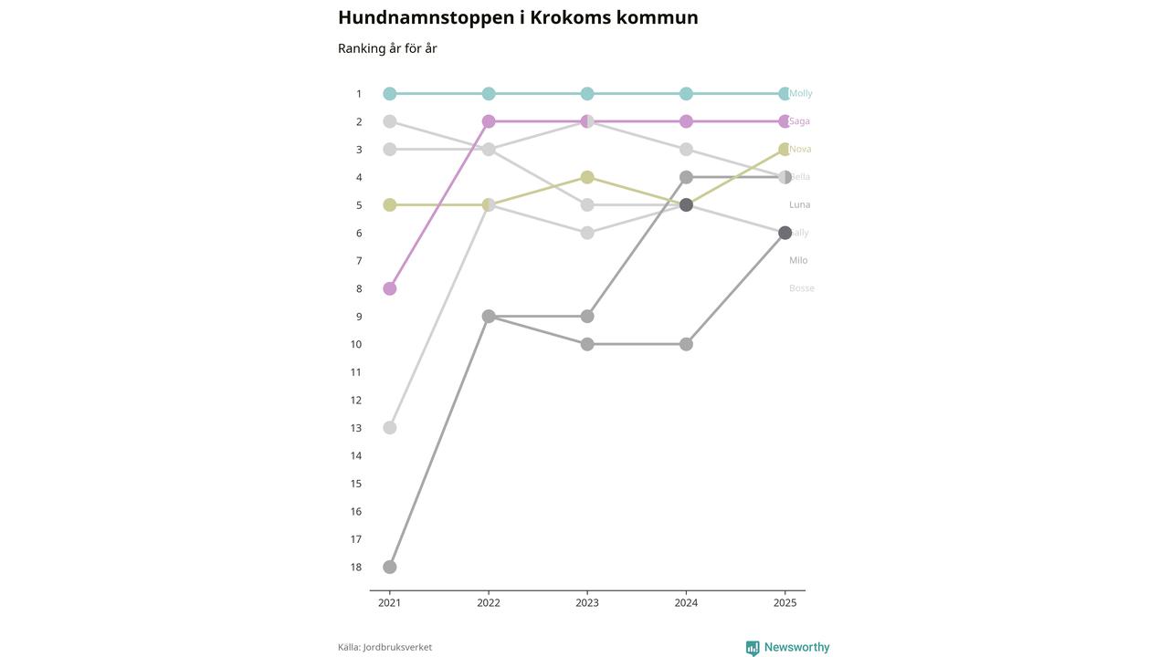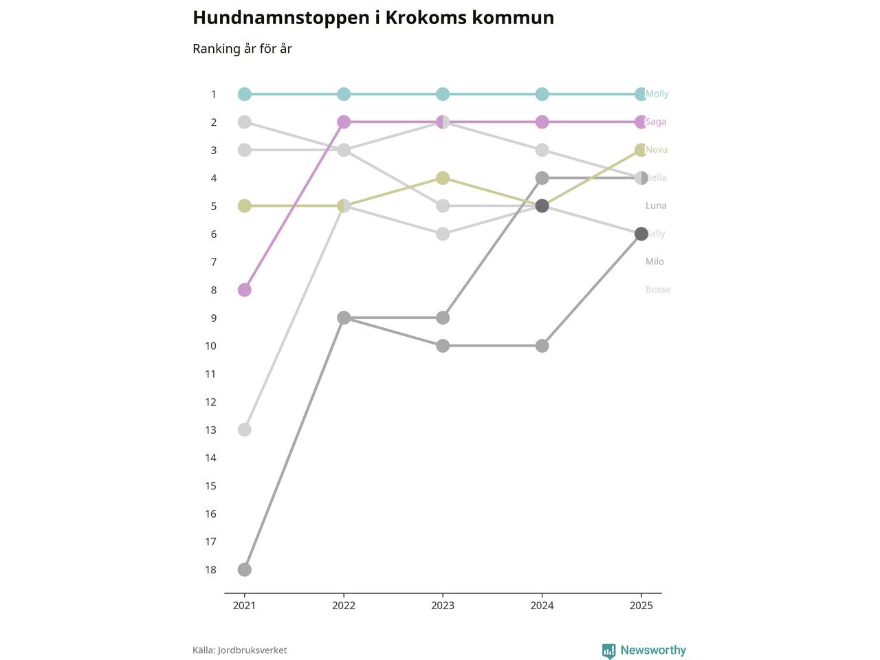 Molly toppar hundnamnsligan i Krokoms kommun, precis som i landet som helhet. Det visar färsk statistik från Jordbruksverket. Här finns hela topplistan för kommunen.